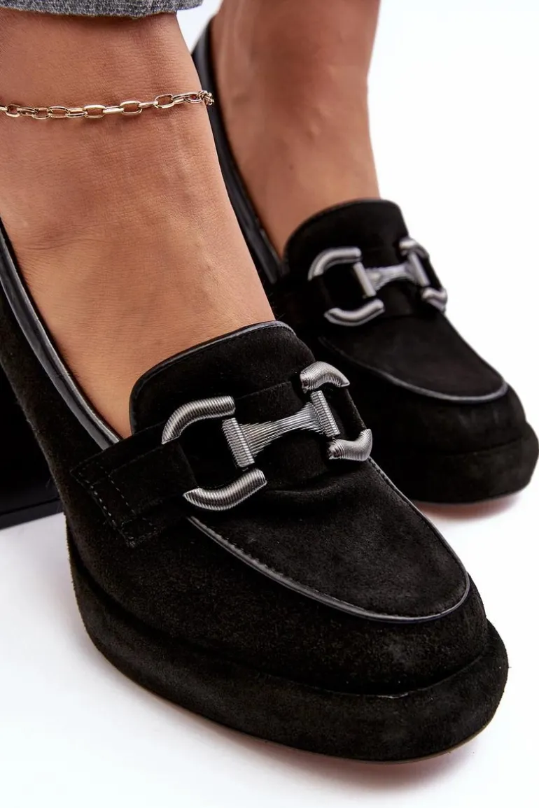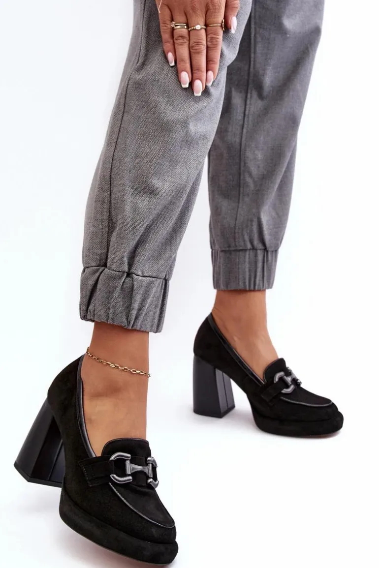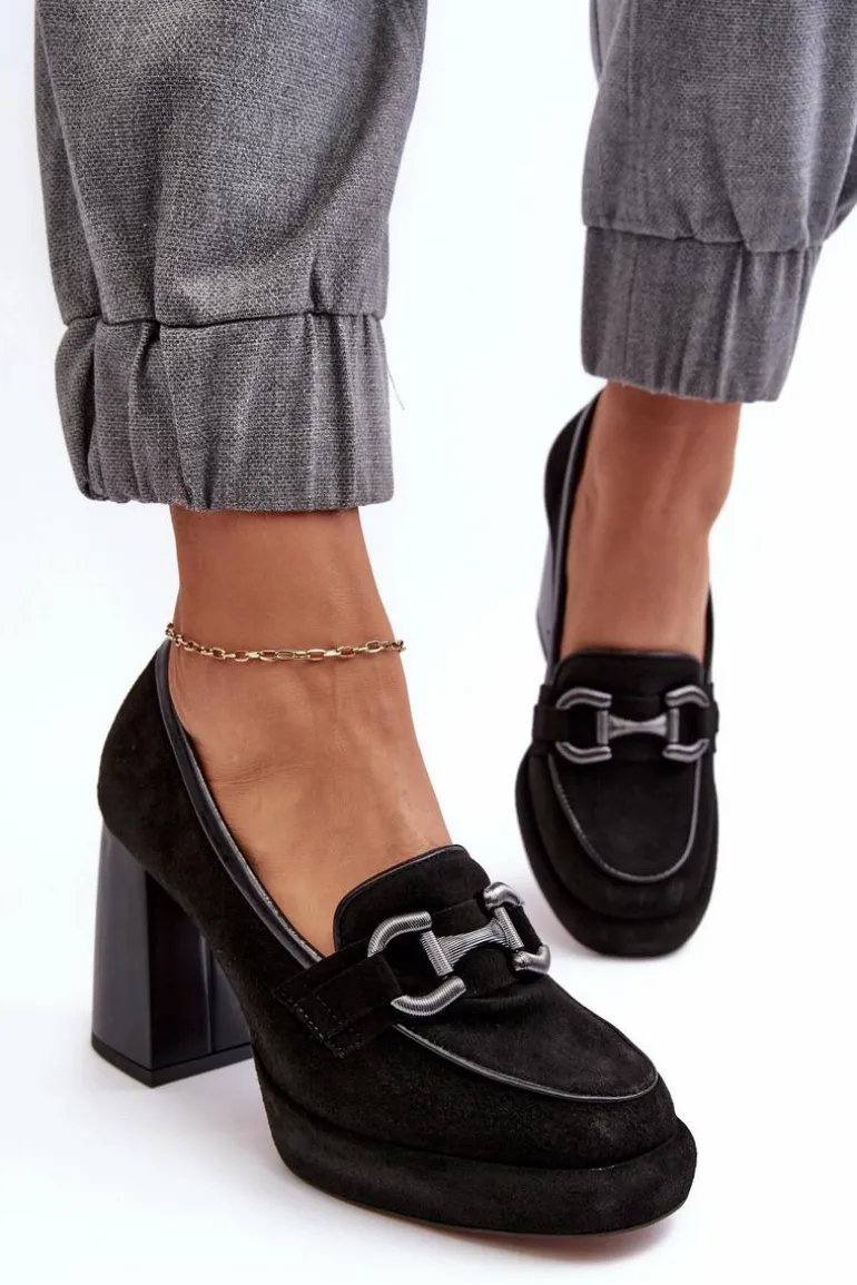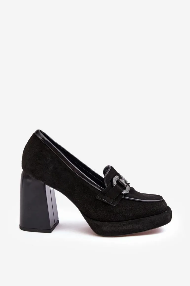 Czółenka damskie wykonane zostały z wysokiej jakości naturalnej skóry. Osadzone na platformie i masywnym obcasie w postaci słupka. Miękka, skórzana wkładka zapewni komfort podczas użytkowania. Noski zaokrąglone. Zapiętek usztywniony. Z przodu ozdoba z tworzywa sztucznego. Przy wyborze rozmiaru prosimy sugerować się tabelą rozmiarów.