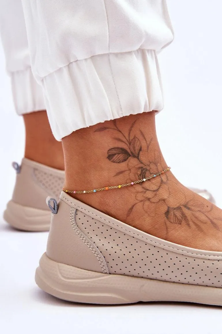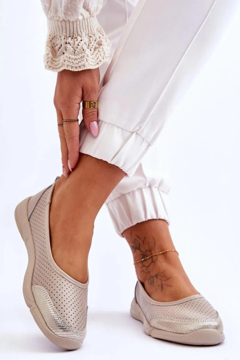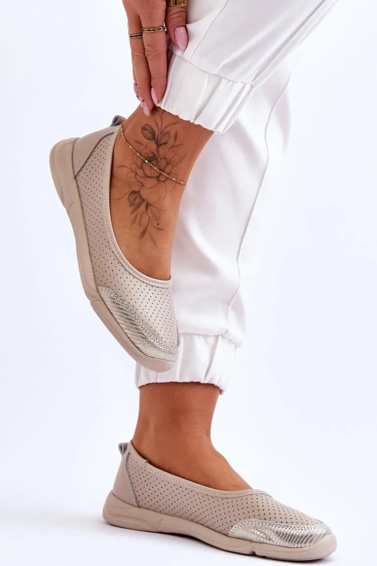 Modne, damskie balerinki idealnie sprawdzą się na wiele okazji. Wykonane z naturalnej skóry w ażurowy wzorek. Posiadają miękką, skórzaną wkładkę, która zapewni komfort podczas użytkowania. Niezwykle lekki model. Taki fason obuwia powinien znaleźć się w każdej garderobie! Niski obcas zapewni stabilność w każdej sytuacji. Przy wyborze rozmiaru prosimy sugerować się tabelą rozmiarów.