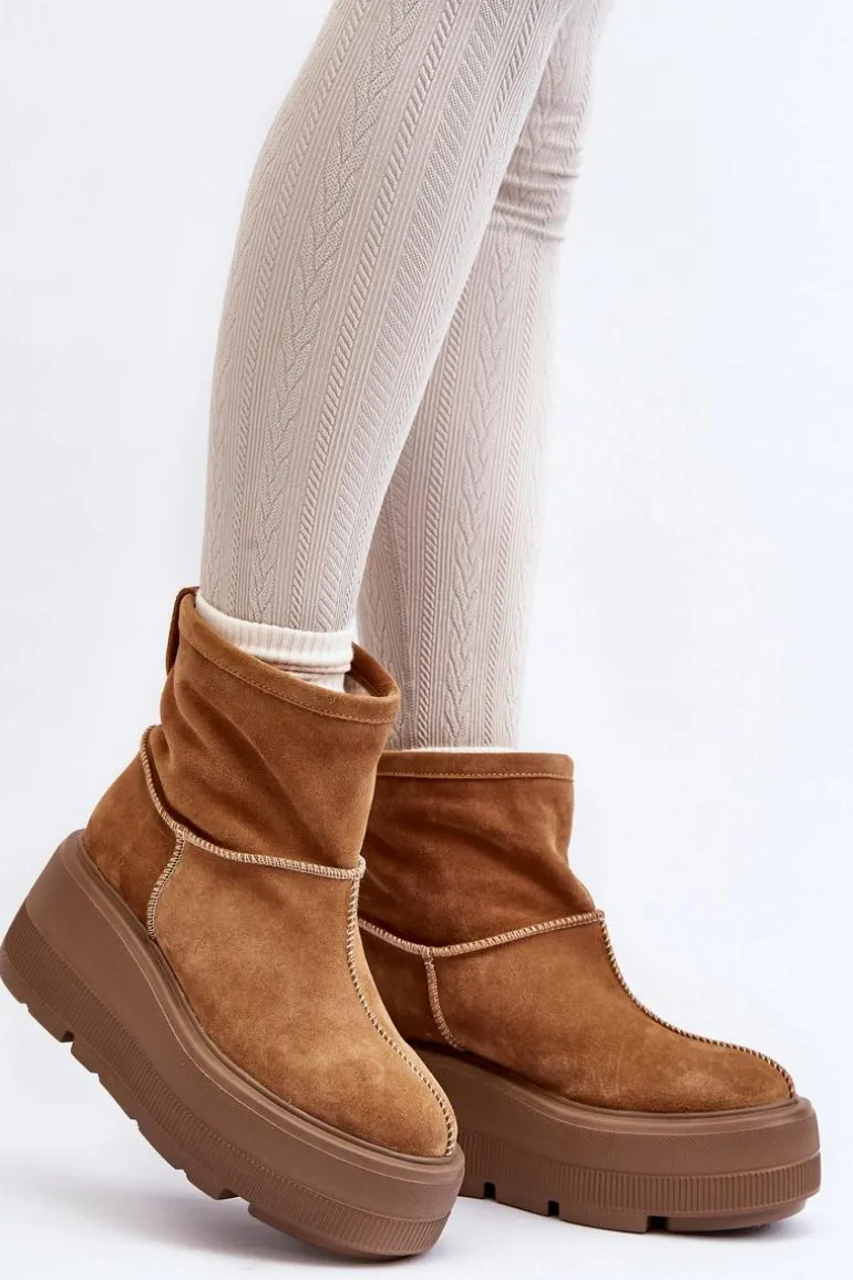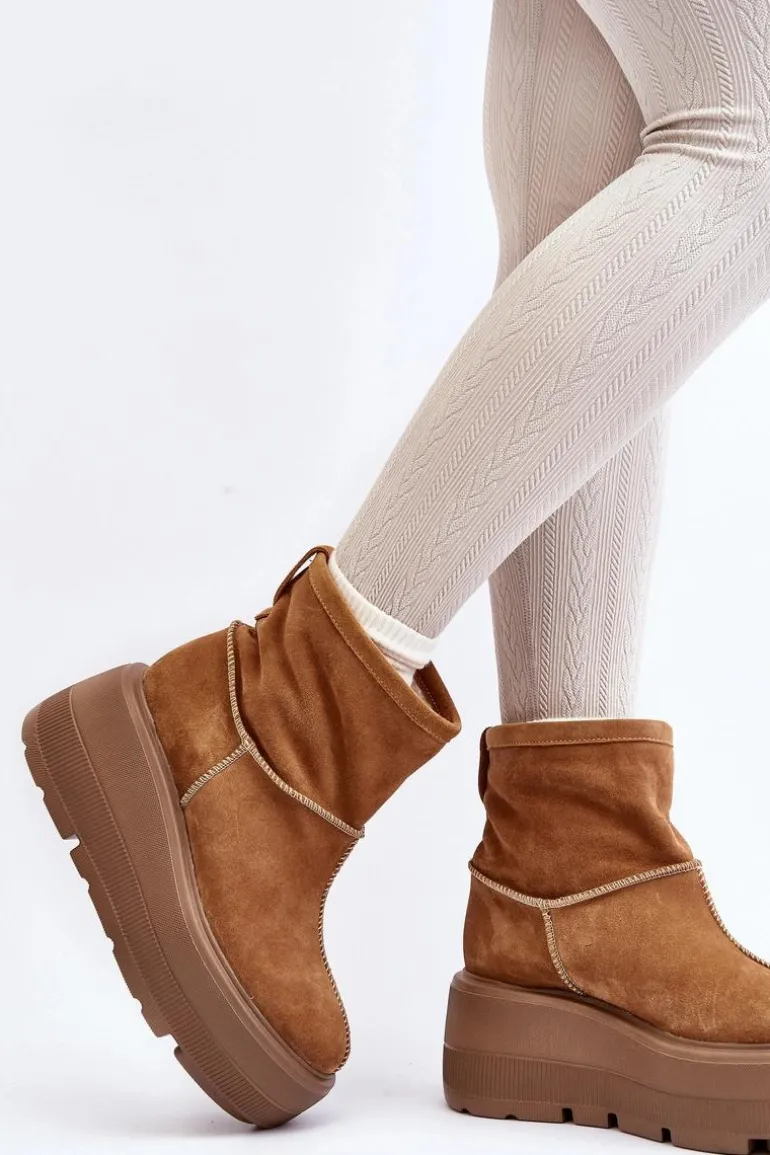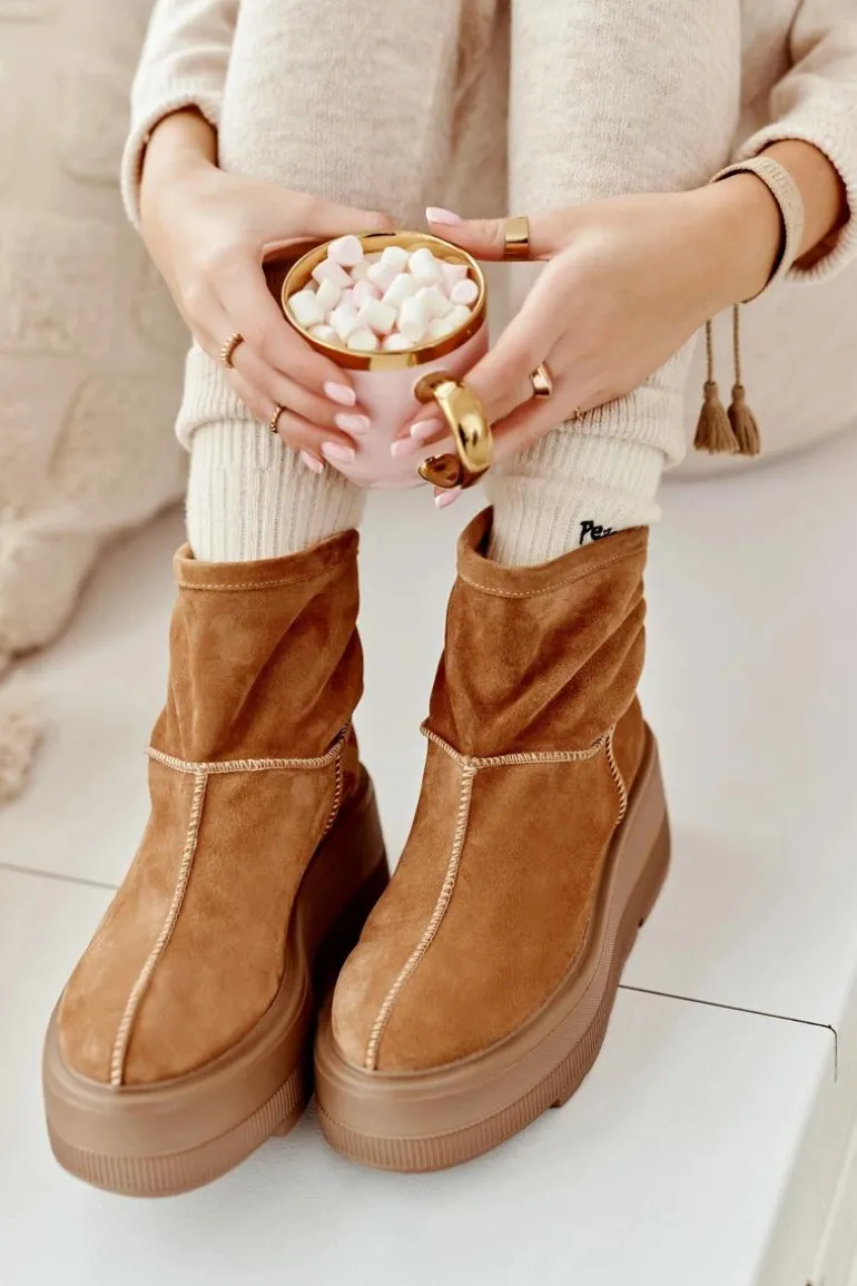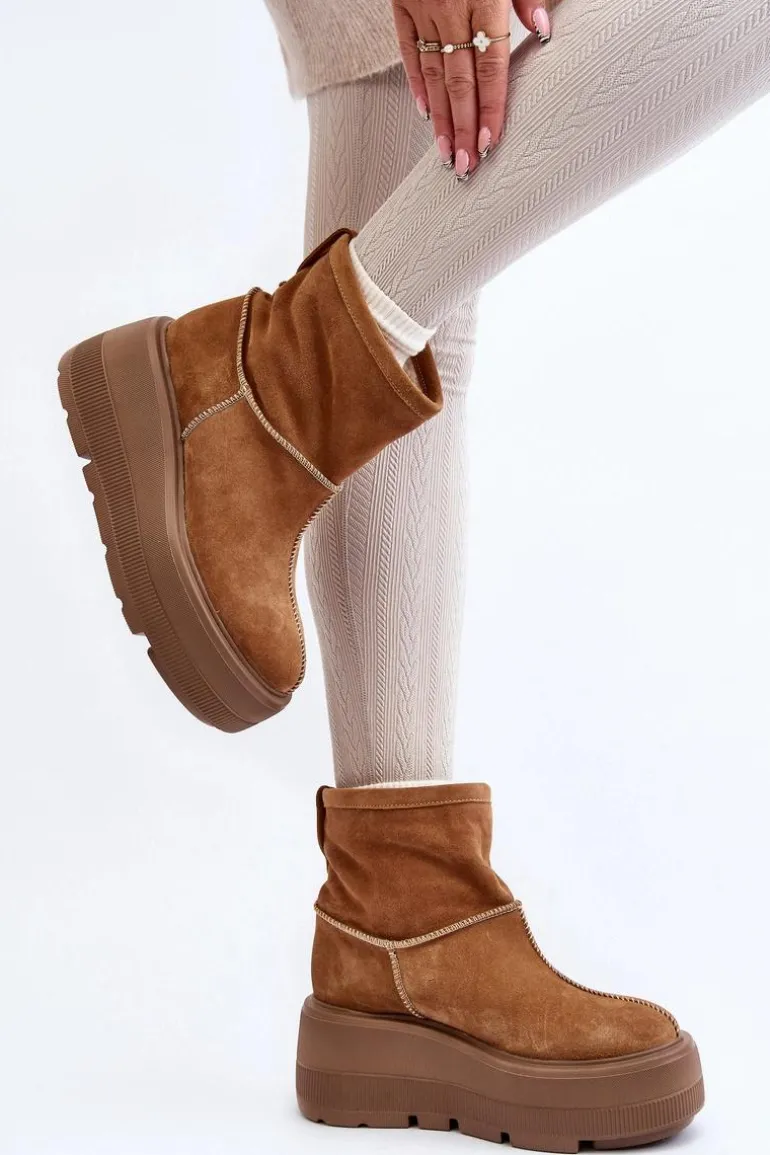 Botki damskie wykonane ze skóry naturalnej. Osadzone na masywnej podeszwie. Model wsuwany, z cholewką za kostkę. Środek ocieplony kożuszkiem. Noski zaokrąglone. Miękka wkładka zapewni wygodę podczas użytkowania. Koniecznie musisz je mieć! Przy wyborze rozmiaru prosimy sugerować się tabelą rozmiarów.