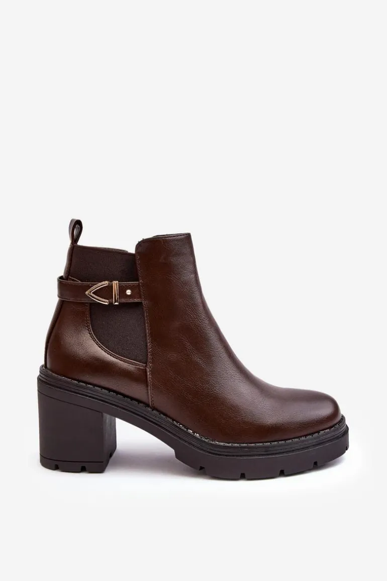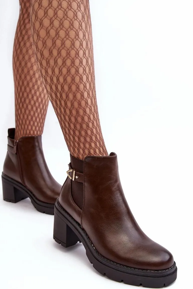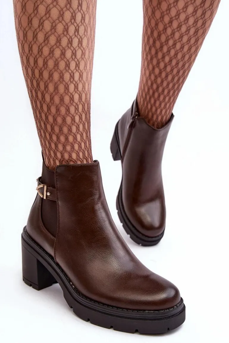 Damskie botki zostały wykonane z eko skóry. Osadzone na obcasie w postaci stabilnego, masywnego słupka. Cholewka została ozdobiona paskiem oraz elastyczną gumą pozwalającą na odpowiednie dopasowanie obuwia do tęgości nogi. Wewnątrz botki nie posiadają ocieplenia. Dodatkowo zapiętek jest usztywniony. Model ten posiada suwak z boku cholewki. Przy wyborze rozmiaru prosimy sugerować się tabelą rozmiarów.