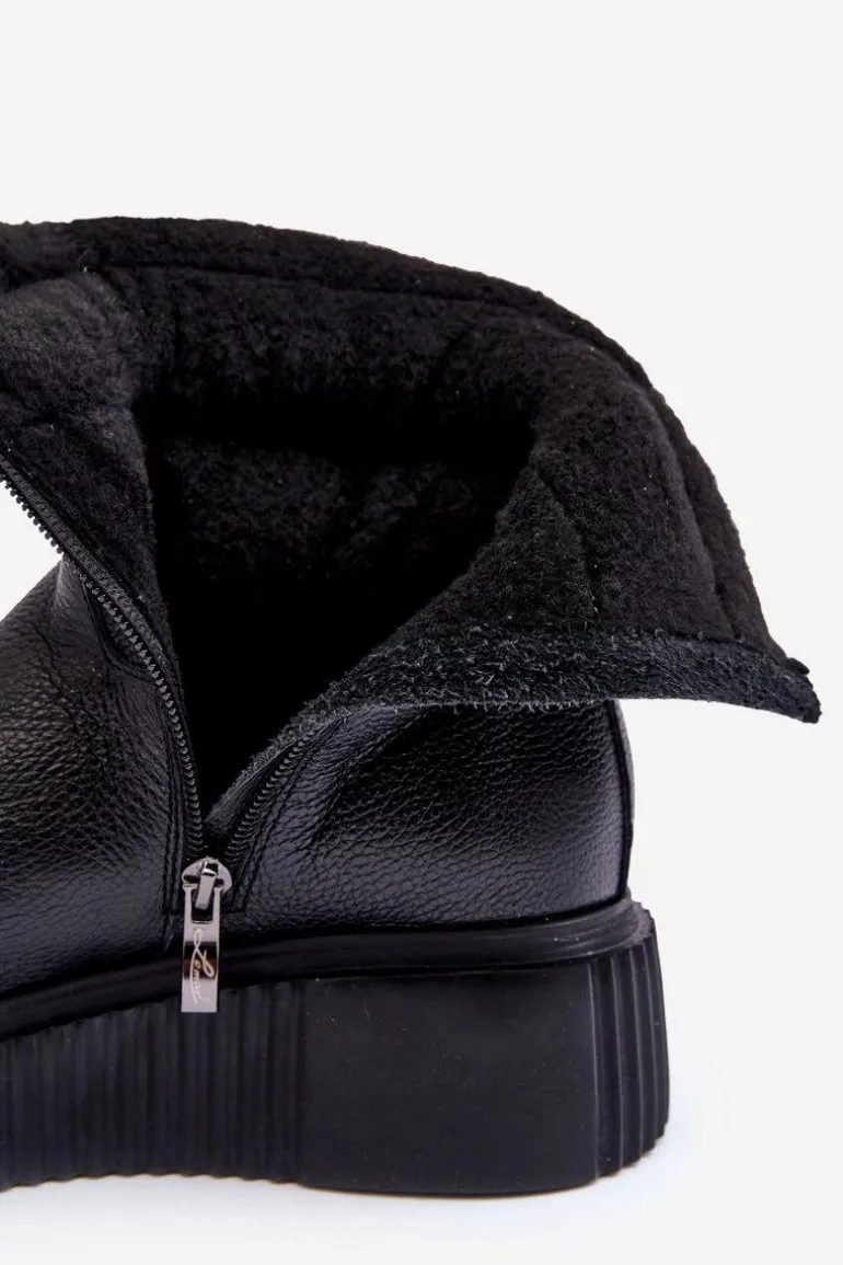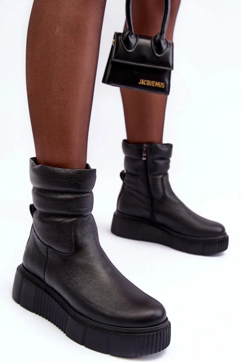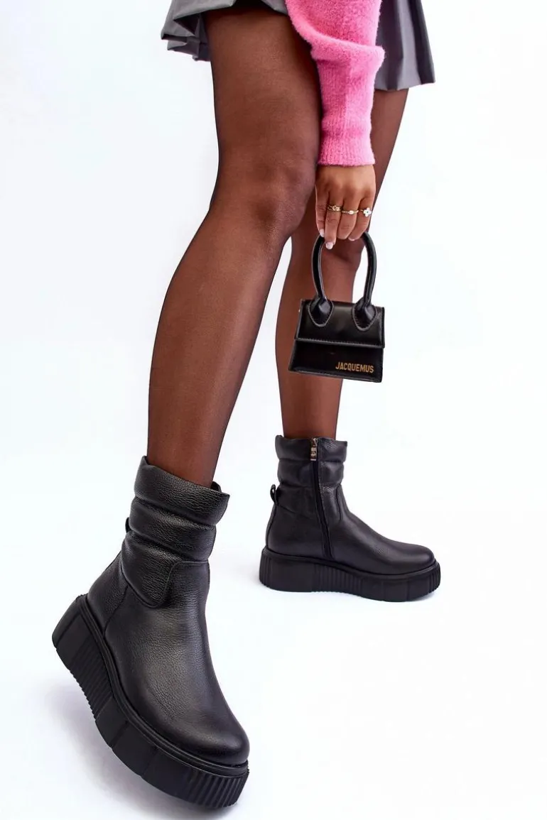 Botki damskie zostały wykonane z wysokiej jakości naturalnych skór. Zapinane z boku cholewki na suwak. Osadzone na masywnej platformie z delikatnym koturnem. Ocieplone w środku kocem obuwniczym. Noski zaokrąglone. Model ten na pewno sprawdzi się w wielu jesiennych stylizacjach! Przy wyborze rozmiaru prosimy kierować się tabelą rozmiarów