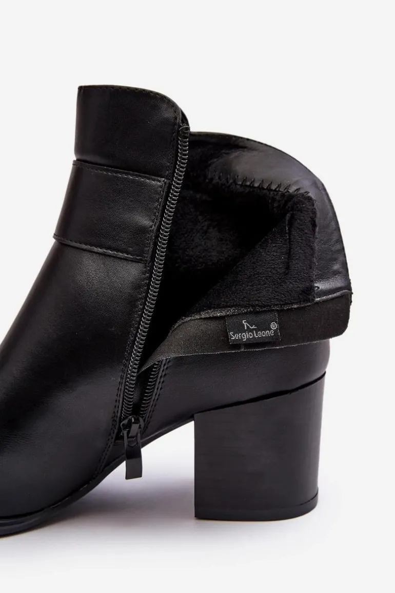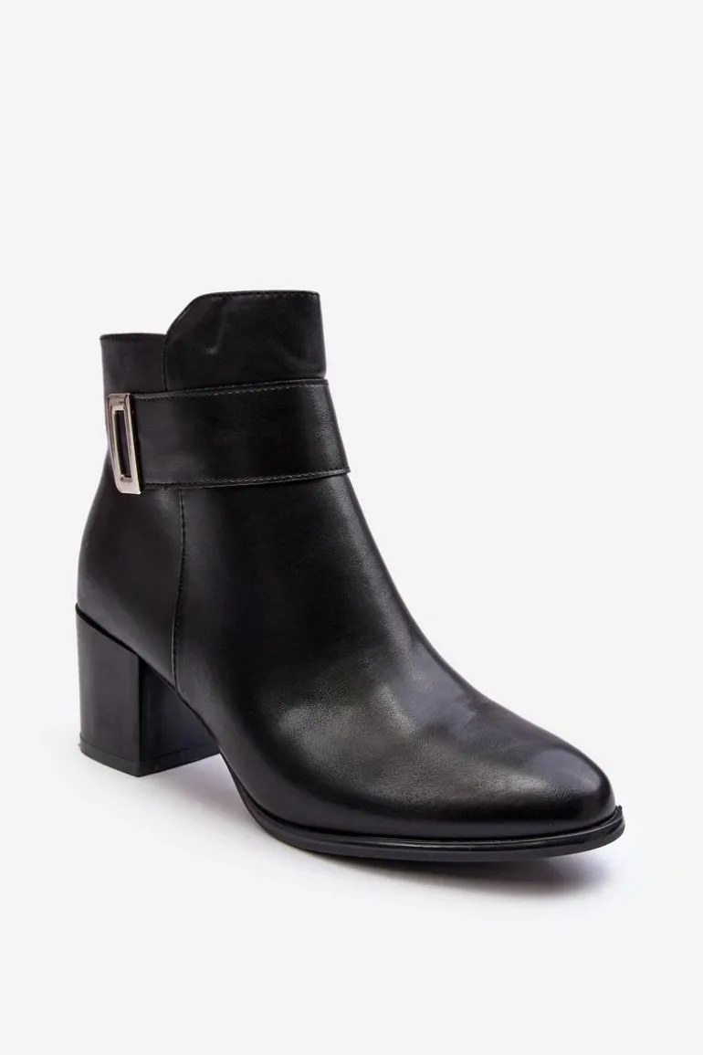 Damskie botki wykonane z eko skóry. Ocieplone kocem obuwniczym. Osadzone na obcasie w postaci niskiego słupka. Noski zaokrąglone. Usztywniony zapiętek. Cholewka ozdobiona paskiem. Model ten zapinany jest na suwak z boku. Środek ocieplony kocem obuwniczym. Zapiętek jest usztywniony. Koniecznie musisz je mieć! Przy wyborze rozmiaru prosimy sugerować się tabelą rozmiarów.