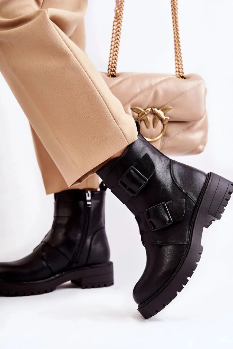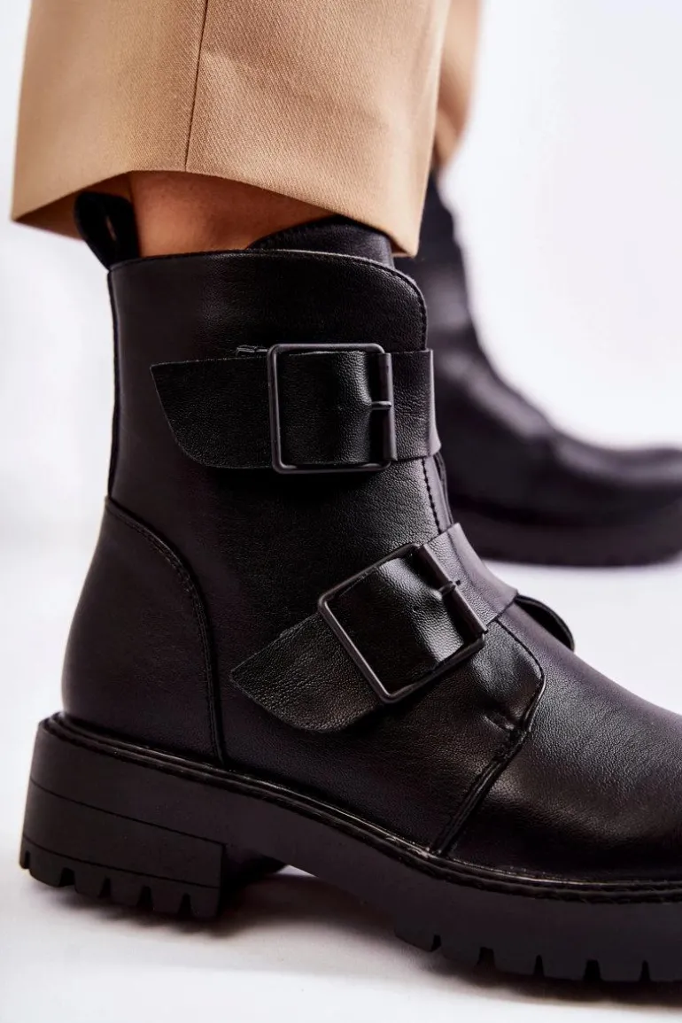Klasyczne botki damskie zostały wykonane z eko skóry. Posiadają ozdobne paski z klamrami na boku cholewki. Model zapinany na suwak. Osadzone na płaskim obcasie oraz platformie wraz ze żłobieniem. Botki są ocieplane w środku kocem obuwniczym. Posiadają usztywniany zapiętek. Modne obuwie, które świetnie sprawdzi się do pracy, szkoły. Przy wyborze rozmiaru prosimy sugerować się tabelą rozmiarów.