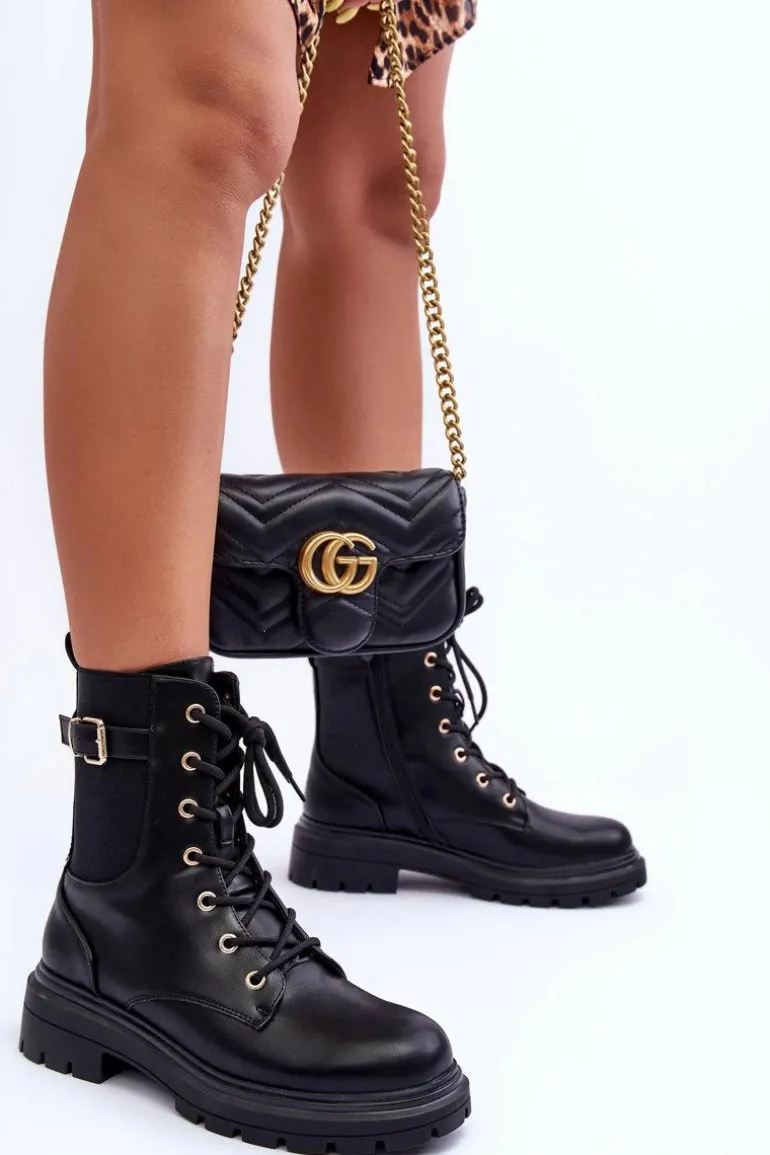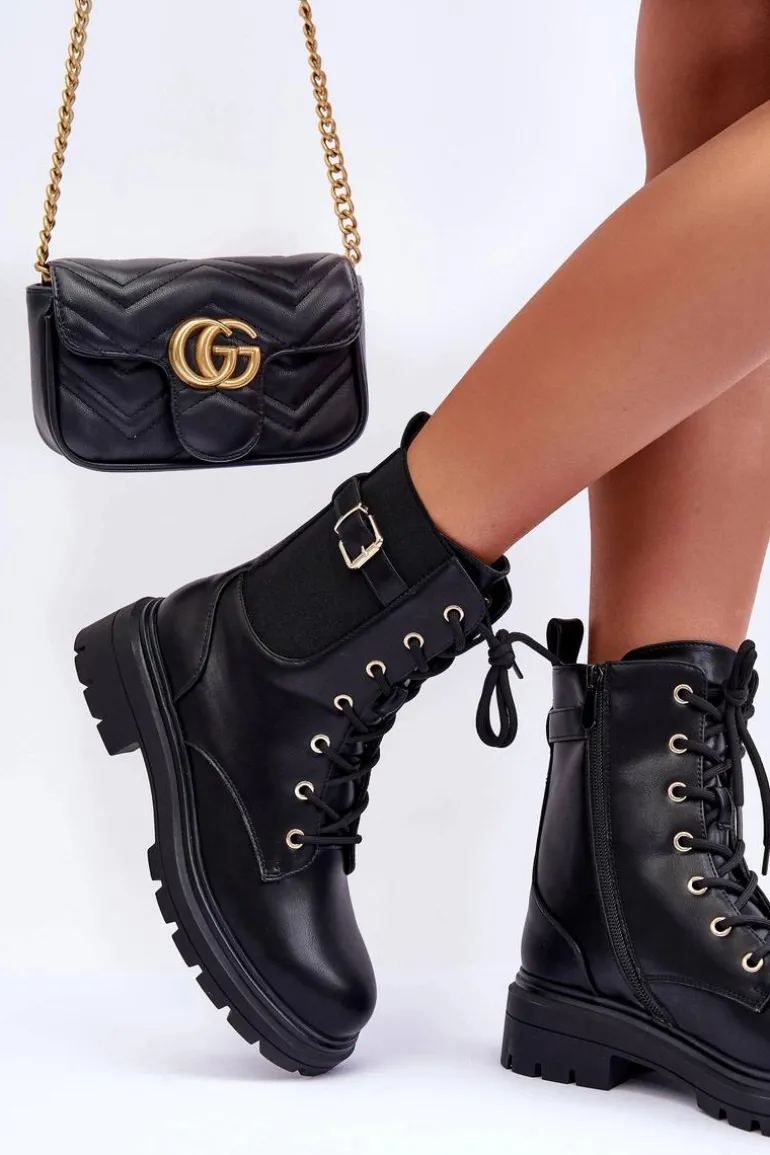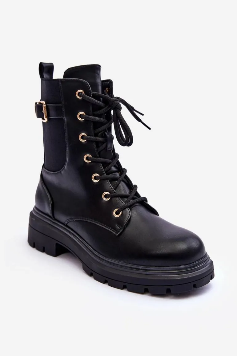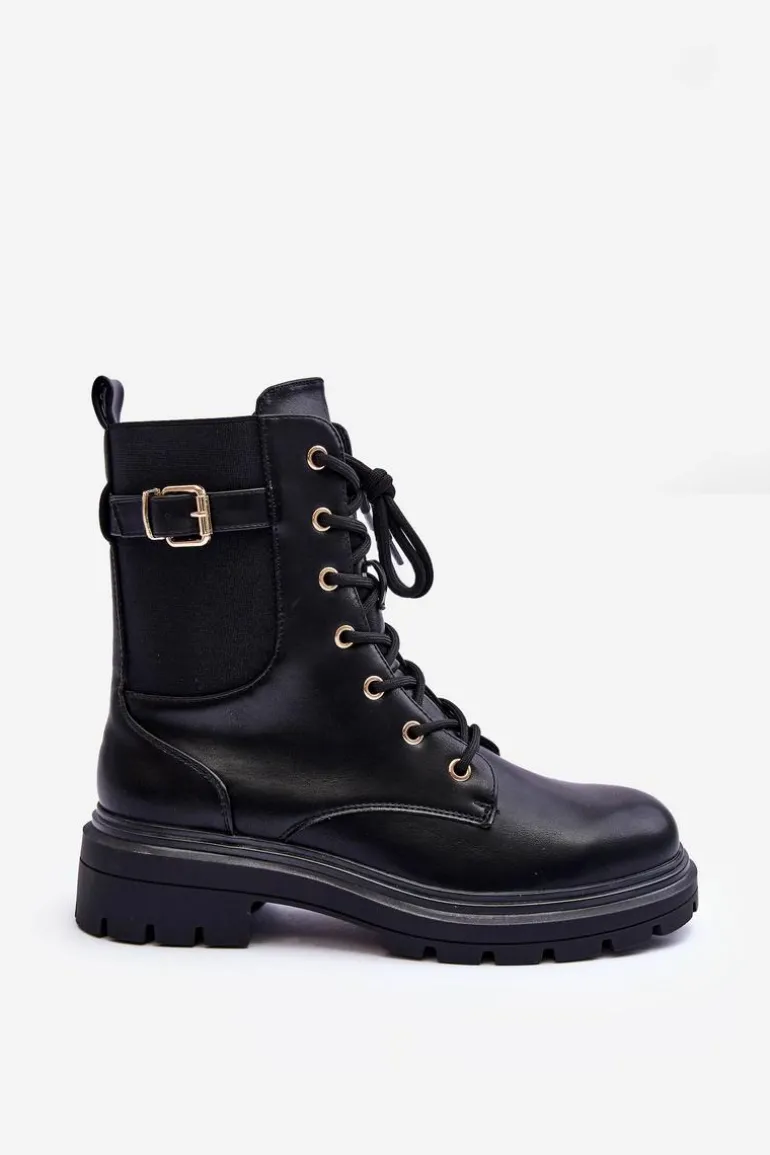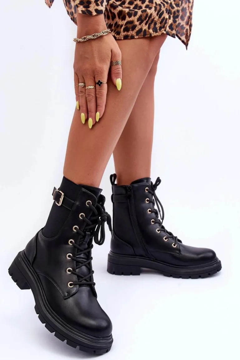 Modne botki wykonane z eko skóry. Osadzone na płaskim obcasie i platformie. Zapinane są z boku cholewki na zamek oraz dodatkowo sznurowane. Model ten posiada ozdobę w postaci paska ze sprzączką. Zapiętek w tym obuwiu jest usztywniany. Świetny model do jesiennych i zimowych stylizacji! Przy wyborze rozmiaru prosimy sugerować się tabelą rozmiarów.