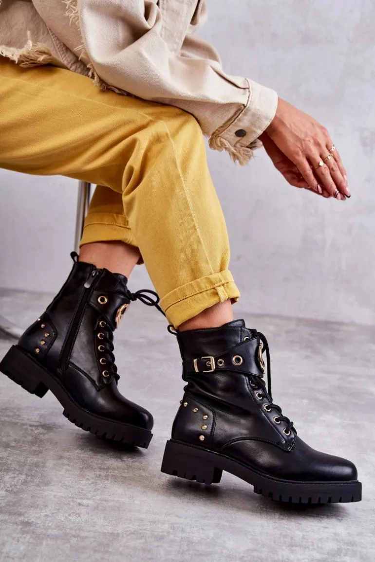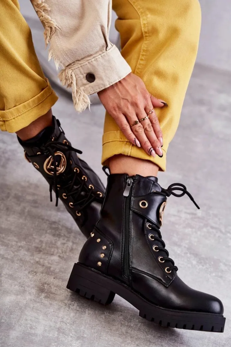Modne damskie botki świetnie sprawdzą się podczas jesiennych stylizacji! Wykonane z eko skóry. Dodatkowo zostały przyozdobione ćwiekami oraz emblematem z tworzywa sztucznego. Botki posiadają klasyczne wiązanie oraz suwak. W środku znajduje się ocieplenie w postaci koca obuwniczego. Osadzone na płaskim obcasie oraz platformie. Przy wyborze rozmiaru prosimy sugerować się tabelą rozmiarów.