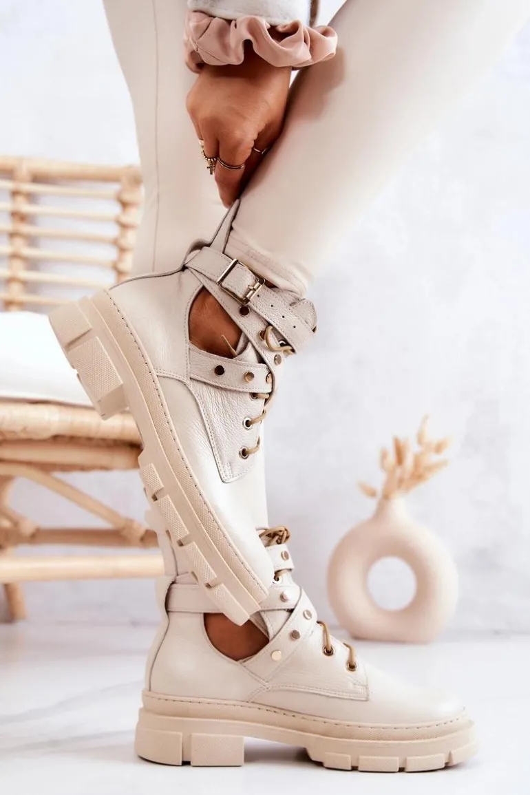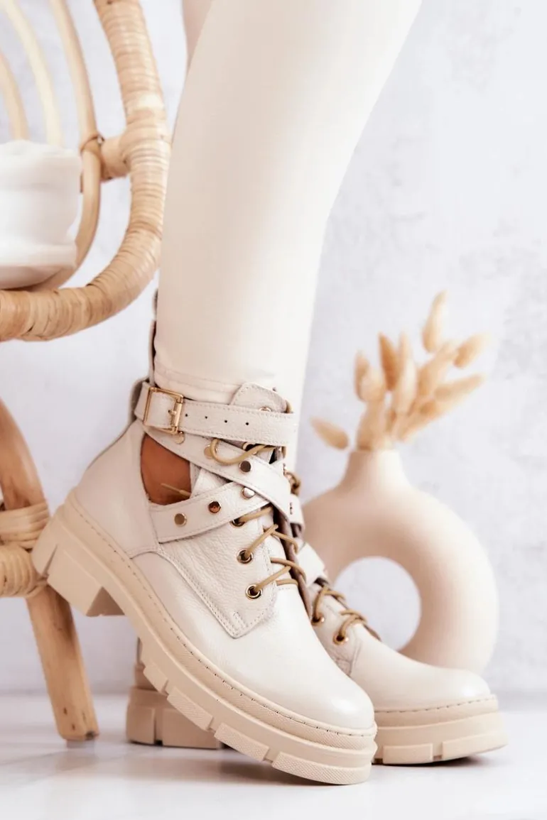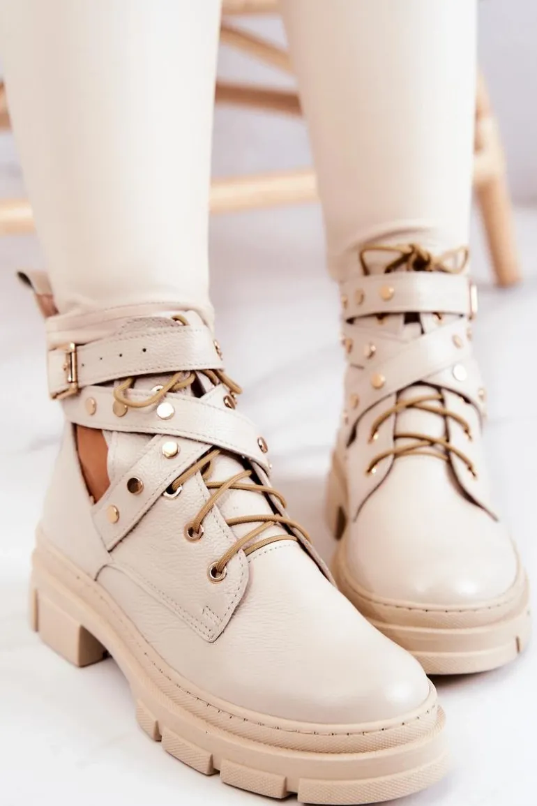 Cudowne, wiosenne botki zostały wykonane z naturalnej skóry. Posiadają paseczek ozdobiony ćwiekami, który jest zapinany u góry cholewki na sprzączkę. Dodatkowo botki te posiadają wiązanie, dzięki któremu możesz odpowiednio dopasować buty do tęgości nogi. Z tyłu cholewki znajduje się bootstrap, czyli pętelka za pomocą której możesz łatwiej zakładać bądź zdejmować obuwie. Buty posiadają masywną podeszwę chroniąca przed zimnym podłożem. Przy wyborze rozmiaru prosimy sugerować się tabelą rozmiarów.