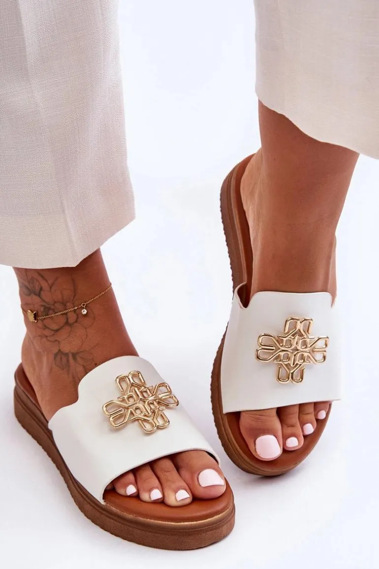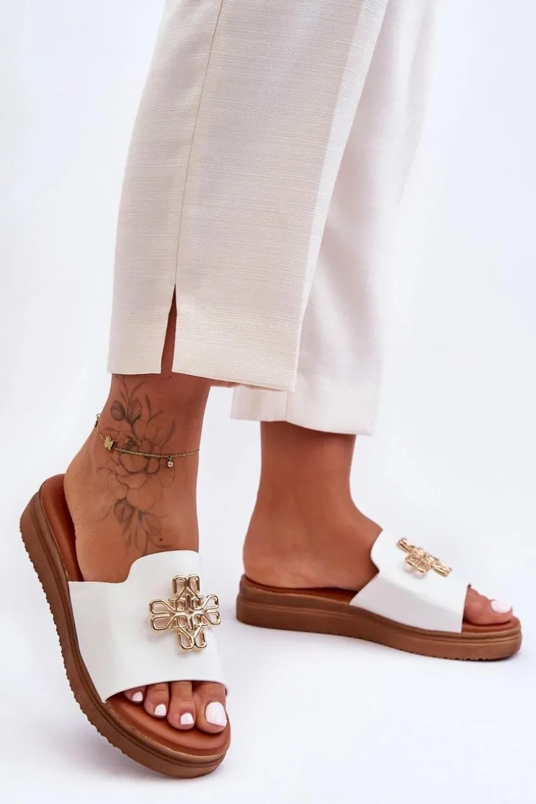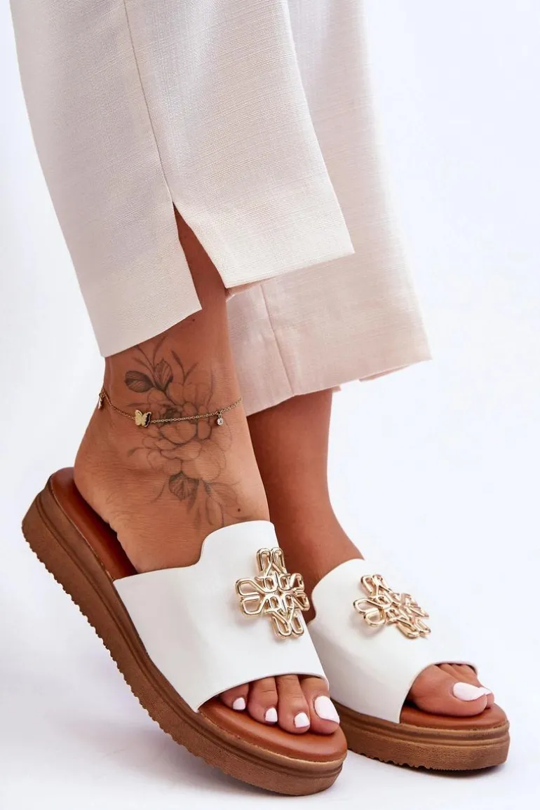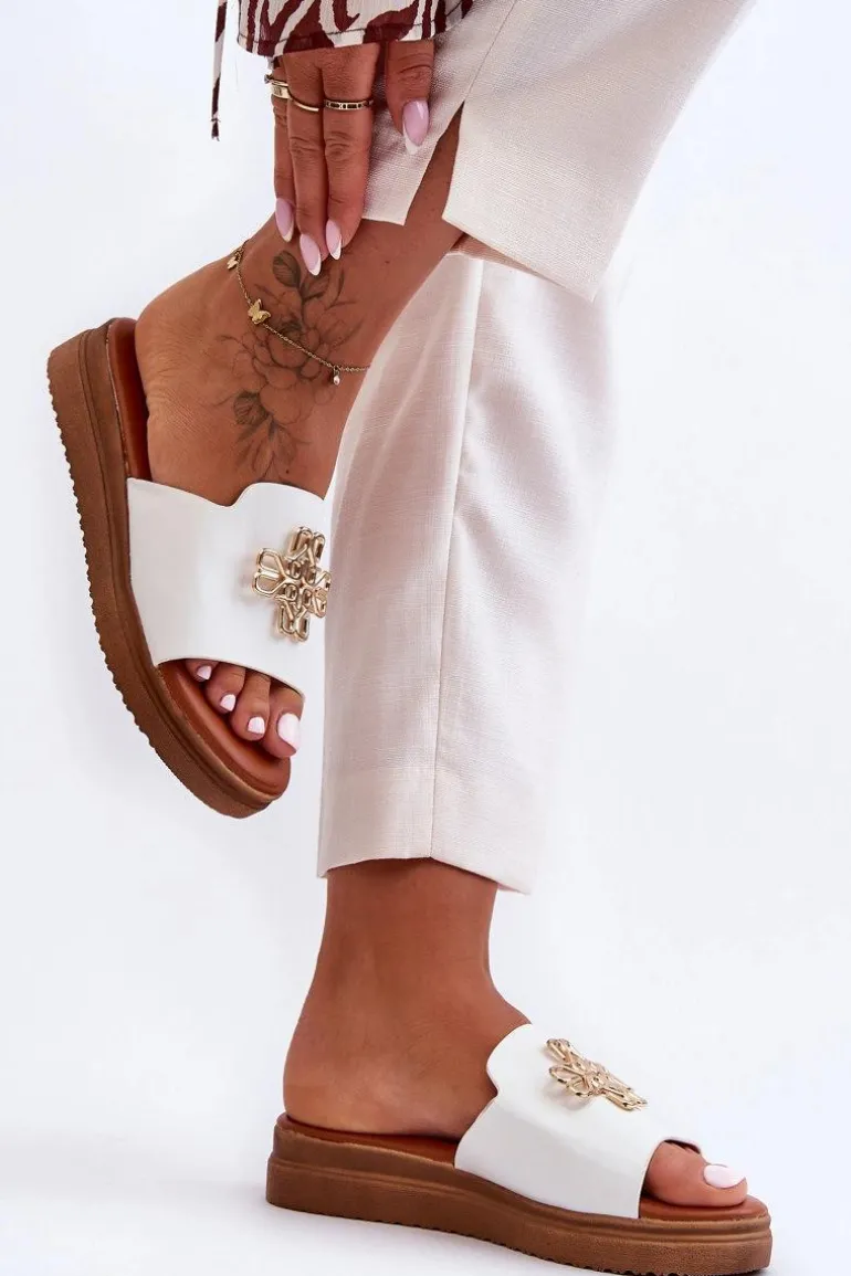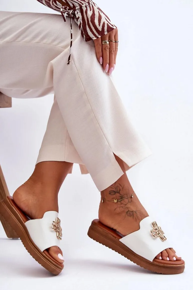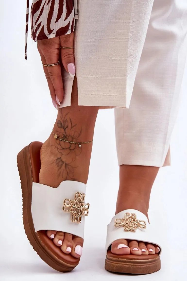 Skórzane Damskie Klapki Na Platformie z Ozdobą Białe Azera