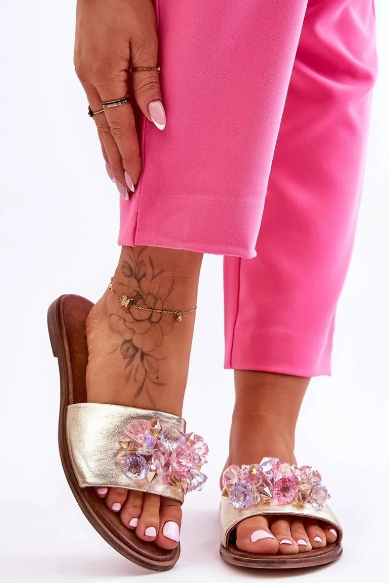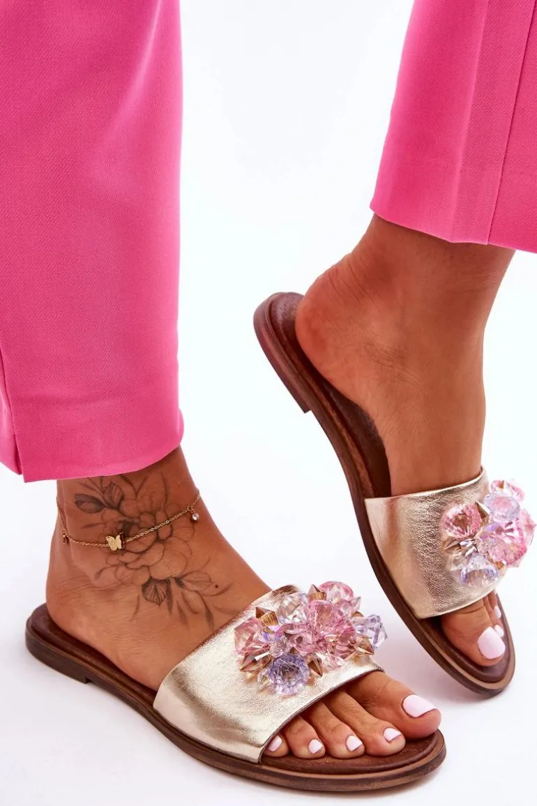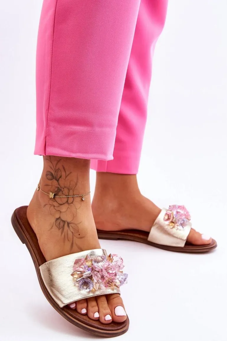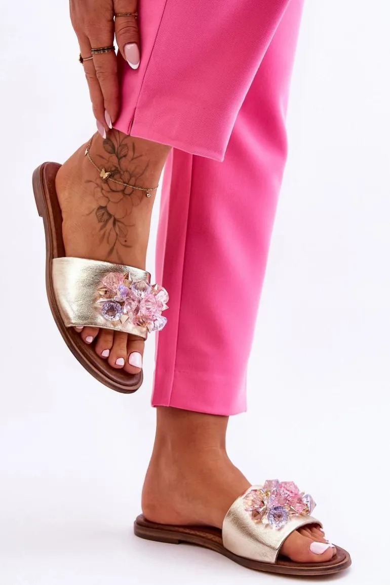 Skórzane Damskie Klapki Z Ozdobą Nicole 2726/064 Złote