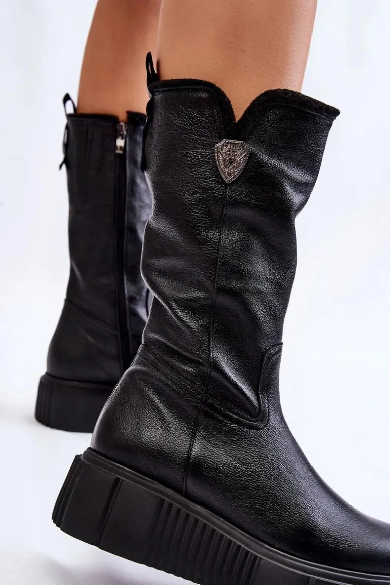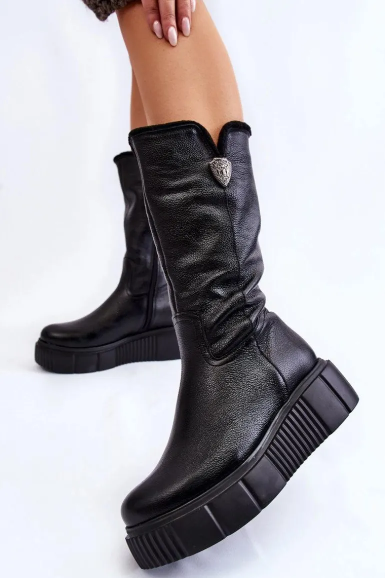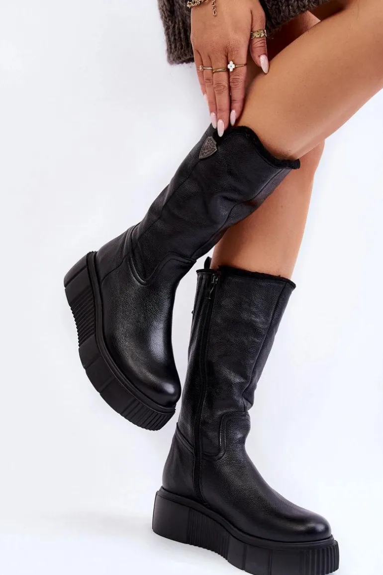 Damskie kozaki zostały wykonane z naturalnej skóry. Model ten posiada suwak z boku cholewki. Wnętrze zostało ocieplone naturalną wełną. Zapiętek jest usztywniany. Kozaki osadzono na masywnej platformie oraz koturnie. Posiadają ozdobny element z boku cholewki. Ten model świetnie sprawdzi się podczas chłodnych, zimowych dni. Przy wyborze rozmiaru prosimy sugerować się tabelą rozmiarów.