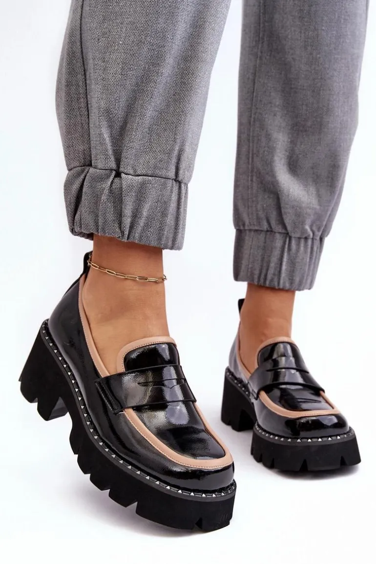 Damskie mokasyny zostały wykonane z eko skóry. Na przodzie posiadają ozdobny paseczek z wycięciem. Model ten został osadzony na płaskim obcasie i platformie, która dodatkowo została ozdobiona ćwiekami. Mokasyny posiadają wkładkę z naturalnej skóry. Ten model jest świetny na sezon wiosenno-jesienny! Przy wyborze rozmiaru prosimy sugerować się tabelą rozmiarów.
