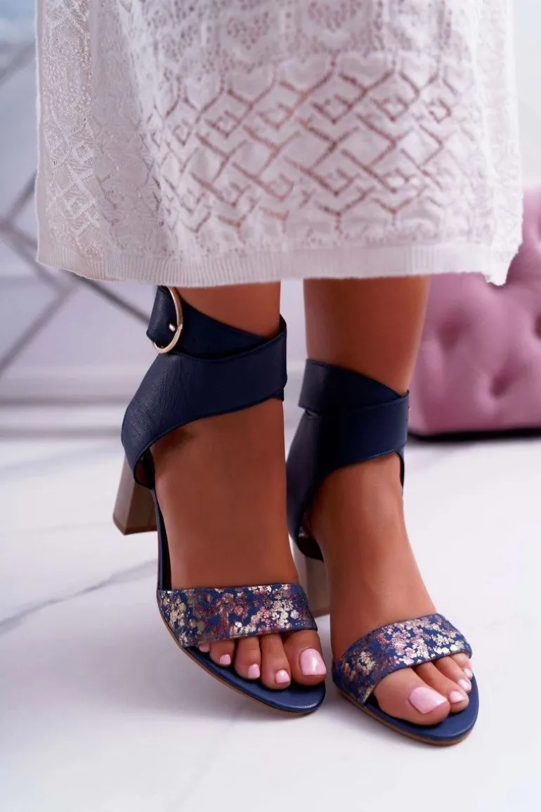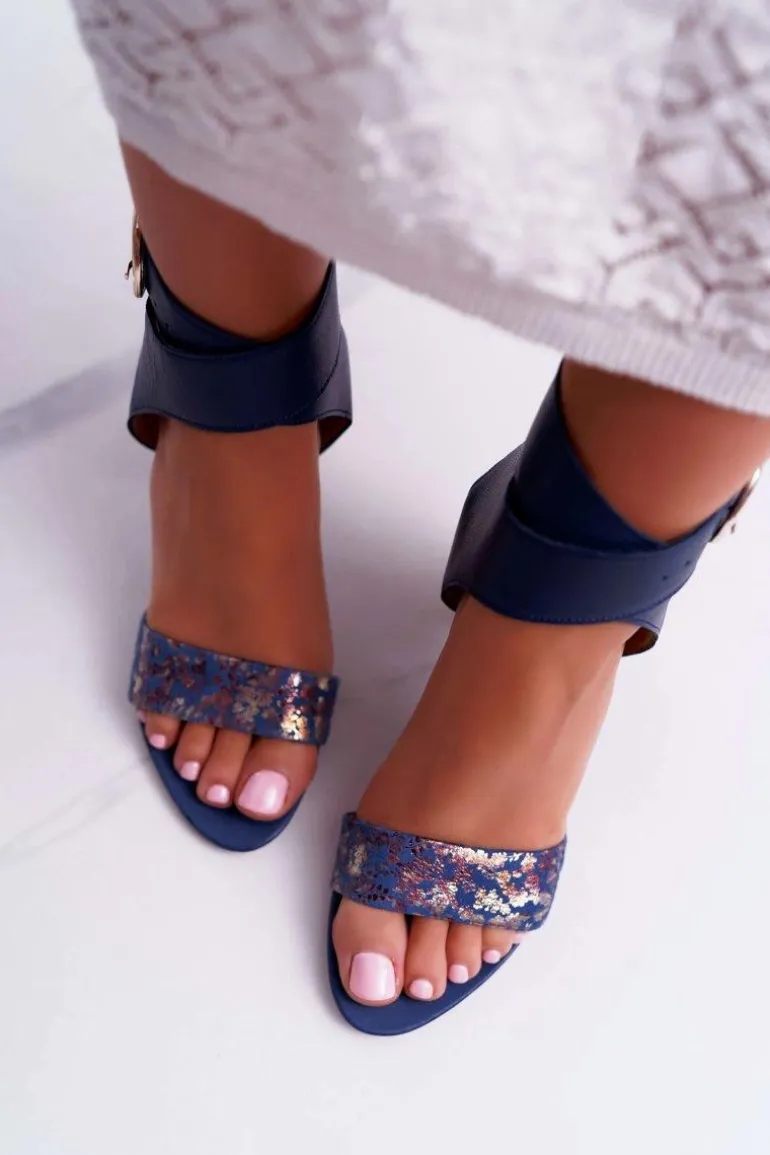 Skórzane Damskie Sandały Maciejka Na Słupku Granatowe 03597