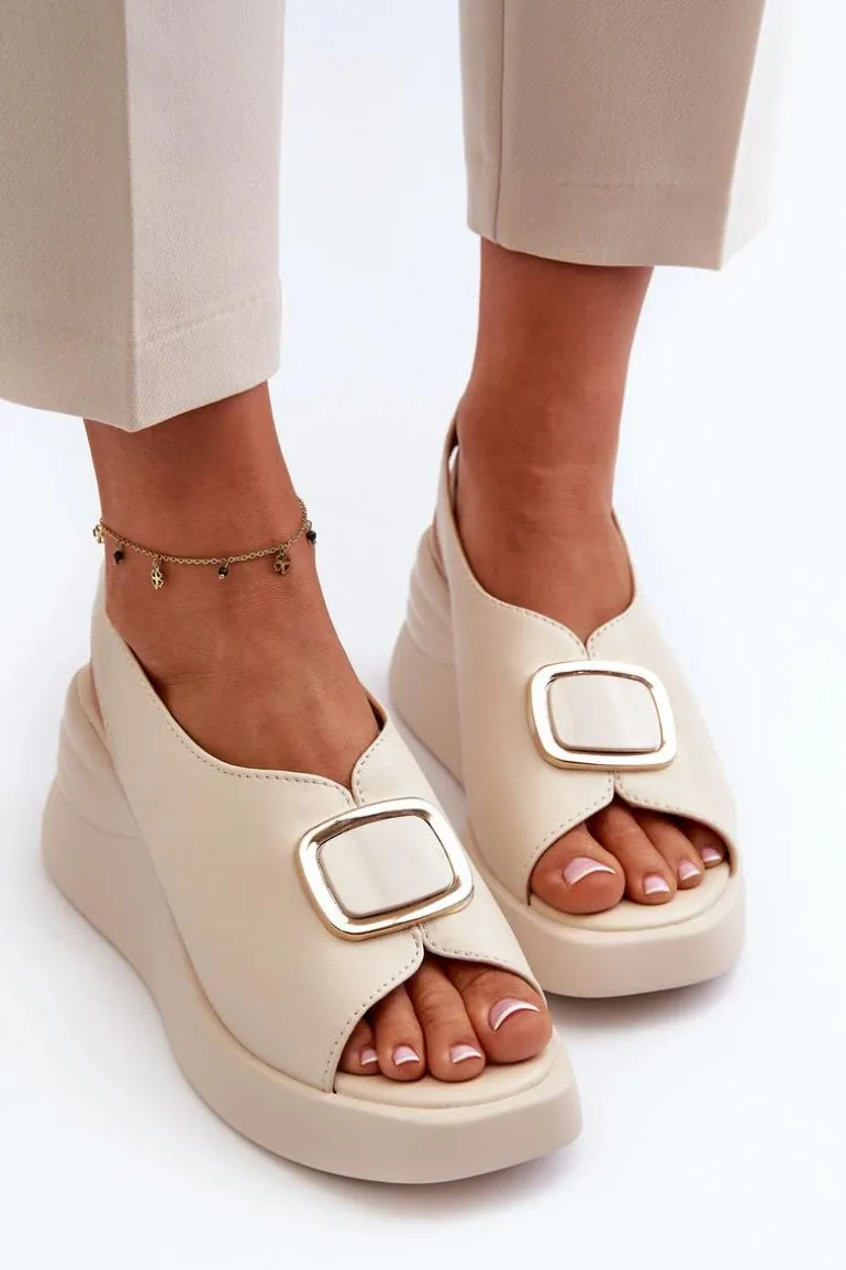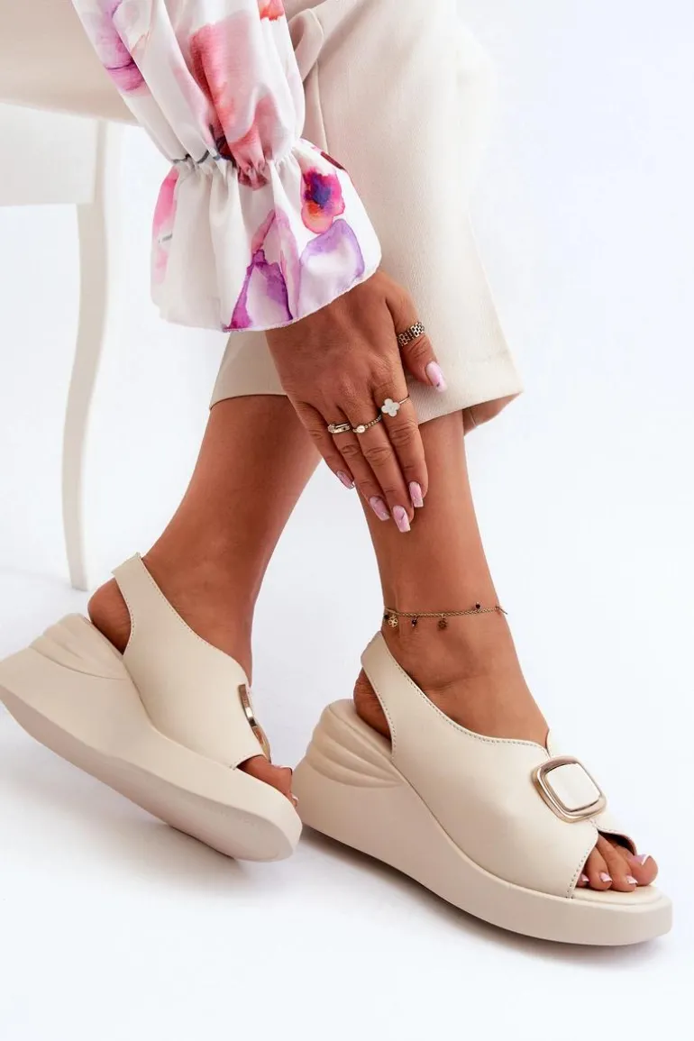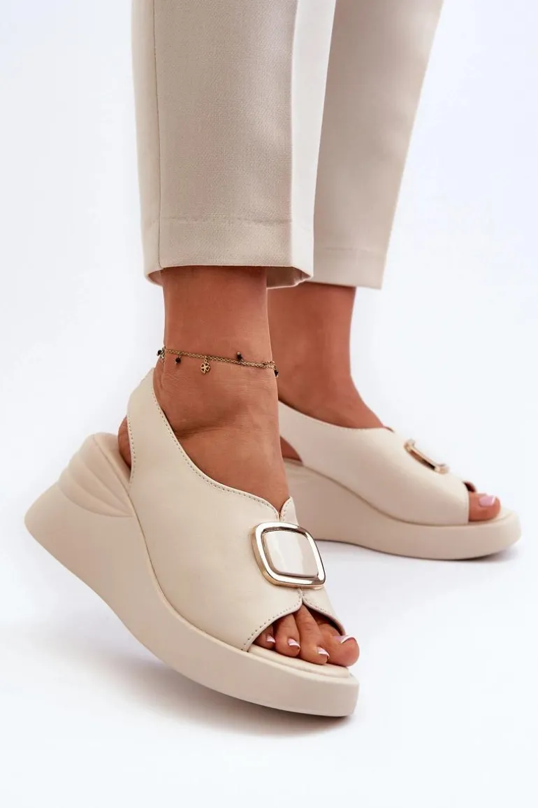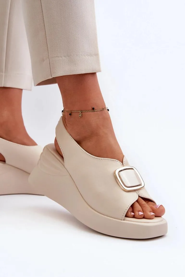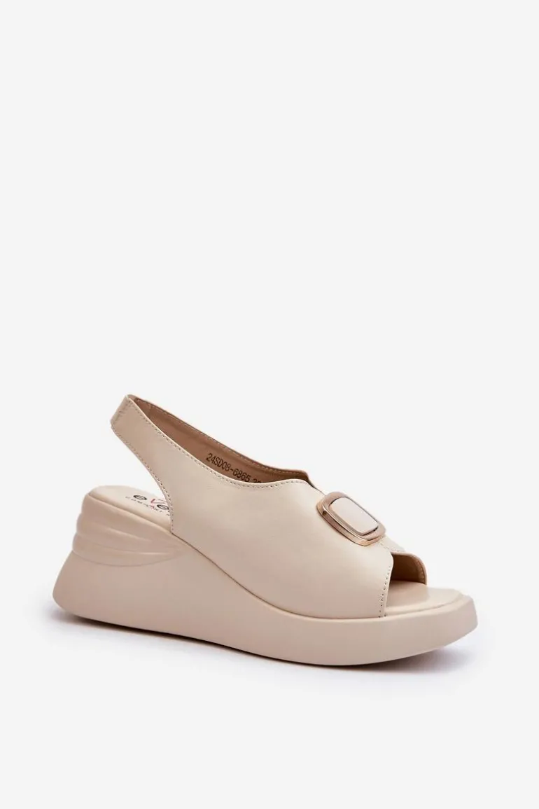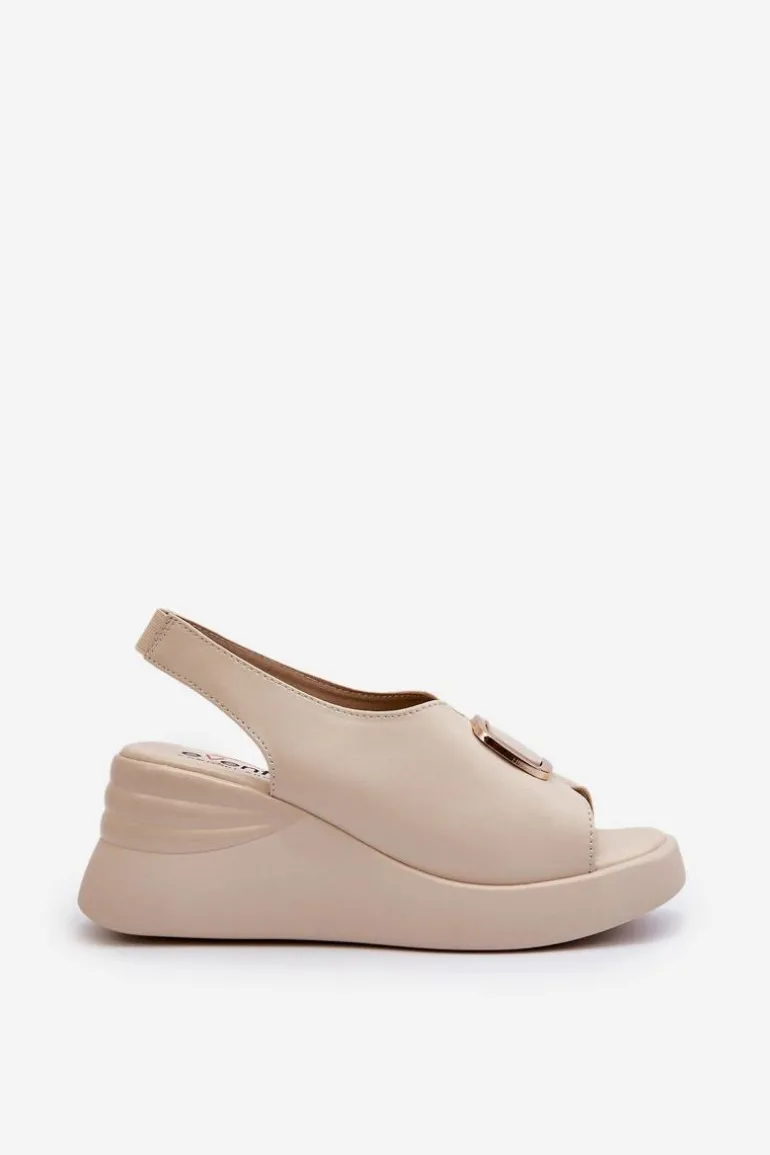 Skórzane Damskie Sandały Na Koturnie Z Ozdobą Beżowe Salvania
