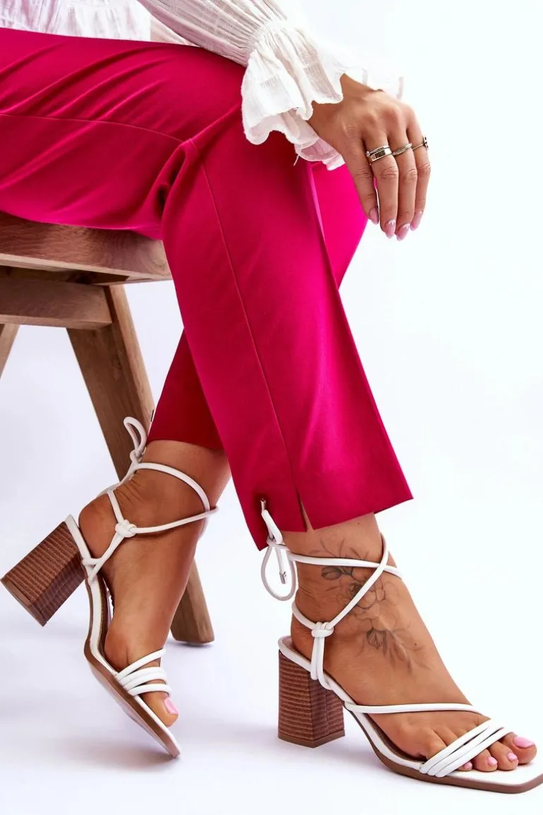 Niezwykłe sandałki na obcasie w postaci słupka świetnie sprawdzą się podczas upalnych dni. Idealnie będą prezentować się zarówno ze spodniami, jak i sukienkami. Buty zostały wykonane z eko skóry. Model ten posiada wiązanie wokół łydki. Sandałki posiadają odkryte palce oraz piętę. Miękka wkładka została wykonana z eko skóry. Ten model powinien być Twój! Przy wyborze rozmiaru prosimy sugerować się tabelą rozmiarów.