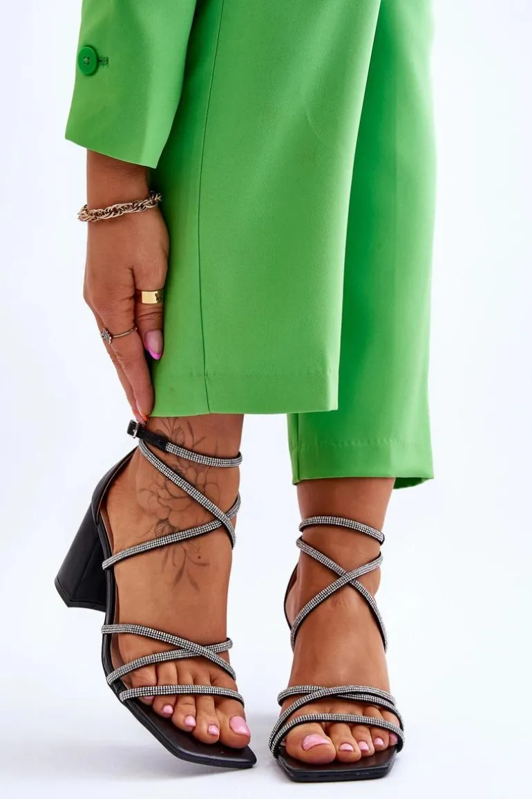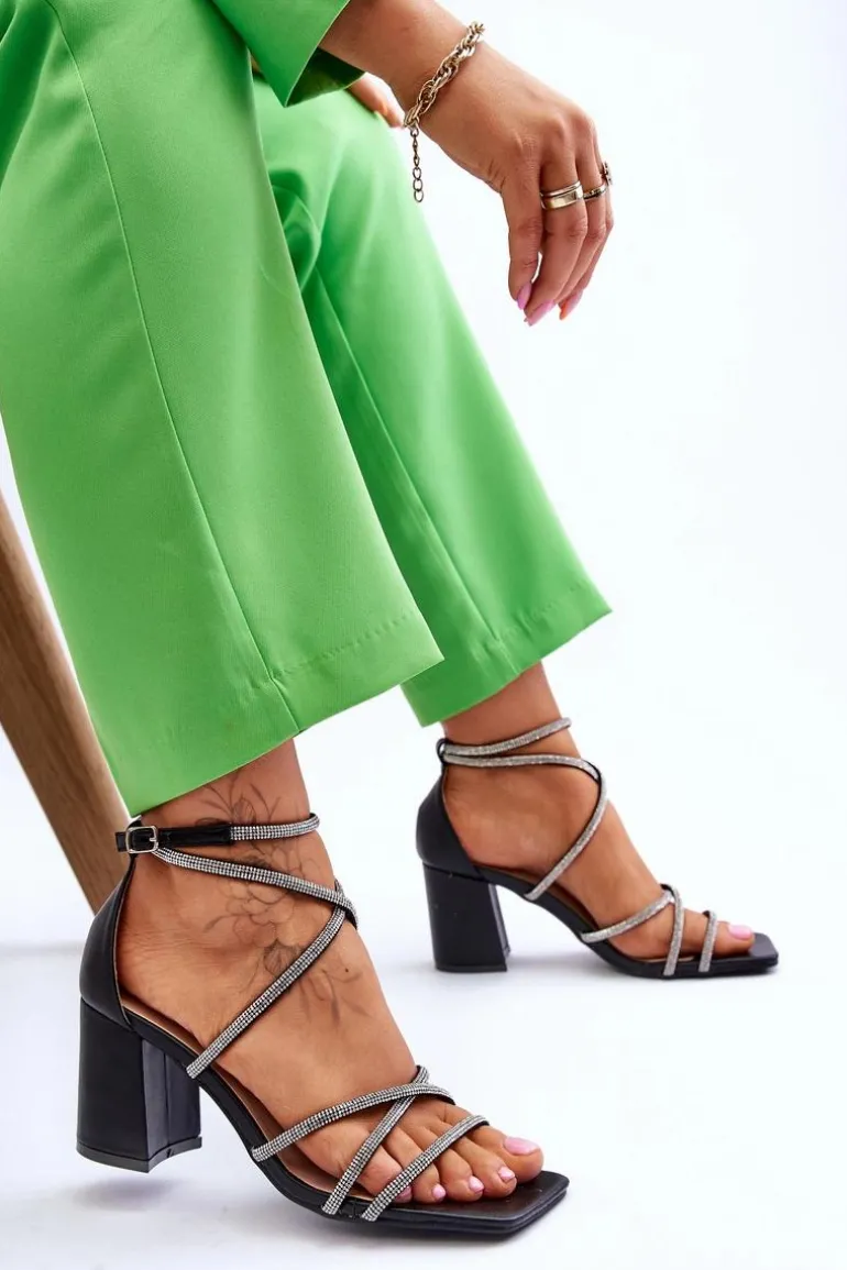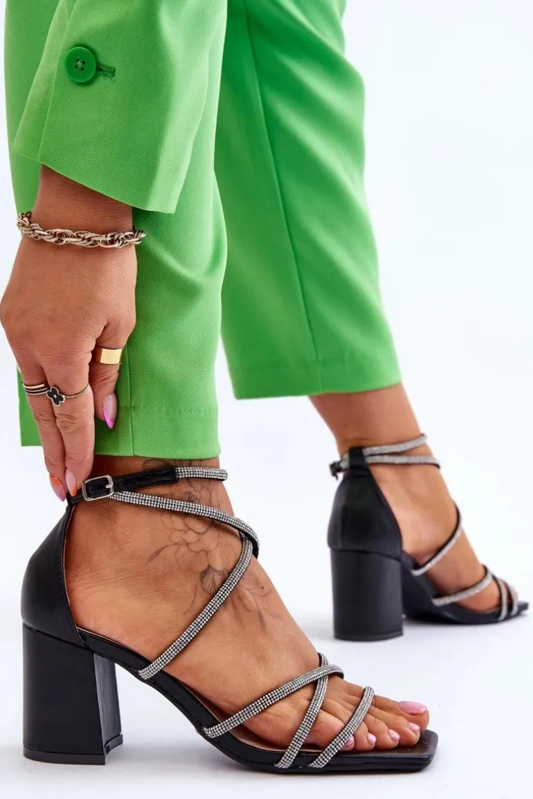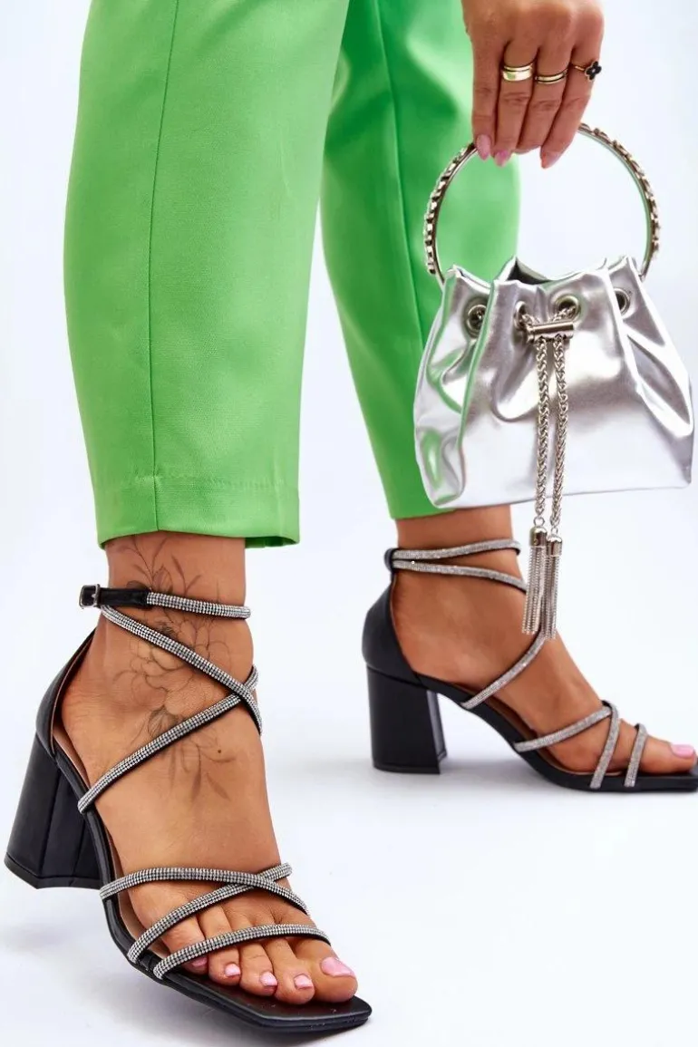 Wyjątkowe sandałki damskie na masywnym obcasie w postaci słupka. Model ten został wykonany z eko skóry. Dodatkowo na paseczkach znajdują się dżety imitujące cyrkonie. Model ten posiada regulowany pasek zapinany na sprzączkę. Miękka, eko skórzana wkładka zapewni komfortowe użytkowanie obuwia. Idealny model na różnego rodzaju ważne uroczystości czy randkę! Przy wyborze rozmiaru prosimy sugerować się tabelą rozmiarów.