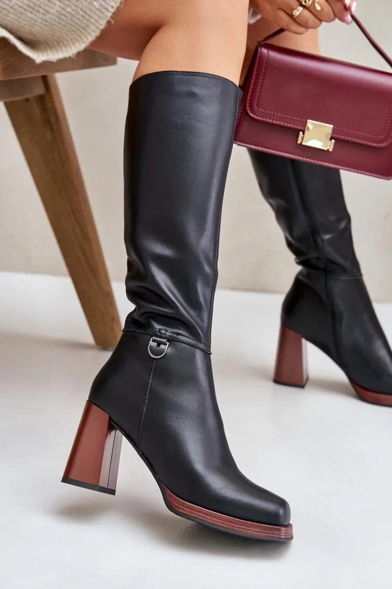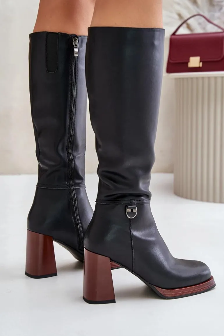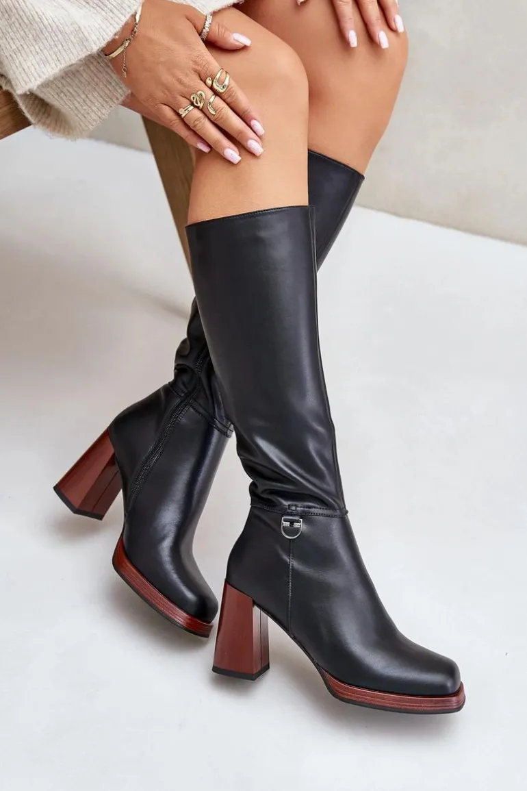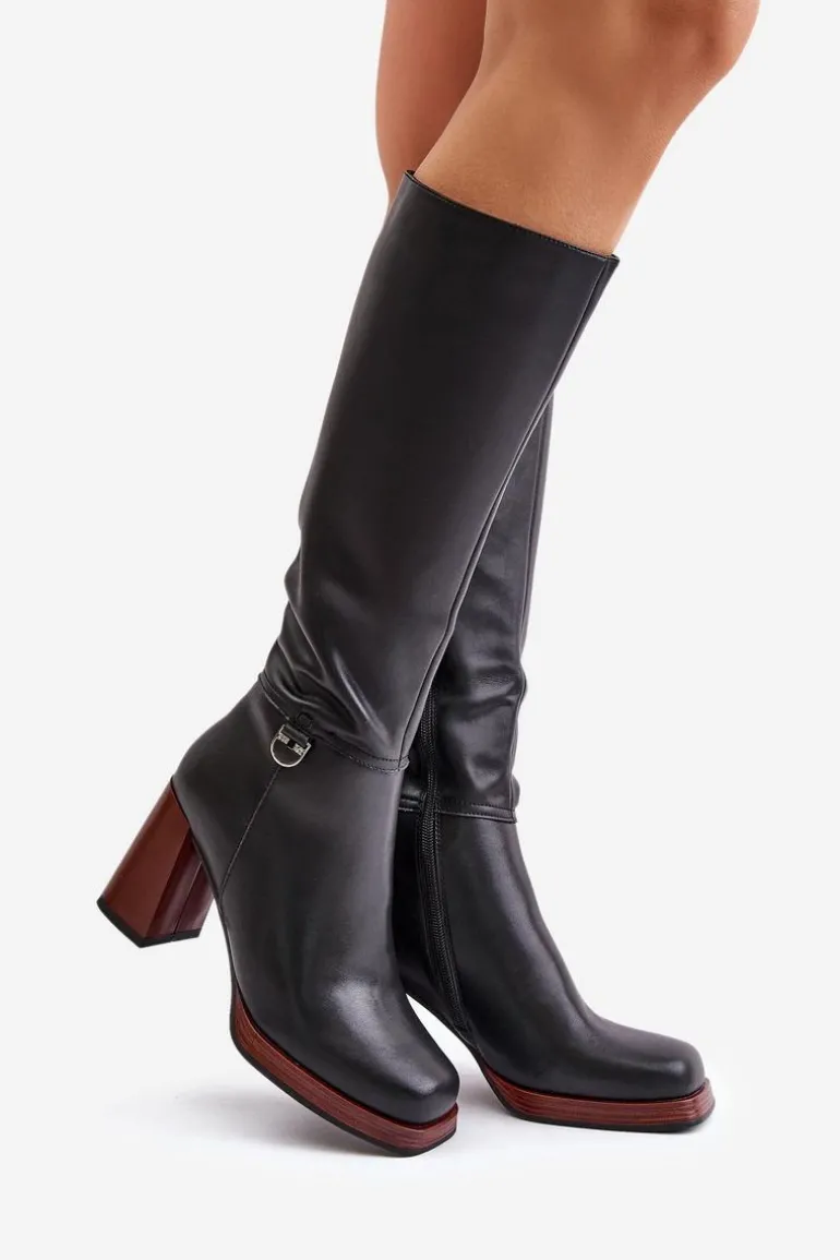 Eleganckie kozaki damskie do kolana. Wykonane z naturalnej skóry. Osadzone na obcasie w postaci słupka. Noski w kwadrat. Zapinane na zamek. Środek ocieplany kocem obuwniczym, co zapewni ciepło i komfort w mroźniejsze dni. Cholewka sięga do kolana. Idealne do sukienek i spódnic! Przy wyborze rozmiaru prosimy sugerować się tabelą rozmiarów.