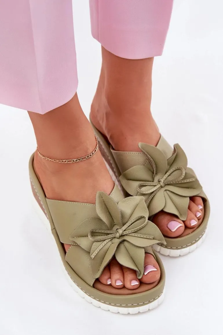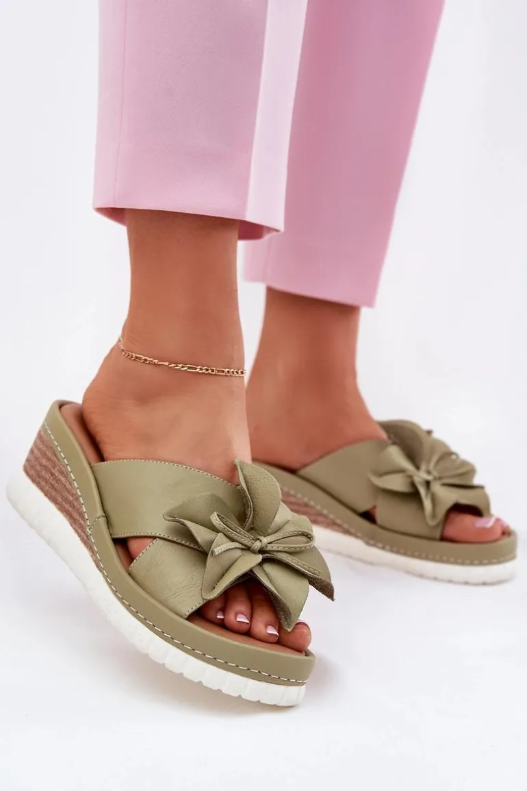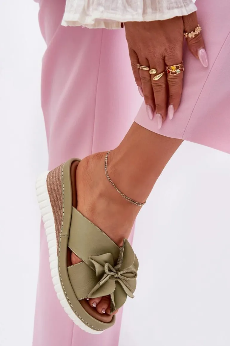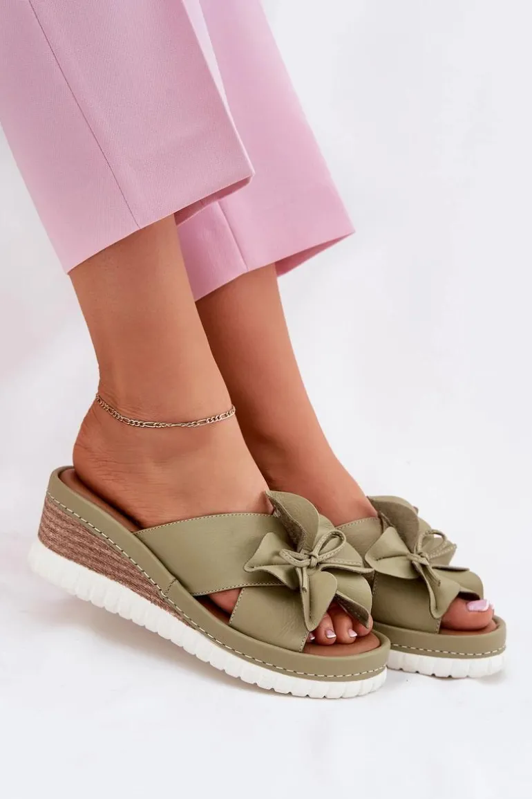 Damskie klapki wykonane z wysokiej jakości naturalnej skóry. Osadzone na koturnie. Z przodu buta znajduje się subtelny ozdobny kwiatek, który dodaje wyjątkowego charakteru. Bardzo miękka wkładka zapewnia komfort przez cały dzień, sprawiając, że te klapki będą idealnym wyborem do letnich stylizacji, łącząc funkcjonalność z modnym wyglądem. Przy wyborze rozmiaru prosimy sugerować się tabelą rozmiarów.