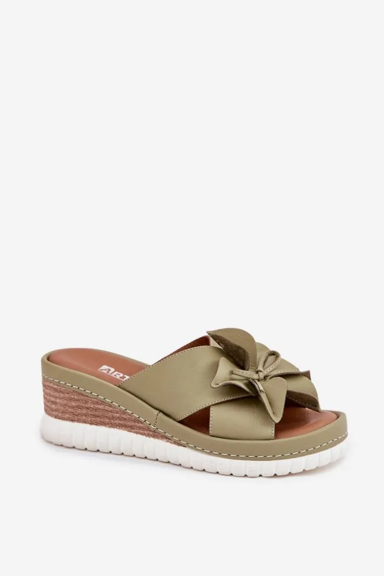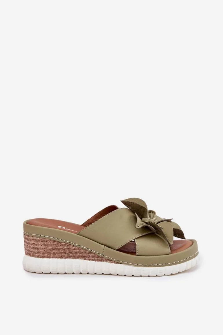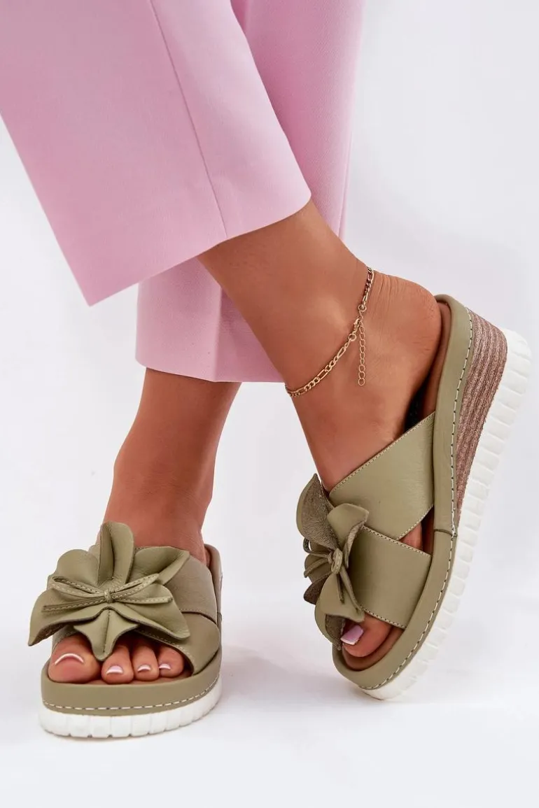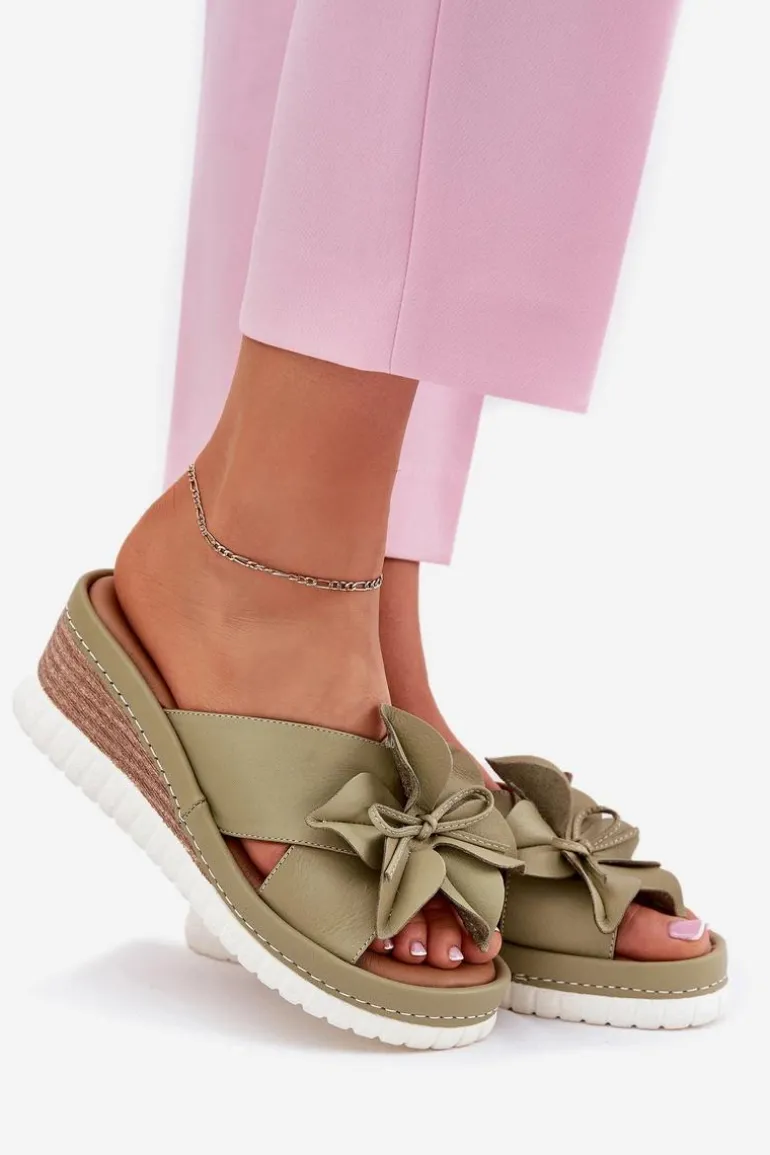 Damskie klapki wykonane z wysokiej jakości naturalnej skóry. Osadzone na koturnie. Z przodu buta znajduje się subtelny ozdobny kwiatek, który dodaje wyjątkowego charakteru. Bardzo miękka wkładka zapewnia komfort przez cały dzień, sprawiając, że te klapki będą idealnym wyborem do letnich stylizacji, łącząc funkcjonalność z modnym wyglądem. Przy wyborze rozmiaru prosimy sugerować się tabelą rozmiarów.