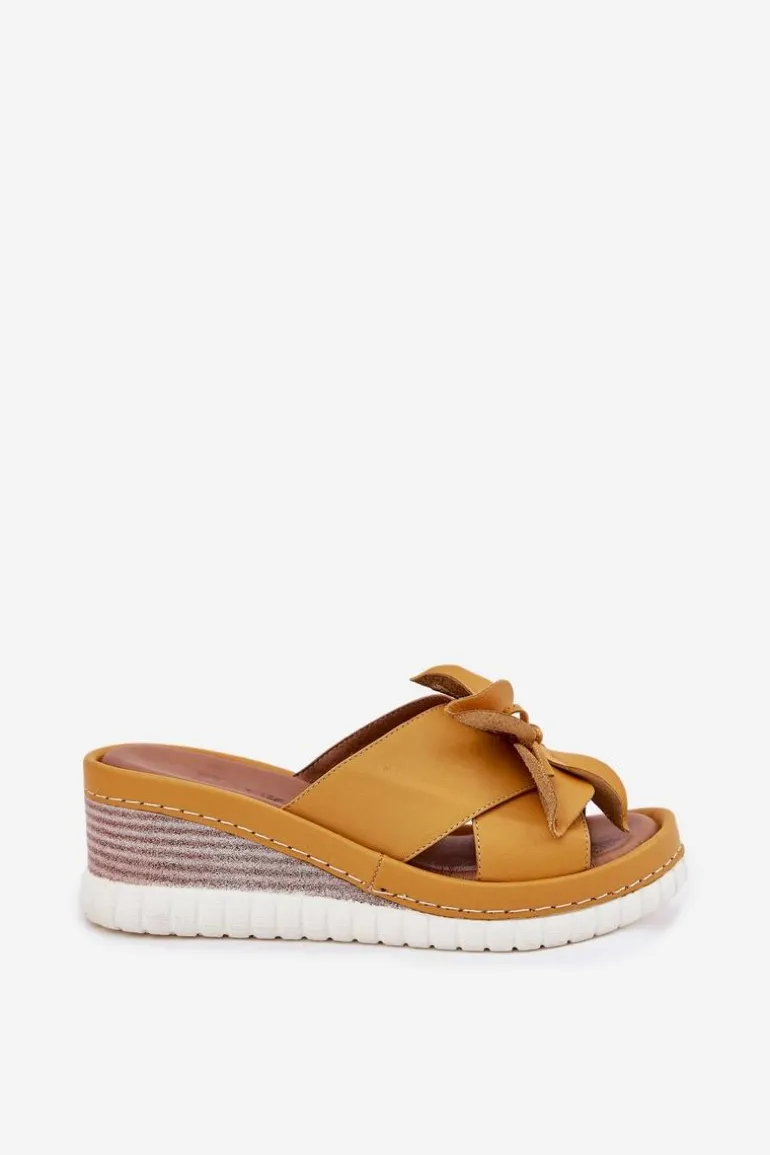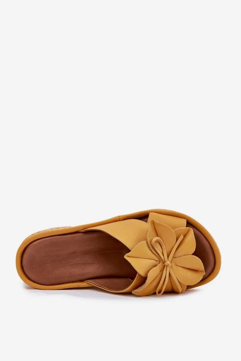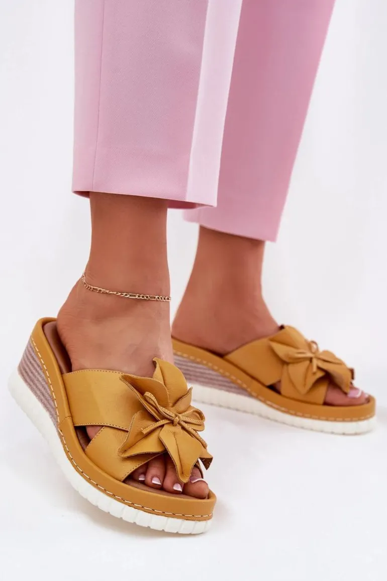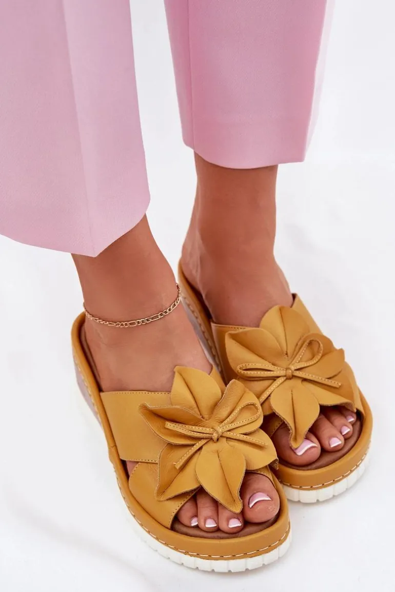 Skórzane Klapki Damskie Na Koturnie Z Ozdobnym Kwiatem Artiker 52C0504 Żółte