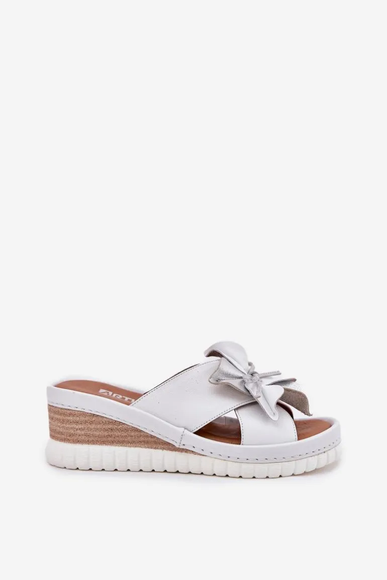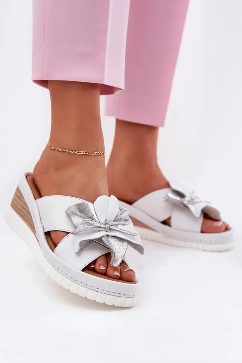 Damskie klapki wykonane z wysokiej jakości naturalnej skóry. Osadzone na koturnie. Z przodu buta znajduje się subtelny ozdobny kwiatek, który dodaje wyjątkowego charakteru. Bardzo miękka wkładka zapewnia komfort przez cały dzień, sprawiając, że te klapki będą idealnym wyborem do letnich stylizacji, łącząc funkcjonalność z modnym wyglądem. Przy wyborze rozmiaru prosimy sugerować się tabelą rozmiarów.