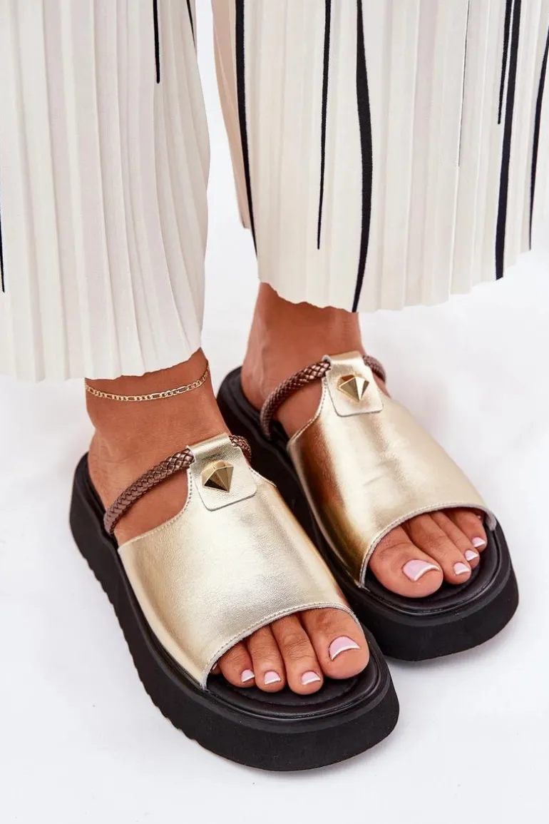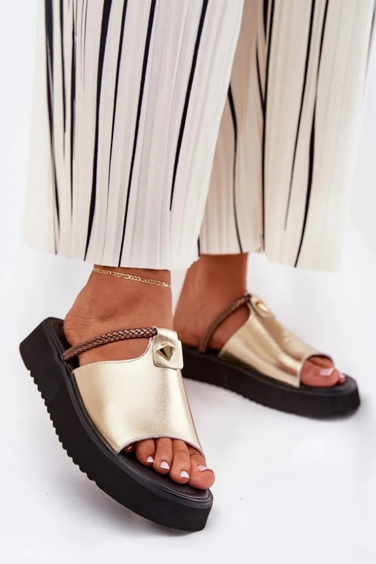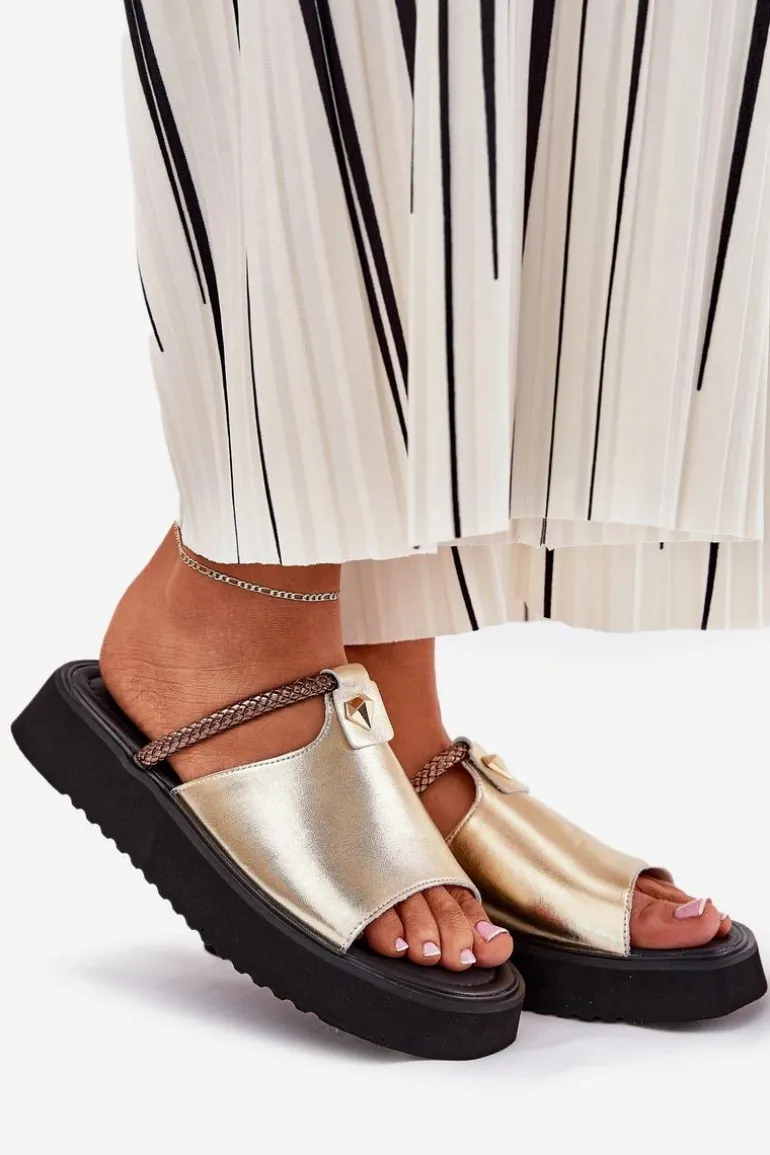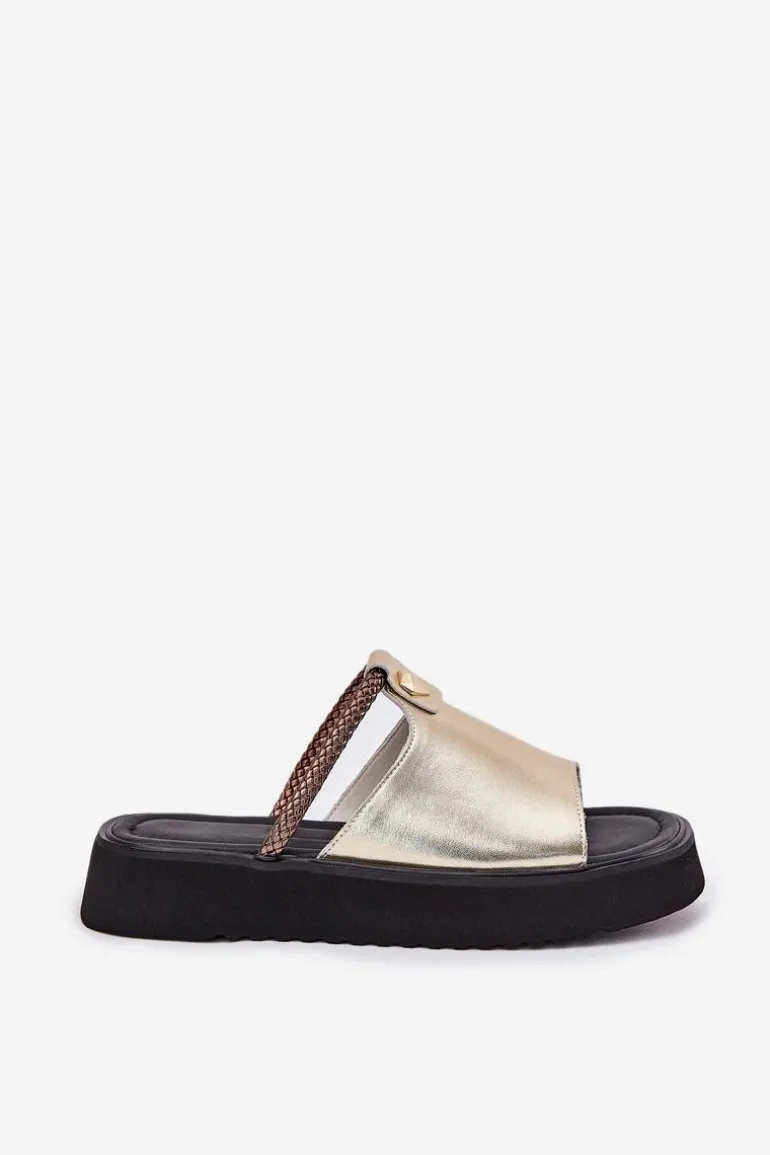 Skórzane Klapki Damskie Na Platformie Z Ozdobnym Paskiem D&A MK51-475 Złote