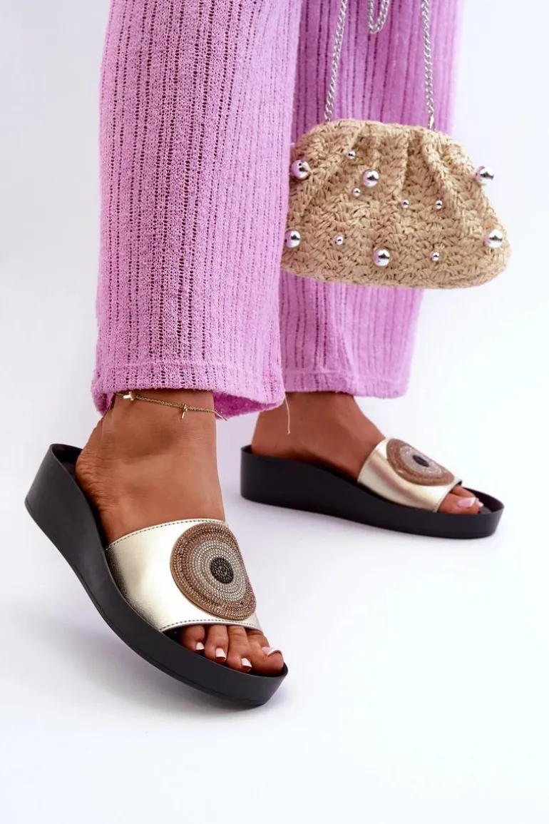 Damskie klapki z naturalnej skóry to połączenie elegancji i komfortu. Osadzone na stabilnej platformie z delikatnym koturnem. Model ten wyróżnia się błyszczącą ozdobą na pasku. Wkładka Comfort z naturalnej skóry, gwarantuje wyjątkową wygodę noszenia przez cały dzień. Przy wyborze rozmiaru prosimy sugerować się tabelą rozmiarów.