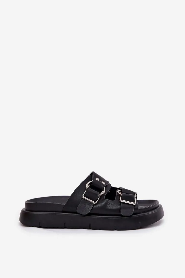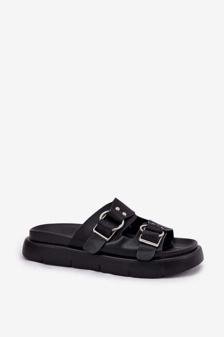 Damskie klapki marki Big Star, wykonane z wysokiej jakości naturalnej skóry, to doskonała propozycja na ciepłe dni. Osadzone na platformie, zapewniają komfort i stabilność przez cały dzień. Model ten wyróżnia się dwoma paskami ozdobionymi klamrami, które nadają im nowoczesnego charakteru. Stylowe i eleganckie, te klapki będą doskonałym uzupełnieniem letnich stylizacji, łącząc wygodę z modnym wyglądem. Przy wyborze rozmiaru prosimy sugerować się tabelą rozmiarów.