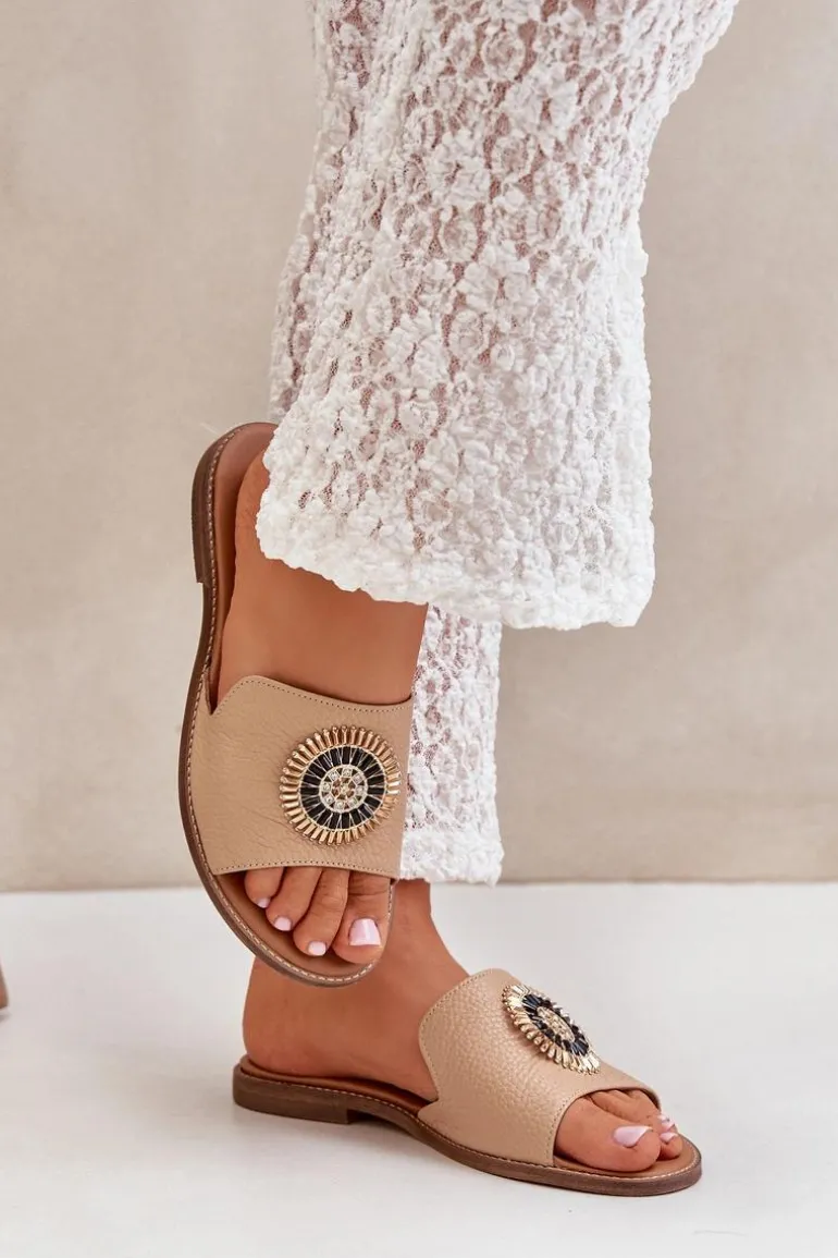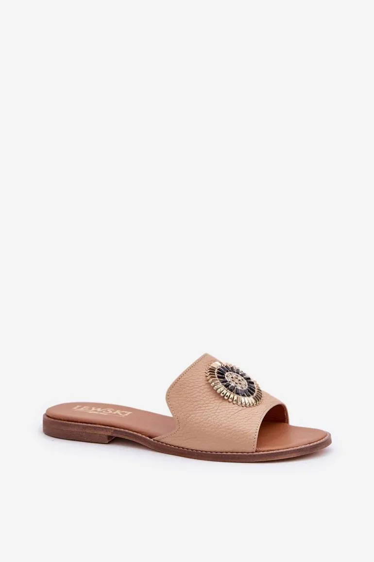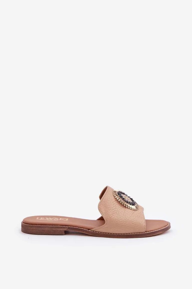 Skórzane Klapki Z Ozdobą Na Płaskim Obcasie Lewski 3047/O Beżowe