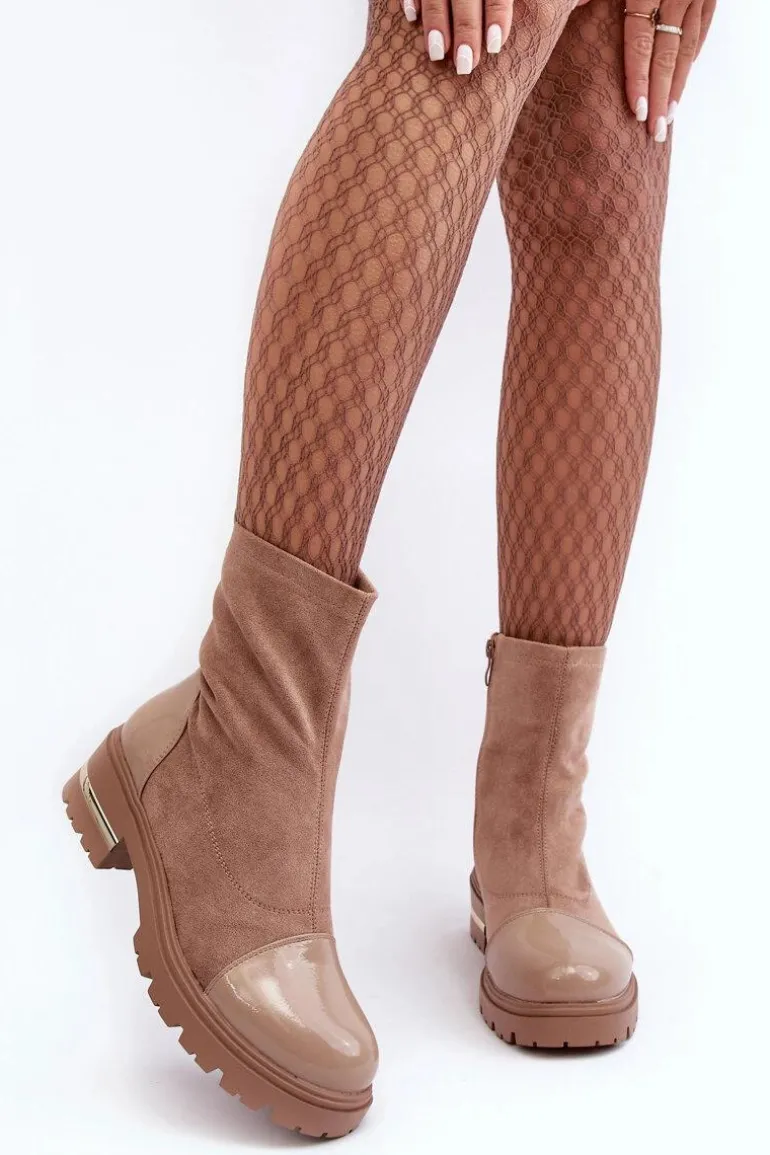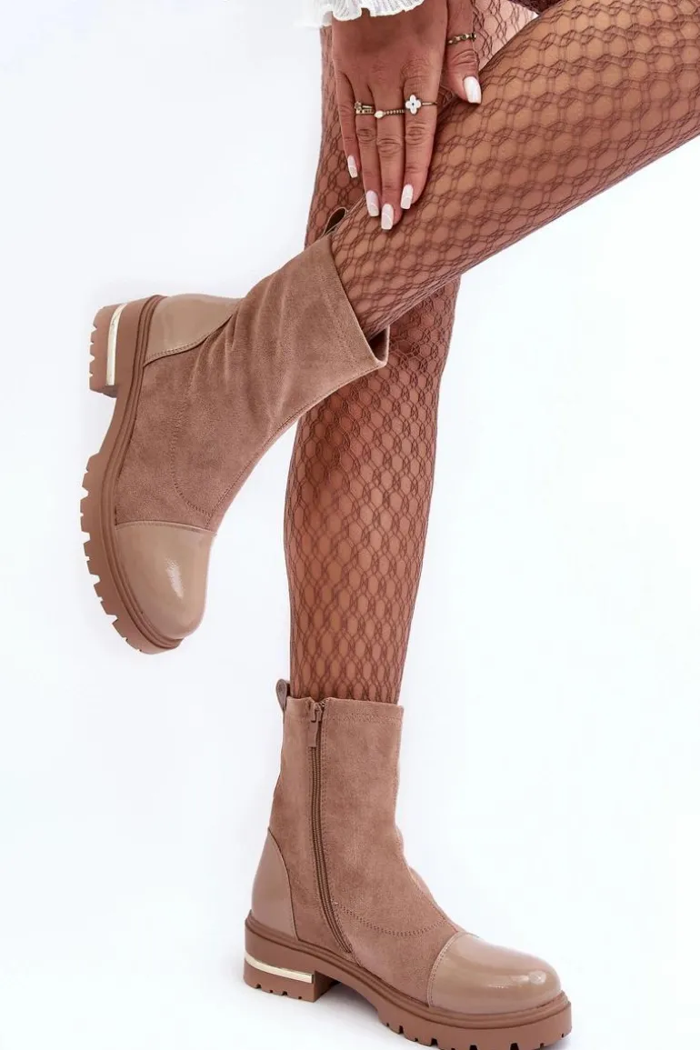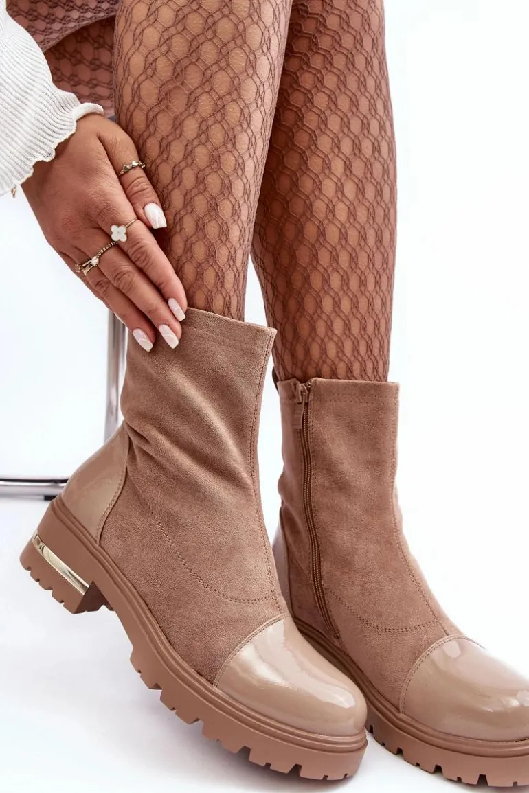 Skórzane Klasyczne Botki Na Płaskim Obcasie Beżowe Shendete