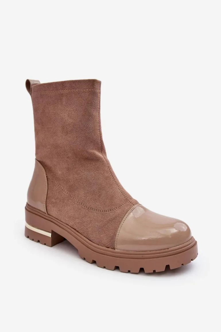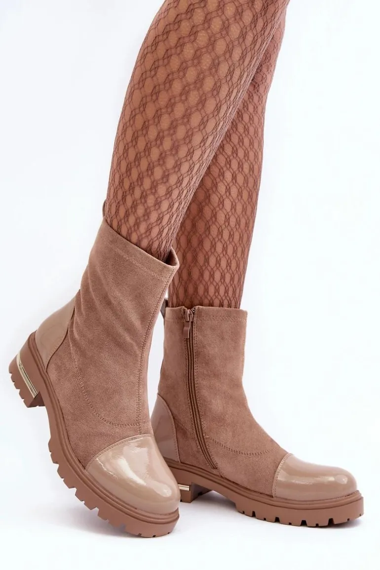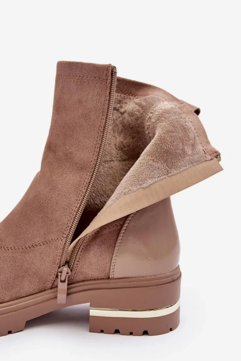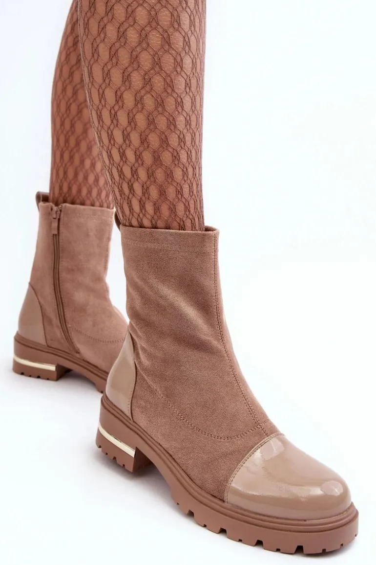 Skórzane Klasyczne Botki Na Płaskim Obcasie Beżowe Shendete