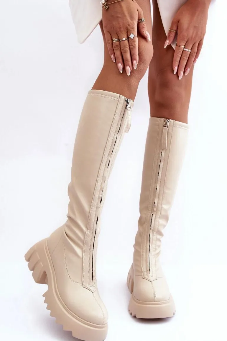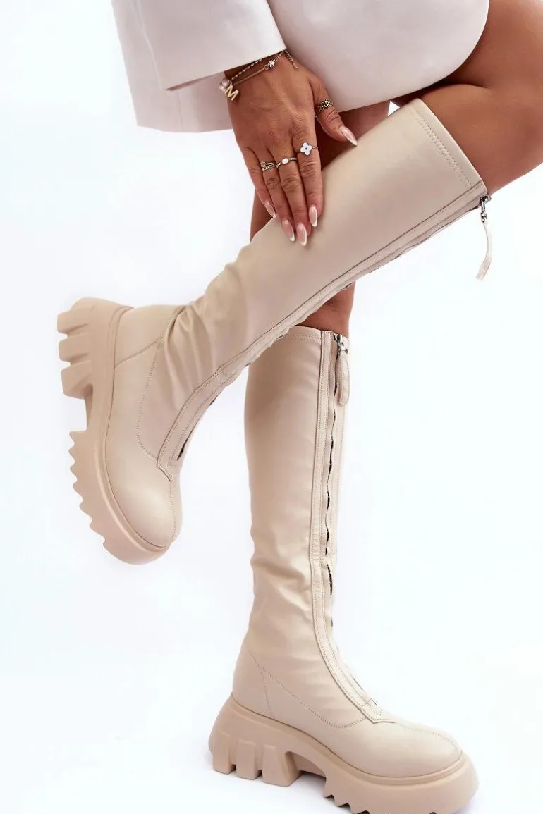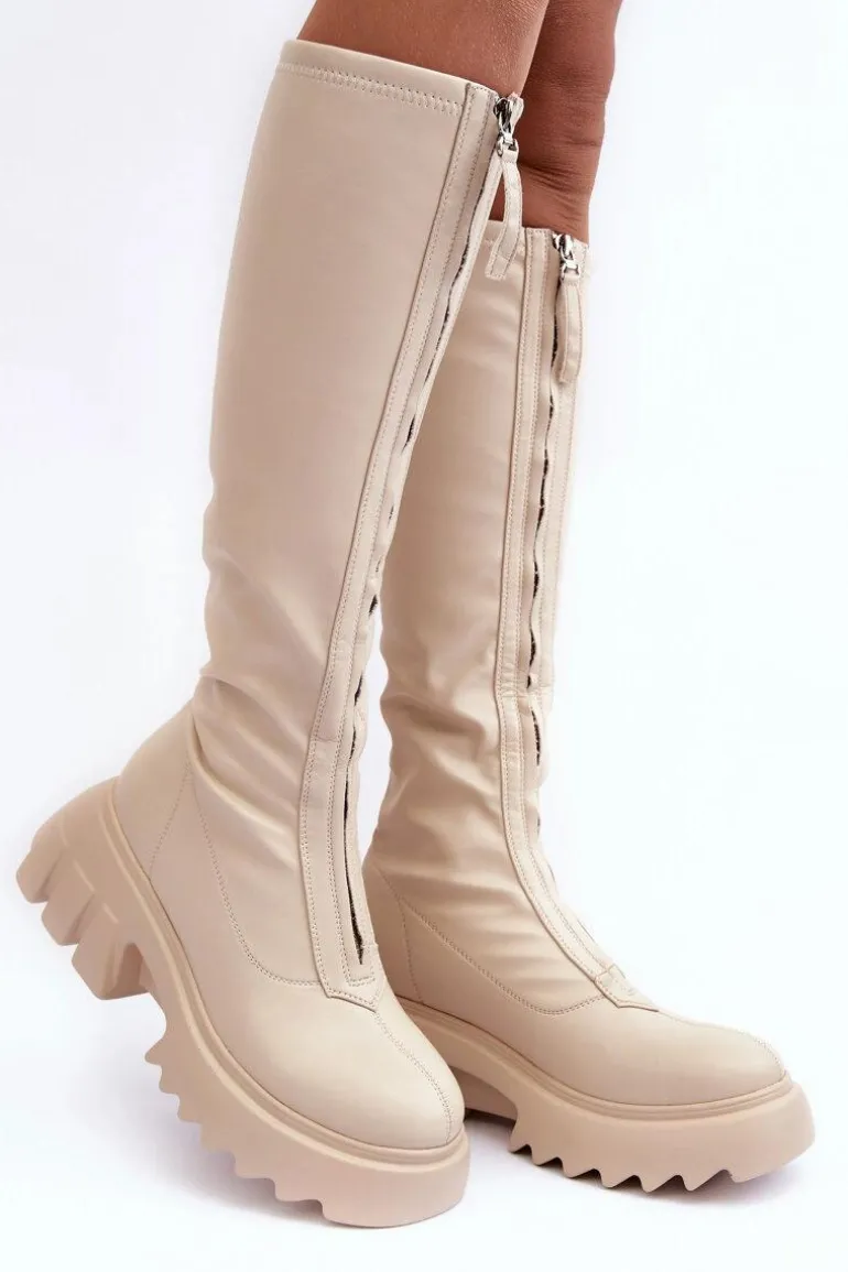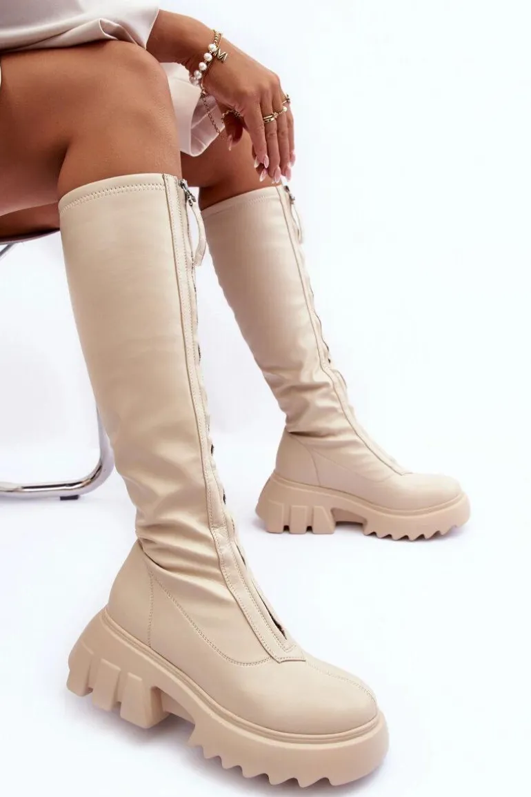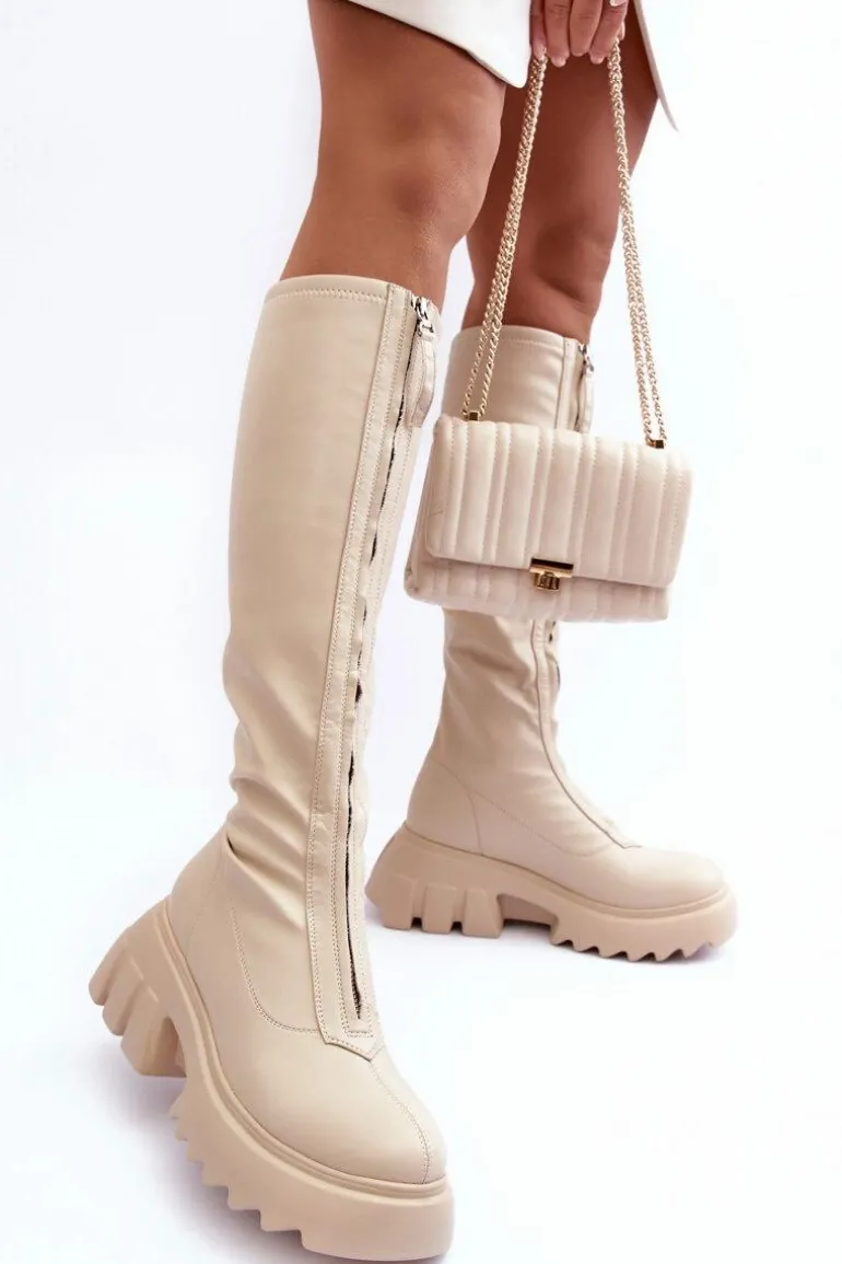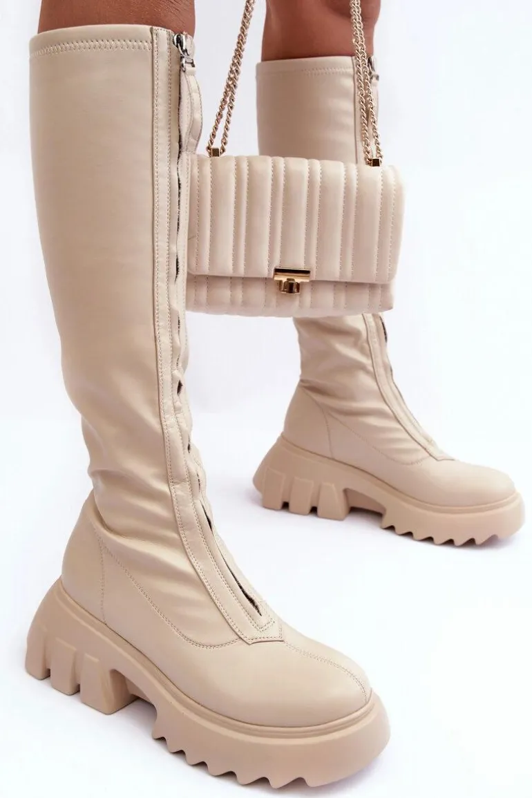 Modne, damskie kozaki do kolana. Wykonane z eko skóry. Osadzone na masywnej platformie i płaskim obcasie. Model zapinany na suwak, który znajduje się na całej długości cholewki z przodu. Zapiętek jest usztywniany, noski zaokrąglone. Środek ocieplony kocem obuwniczym. Przy wyborze rozmiaru prosimy kierować tabelą rozmiarów.