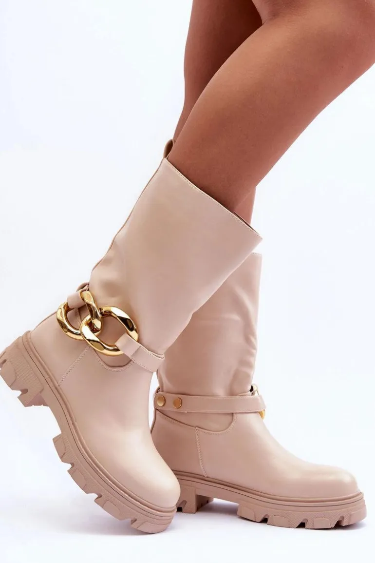 Modne kozaki damskie zostały wykonane z eko skóry. Osadzone na płaskim masywnym obcasie oraz platformie. Fason do połowy łydki. Model ten jest wsuwany oraz posiada odpinany paseczek z ozdobą. Ocieplone są kocem obuwniczym. Przy wyborze rozmiaru prosimy kierować tabelą rozmiarów.