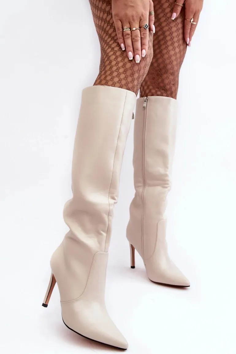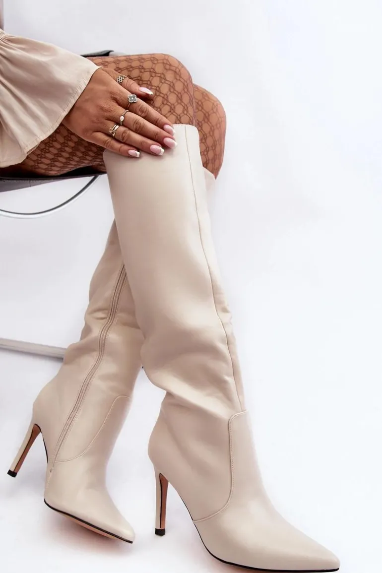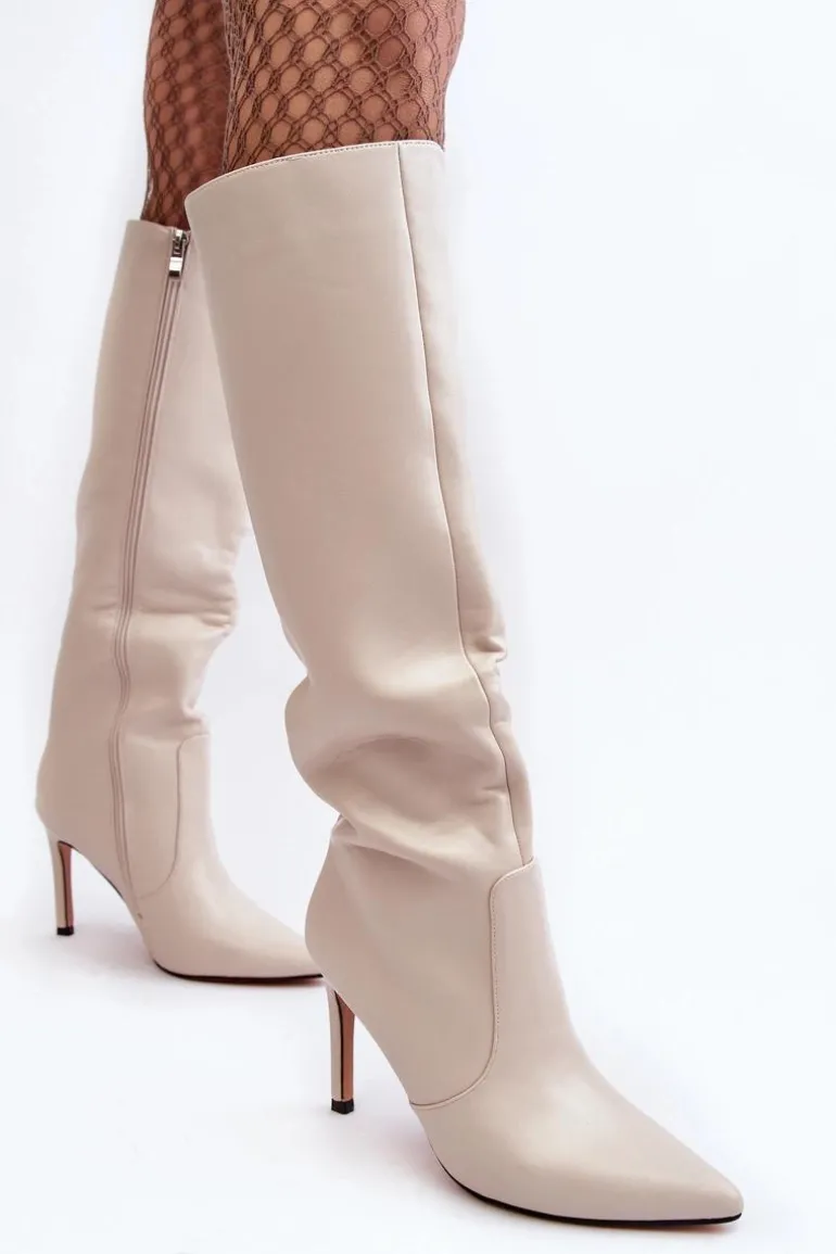 Skórzane Kozaki Na Szpilce Beżowe Melisandra