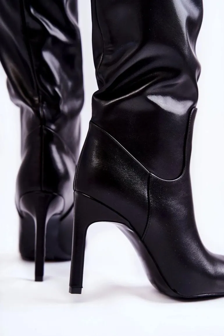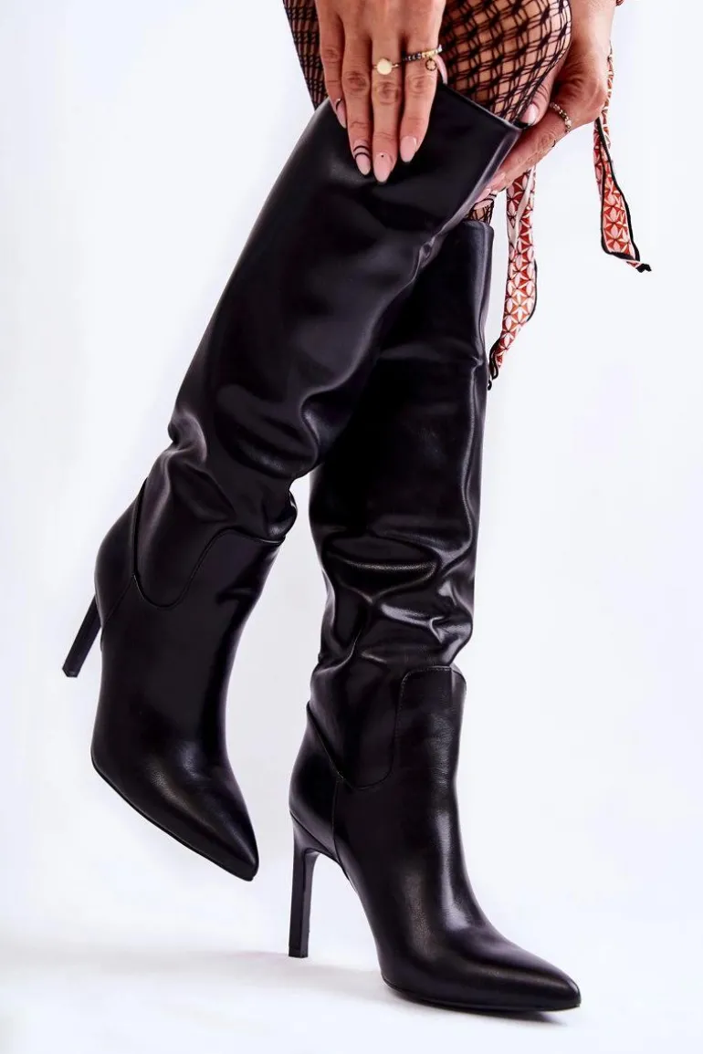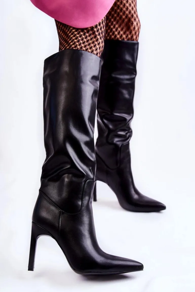 Wyjątkowe, wsuwane kozaki wykonane z eko skóry. Model ten na pewno zachwyci niejedną miłośniczkę ciepłych i wygodnych butów na obcasie! Posiadają usztywniany zapiętek. Model z noskiem w szpic oraz obcas w postaci szpilki optycznie wysmuklą nogi. Kozaki posiadają ocieplenie w postaci miłego w dotyku koca obuwniczego. Ten model powinien znaleźć się w Twojej szafie! Przy wyborze rozmiaru prosimy sugerować się tabelą rozmiarów.