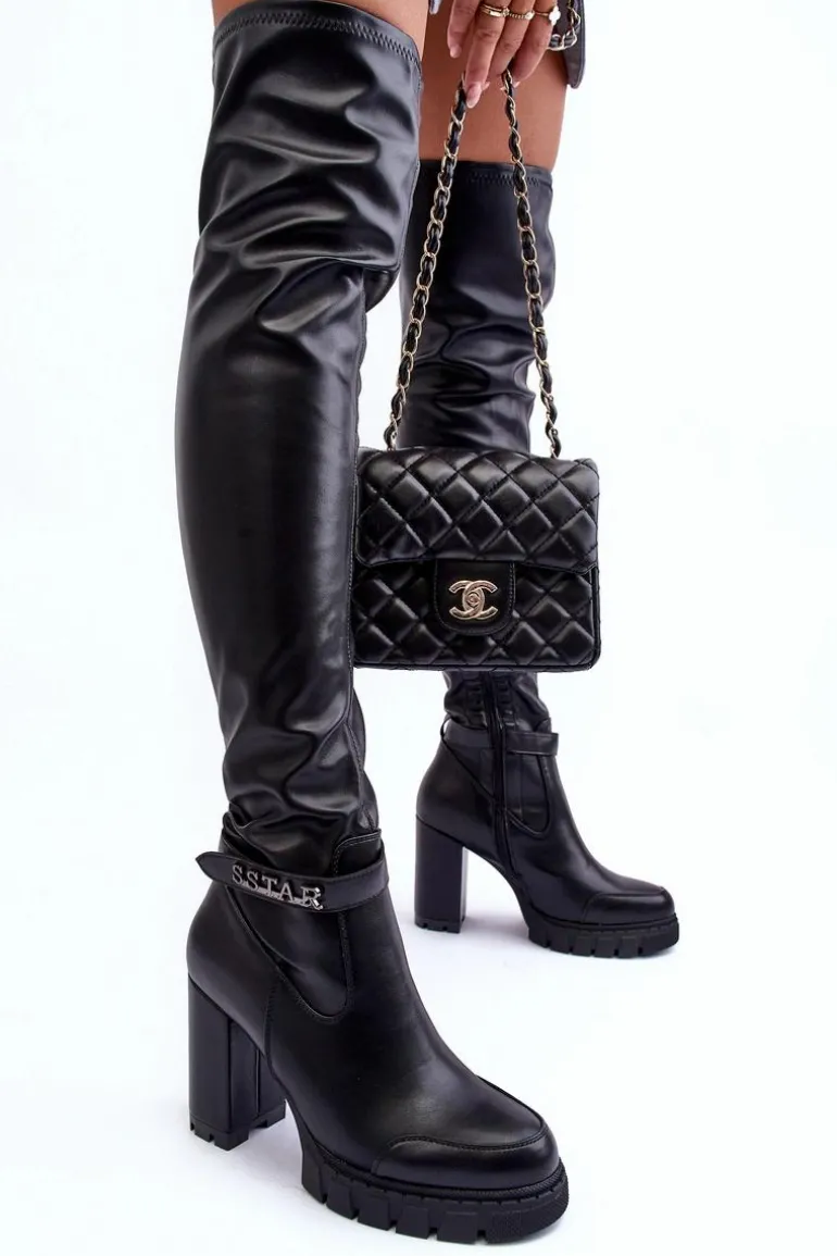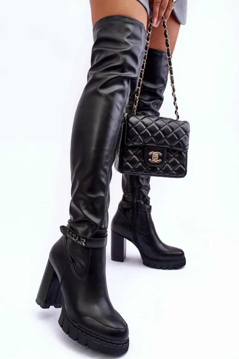 Kozaki damskie z cholewką za kolano. Osadzone na masywnym, wysokim słupku oraz platformie. Wykonane z eko skóry. Model wsuwany i zapinany na suwak. Środek ocieplony kocem obuwniczym. Zapiętek jest usztywniony. Na cholewce znajduje się ozdobny pasek. Wykorzystasz je w wielu stylizacjach! Przy wyborze rozmiaru prosimy sugerować się tabelą rozmiarów.
