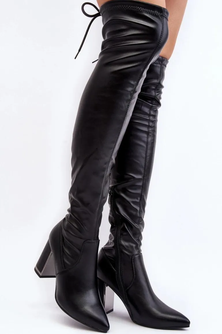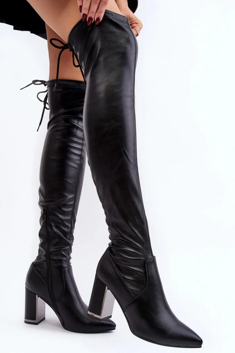 Kozaki damskie z cholewką za kolano. Wykonane z eko skóry. Osadzone na obcasie w postaci słupka, który wzbogacony został lustrzanym elementem. Na górze cholewki znajduje się wiązanie. Model wsuwany z dodatkowym suwakiem. W środku ocieplone na wysokości stopy. Idealny model do sukienek mini czy spódniczek. Koniecznie powinnaś je mieć! Przy wyborze rozmiaru prosimy sugerować się tabelą rozmiarów.