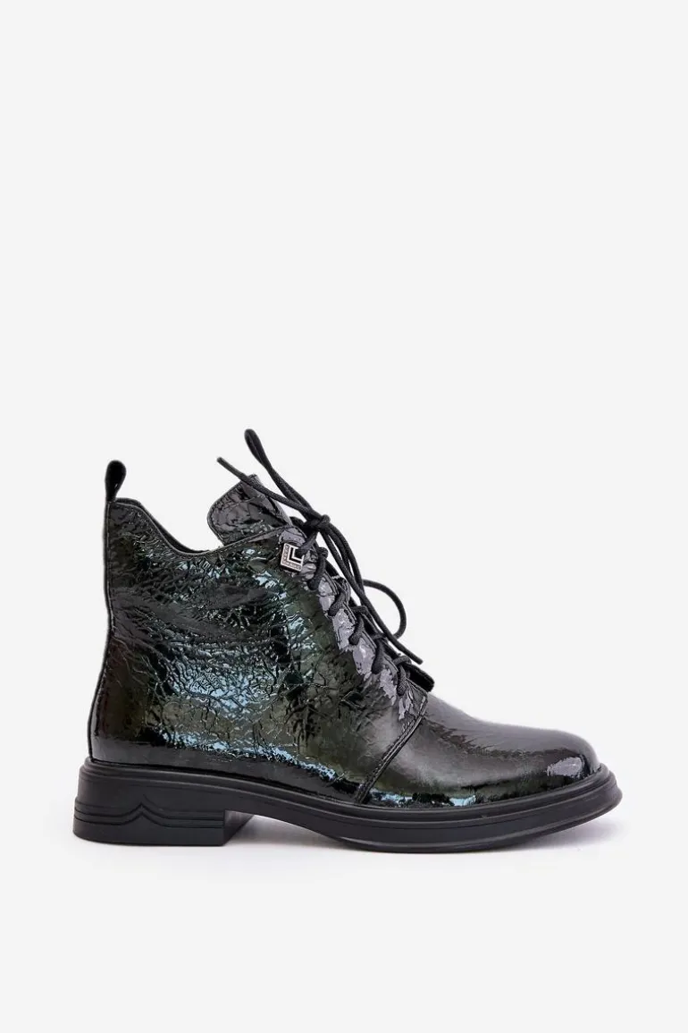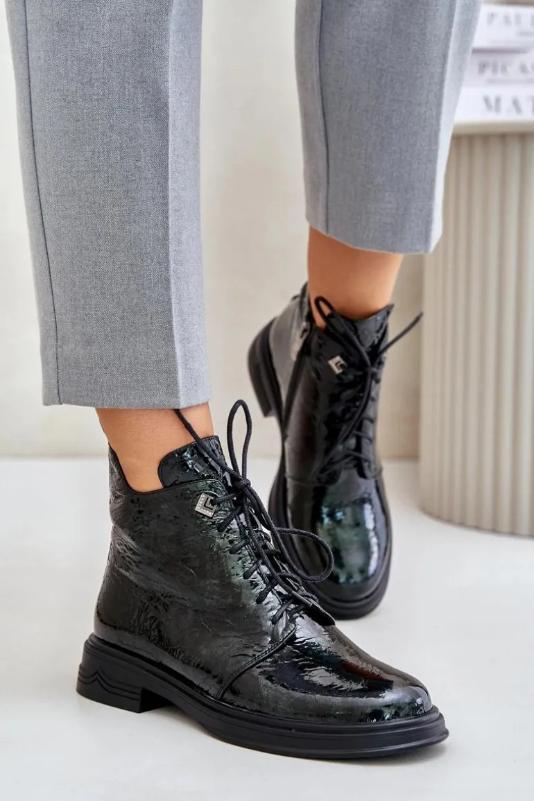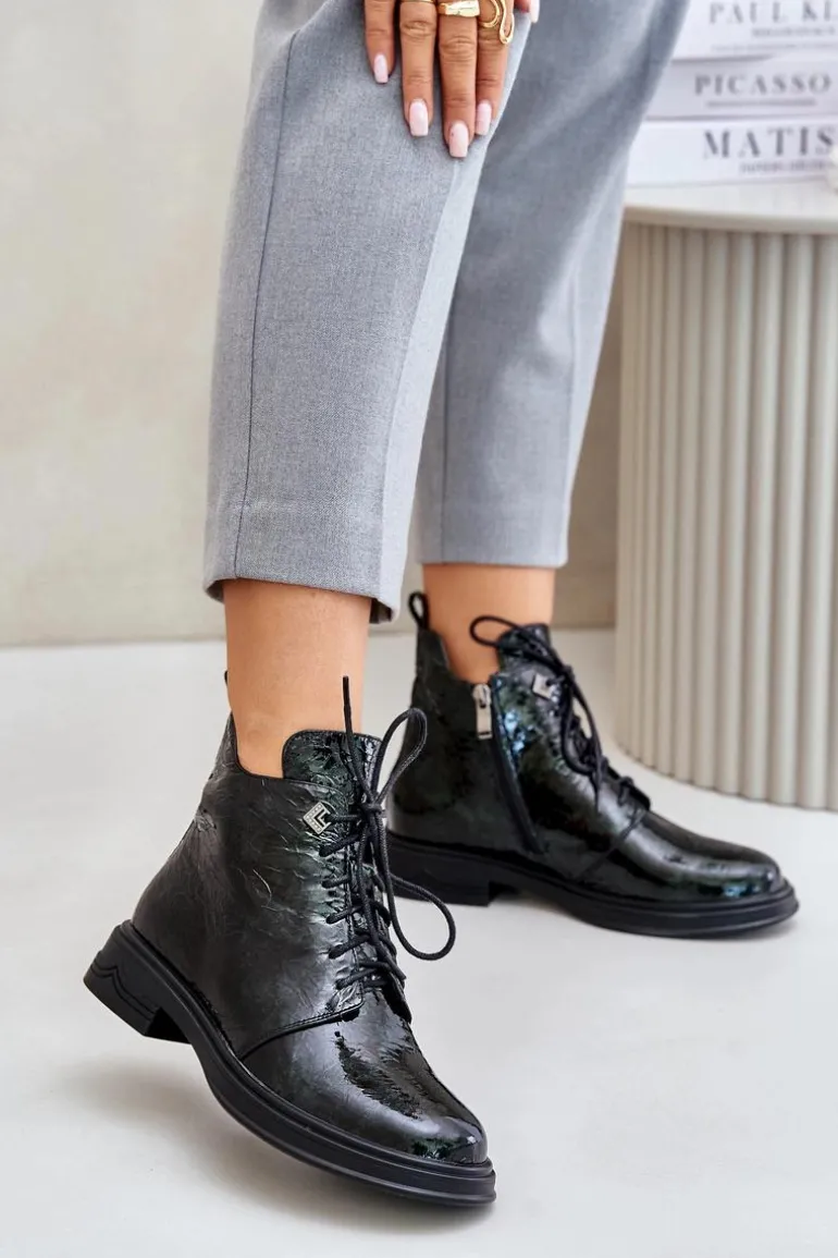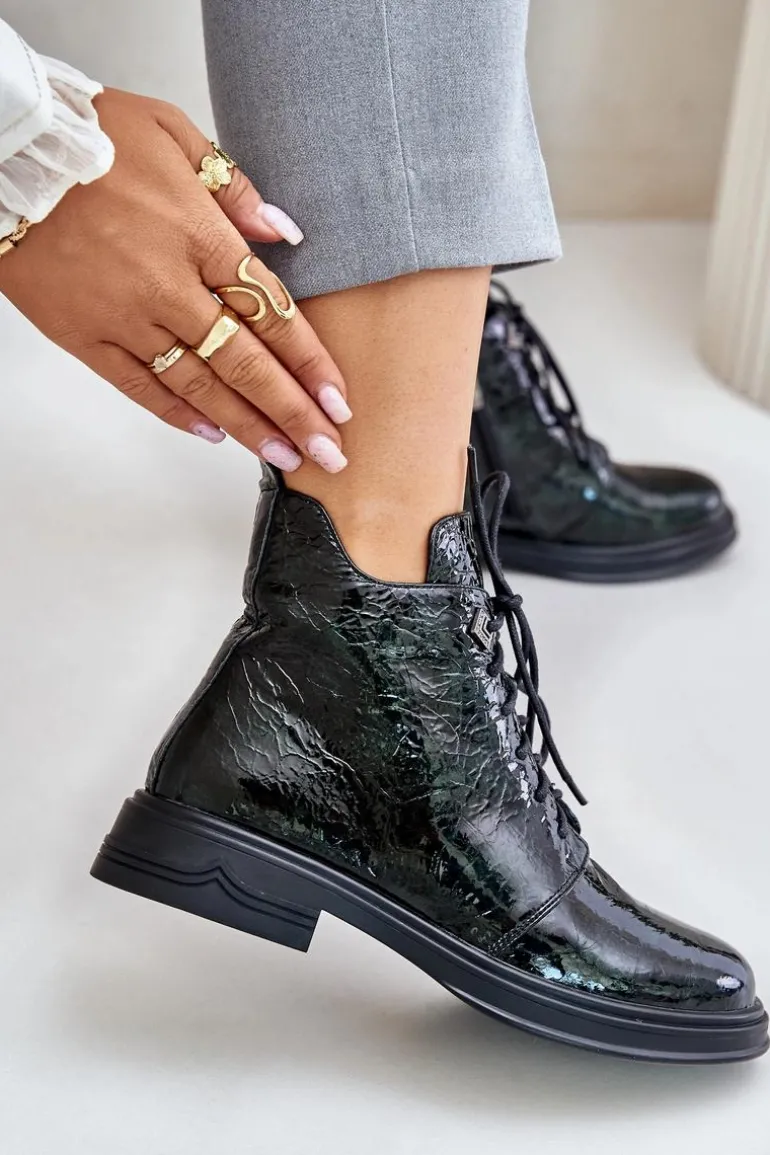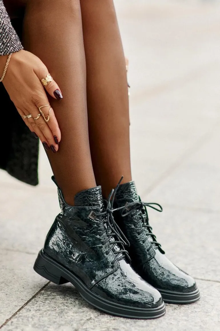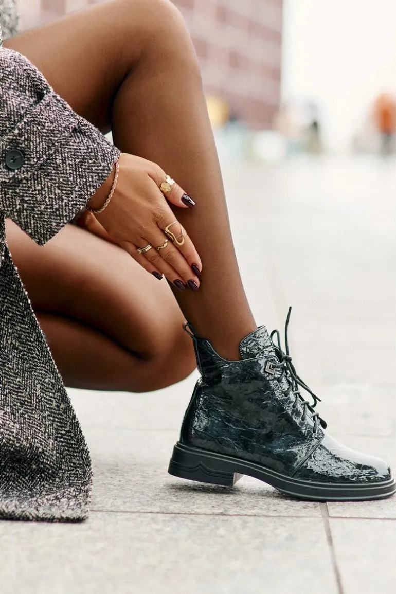Eleganckie botki wykonane z naturalnej skóry to stylowy wybór na chłodniejsze dni. Osadzone na płaskim obcasie, zapewniają wygodę, a połączenie sznurowania i zamka ułatwia ich zakładanie oraz dopasowanie do stopy. Tłoczenia na cholewce dodają im wyrafinowanego, oryginalnego wyglądu. Ocieplane wnętrze gwarantuje ciepło, dzięki czemu te botki doskonale sprawdzą się zarówno w codziennych, jak i bardziej eleganckich stylizacjach. Przy wyborze rozmiaru prosimy sugerować się tabelą rozmiarów.