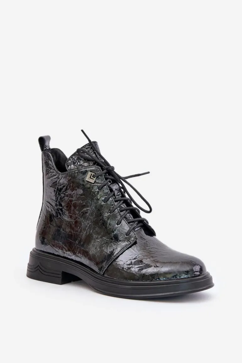 Skórzane Lakierowane Botki Damskie Ocieplane Na Zamek D&A LZ42-042 Czarno-Szare