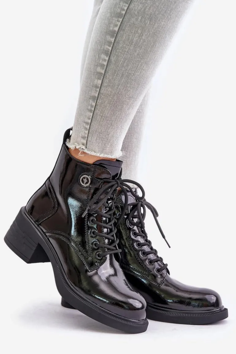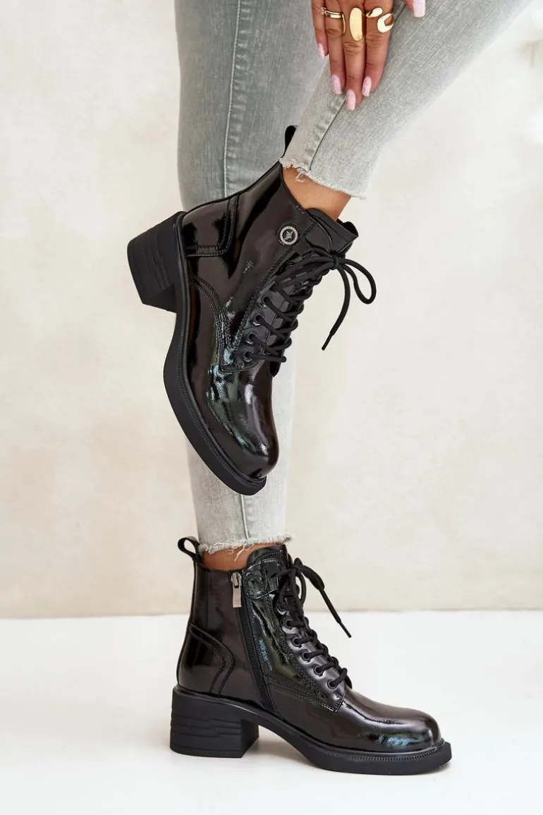 Botki damskie wykonane z naturalnej skóry. Osadzone na obcasie w formie klocka. Zapinane na zamek oraz dodatkowo posiadają sznurowanie, co zapewni idealne dopasowanie do stopy. Środek ocieplany kocem obuwniczym. Noski zaokrąglone. Na górze cholewki znajduje się mały, ozdobny detal. Model ten dopasujesz do wielu jesienno-zimowych stylizacji! Przy wyborze rozmiaru prosimy sugerować się tabelą rozmiarów