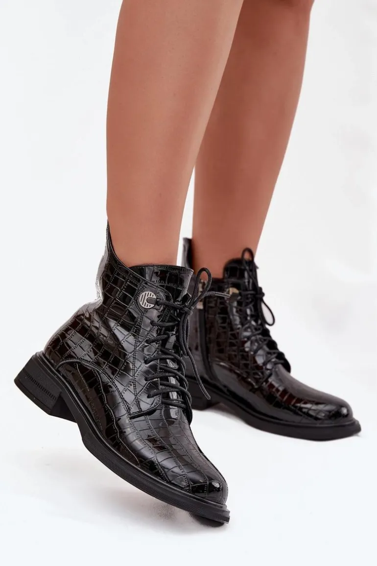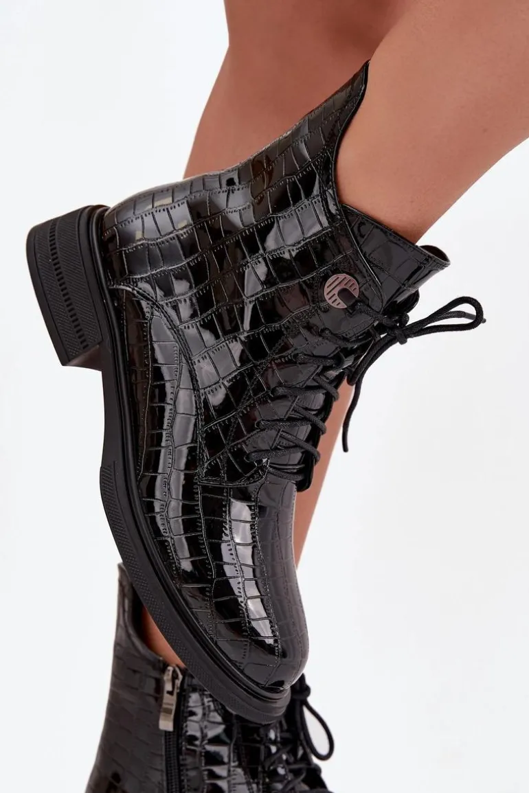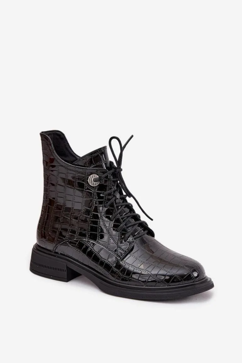 Botki damskie wykonane z naturalnej, lakierowanej skóry to stylowa propozycja na chłodniejsze dni. Połyskujące wykończenie nadaje im eleganckiego i nowoczesnego charakteru. Model zapinany jest na zamek oraz dodatkowo sznurowany, co pozwala na idealne dopasowanie do stopy i wygodne zakładanie. Wnętrze butów zostało ocieplone, dzięki czemu zapewniają ciepło i komfort nawet w zimniejsze dni. To połączenie klasyki i miejskiego szyku – doskonałe do codziennych stylizacji, jak i bardziej eleganckich zestawów. Przy wyborze rozmiaru prosimy sugerować się tabelą rozmiarów.