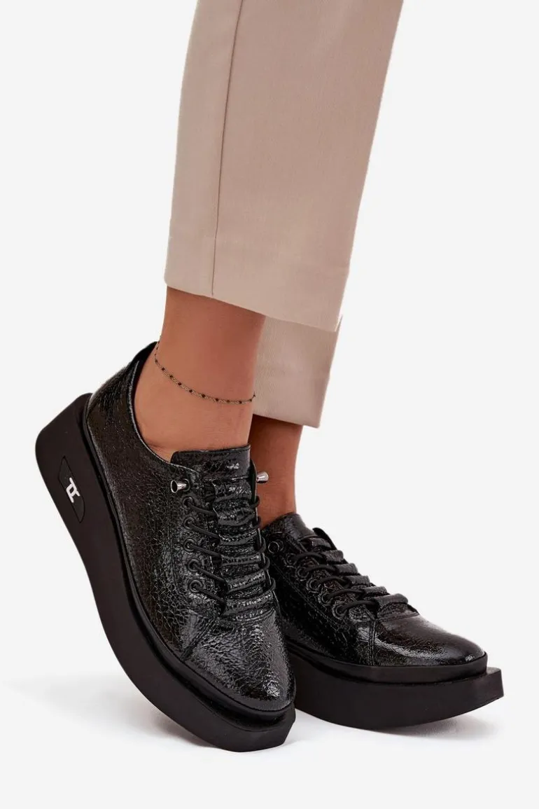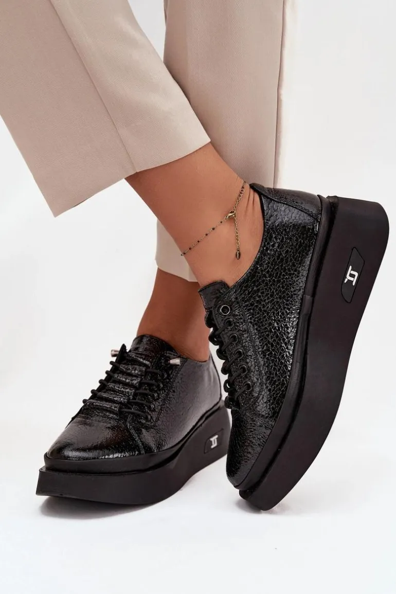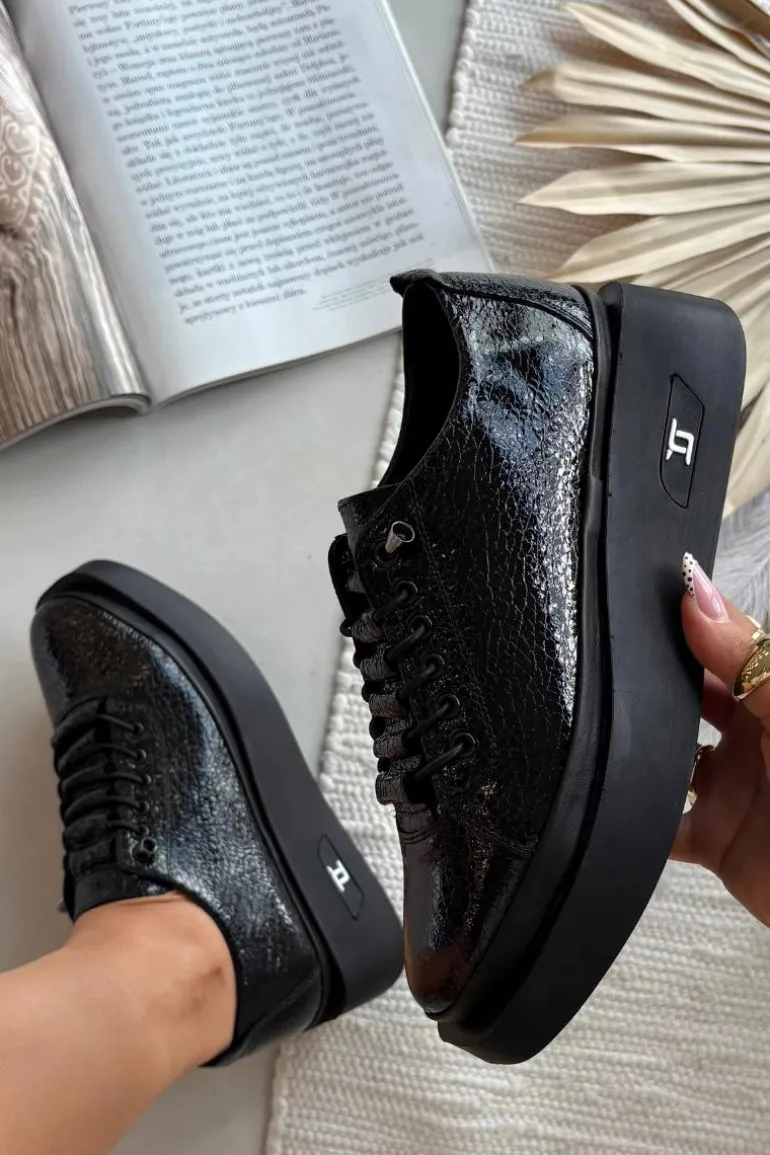 Półbuty damskie marki Artiker wykonane z lakierowanej skóry naturalnej to propozycja, która łączy elegancję z codzienną wygodą. Błyszczące wykończenie nadaje im stylowego charakteru, a solidna platforma zapewnia komfort noszenia oraz nowoczesny wygląd. Zamiast tradycyjnych sznurowadeł, model posiada elastyczne gumki imitujące sznurowanie, dzięki czemu buty zyskują oryginalny wygląd i są wyjątkowo praktyczne – łatwo się je zakłada i zdejmuję. To półbuty, które doskonale sprawdzą się w miejskich stylizacjach, łącząc elegancję z nutą sportowego luzu. Przy wyborze rozmiaru prosimy sugerować się tabelą rozmiarów.