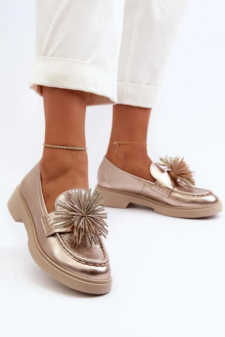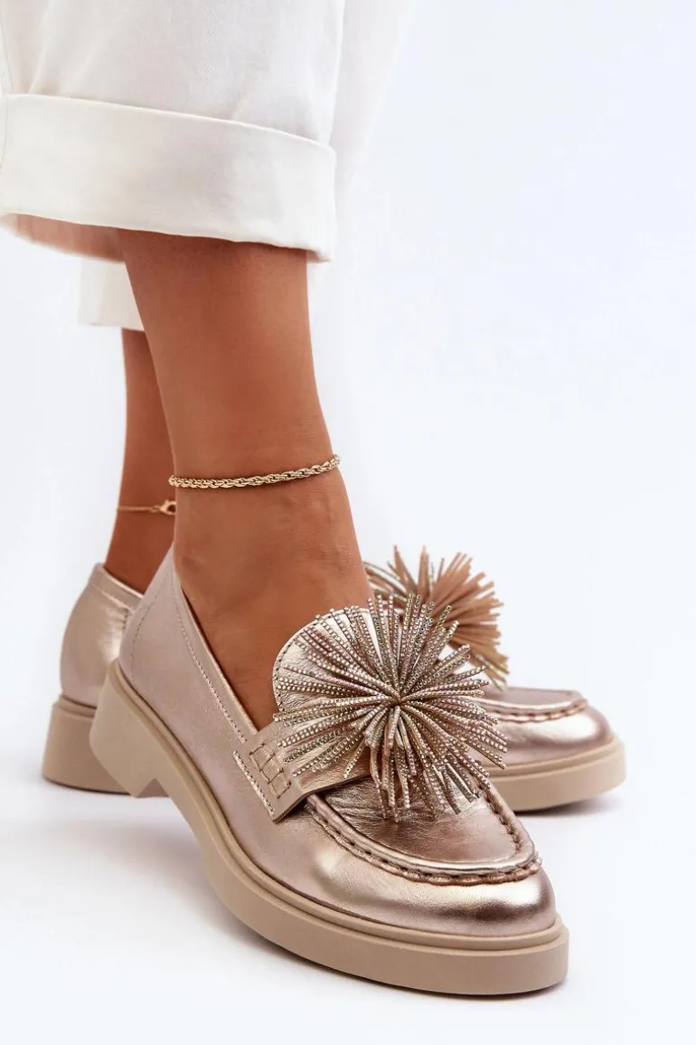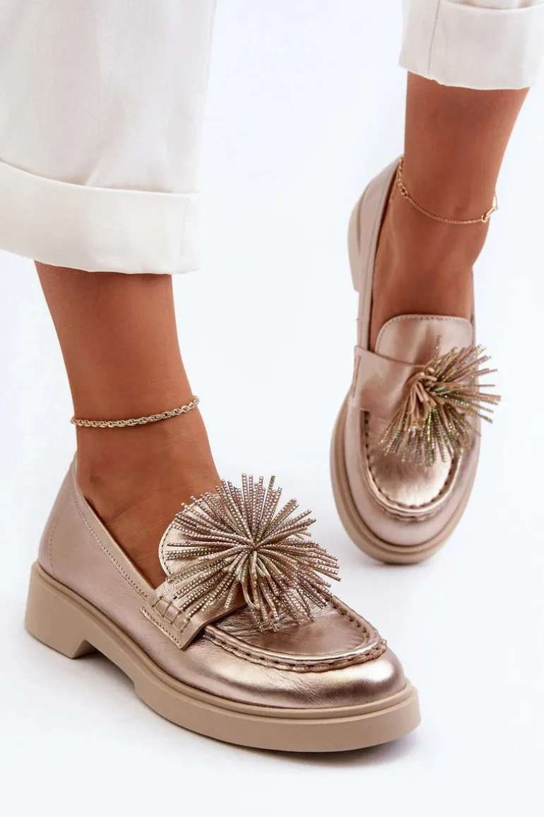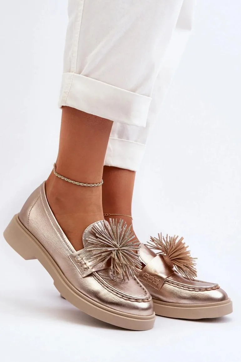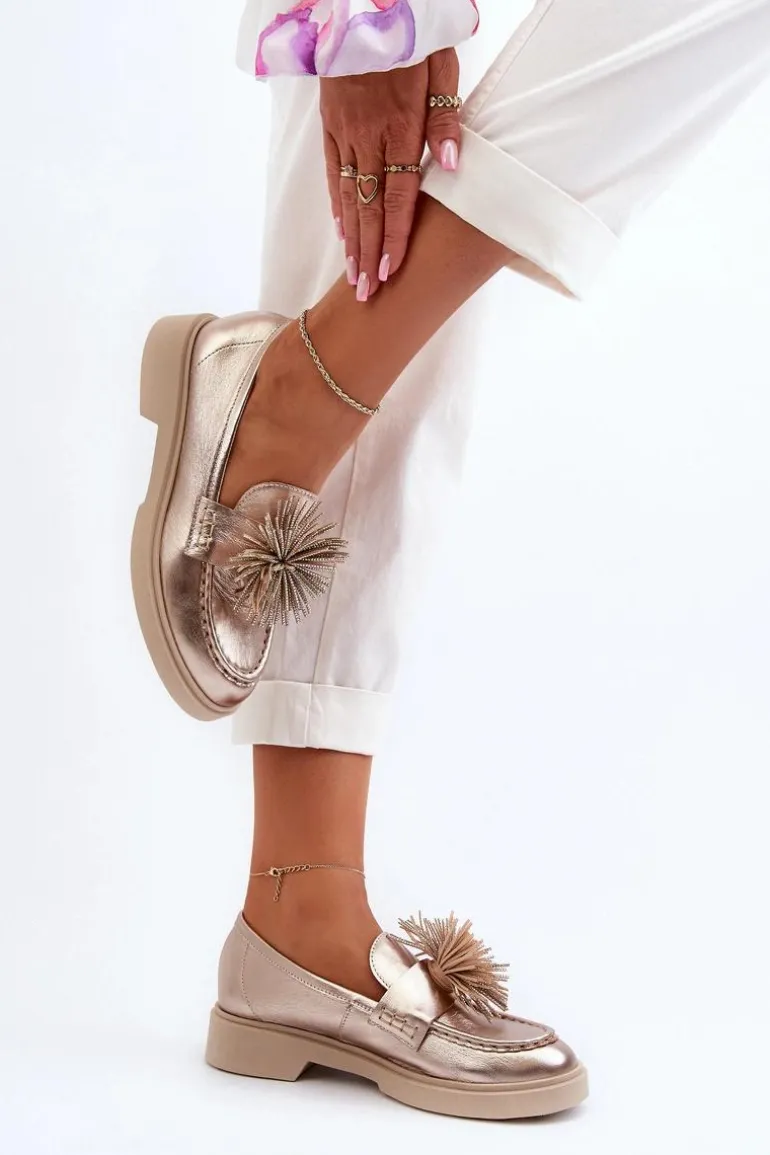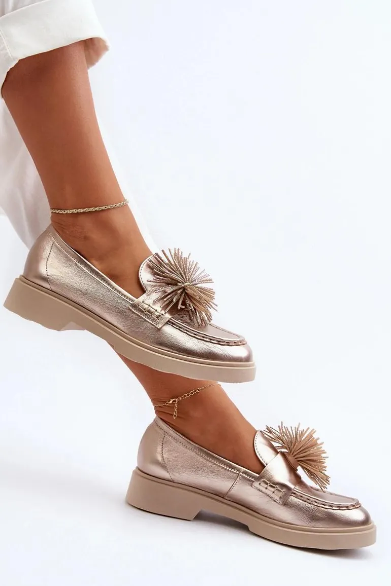 Piękne damskie mokasyny wykonano z wysokiej jakości skóry naturalnej, gwarantując trwałość i komfort noszenia. Ich płaski, masywny obcas zapewnia stabilność i wygodę. Skórzana wkładka dodatkowo podnosi komfort noszenia, zapewniając miękkość i wsparcie dla stóp. Ozdoba na pasku nadaje subtelny, elegancki akcent, który doskonale uzupełnia codzienne stylizacje, sprawiając, że są one nie tylko wygodne, ale także stylowe i uniwersalne. Przy wyborze rozmiaru prosimy sugerować się tabelą rozmiarów.