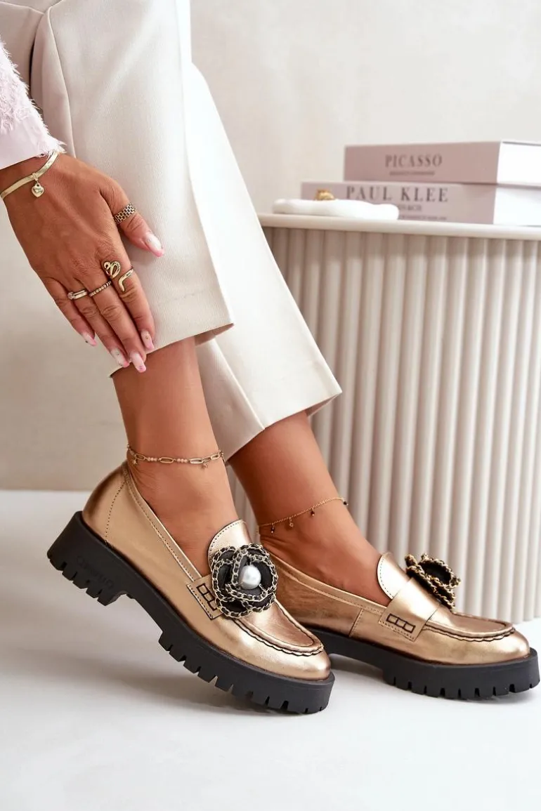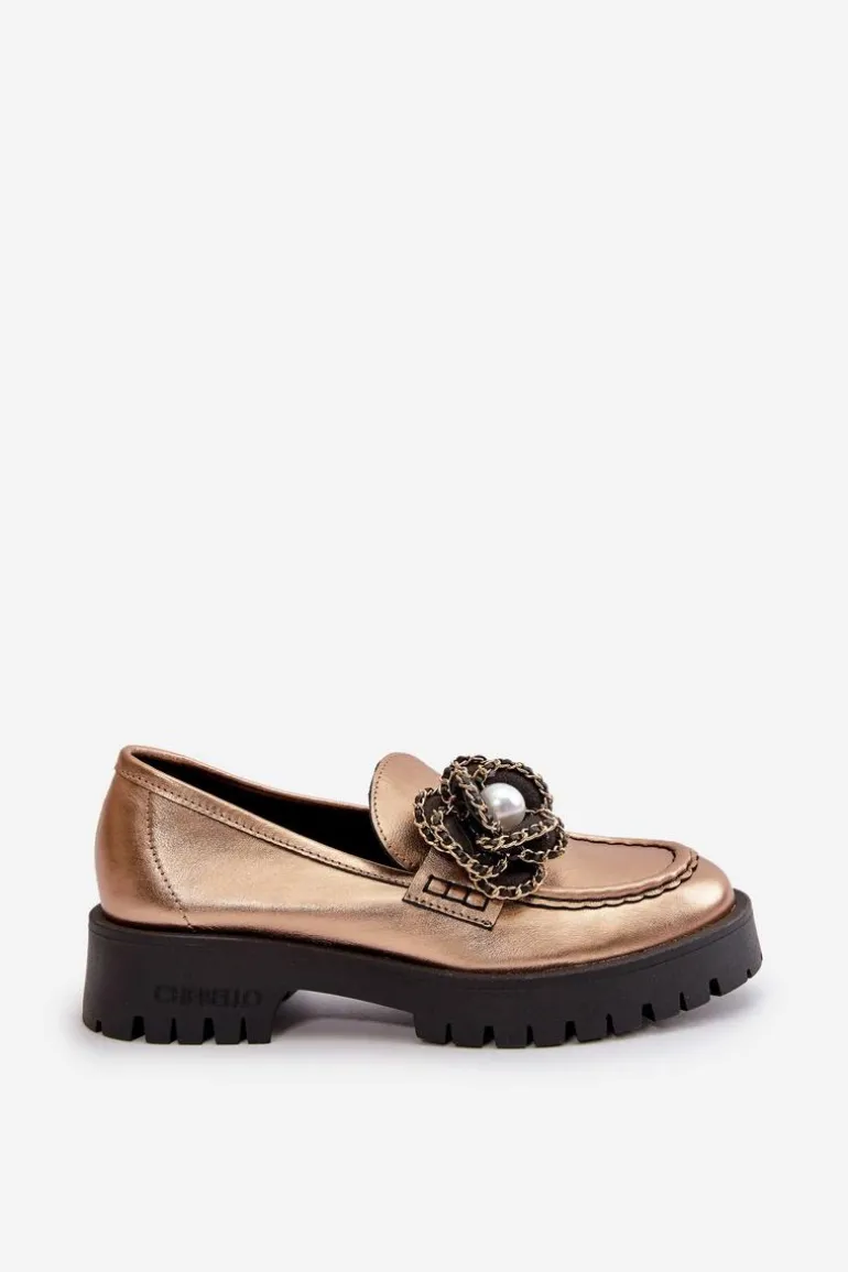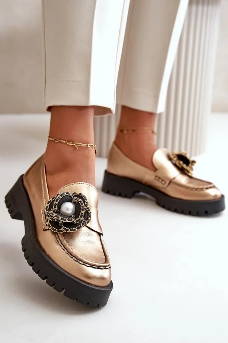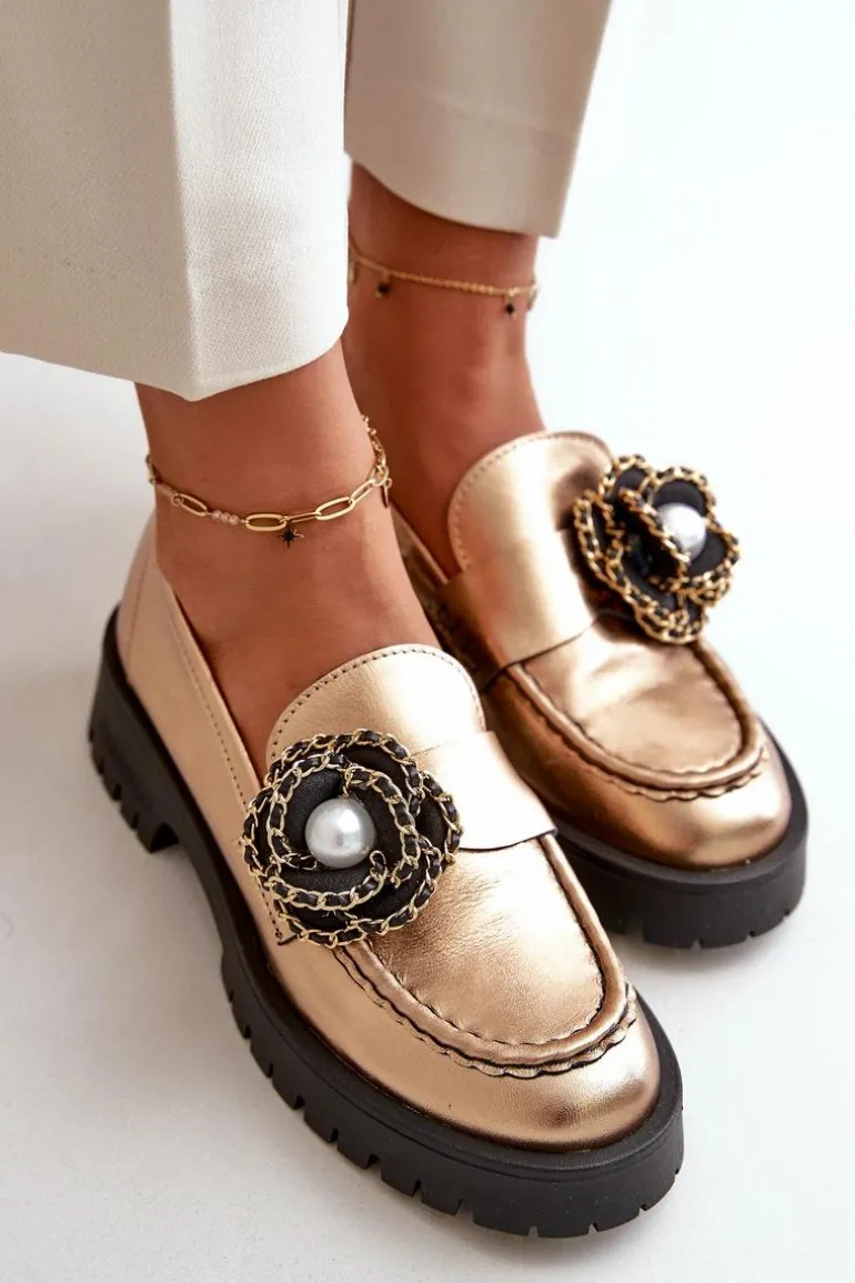 Śliczne damskie mokasyny wykonano z wysokiej jakości skóry naturalnej, gwarantując trwałość i komfort noszenia. Płaski obcas i platforma zapewniają stabilność i wygodę. Skórzana wkładka dodatkowo podnosi komfort noszenia. Ozdobny kwiatek na pasku nadaje subtelny akcent. Model ten doskonale uzupełni wiele stylizacji! Przy wyborze rozmiaru prosimy sugerować się tabelą rozmiarów.