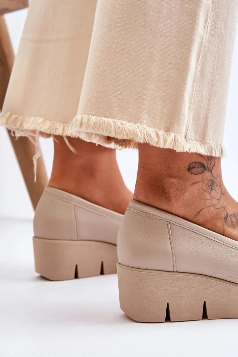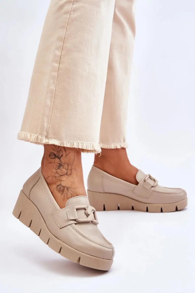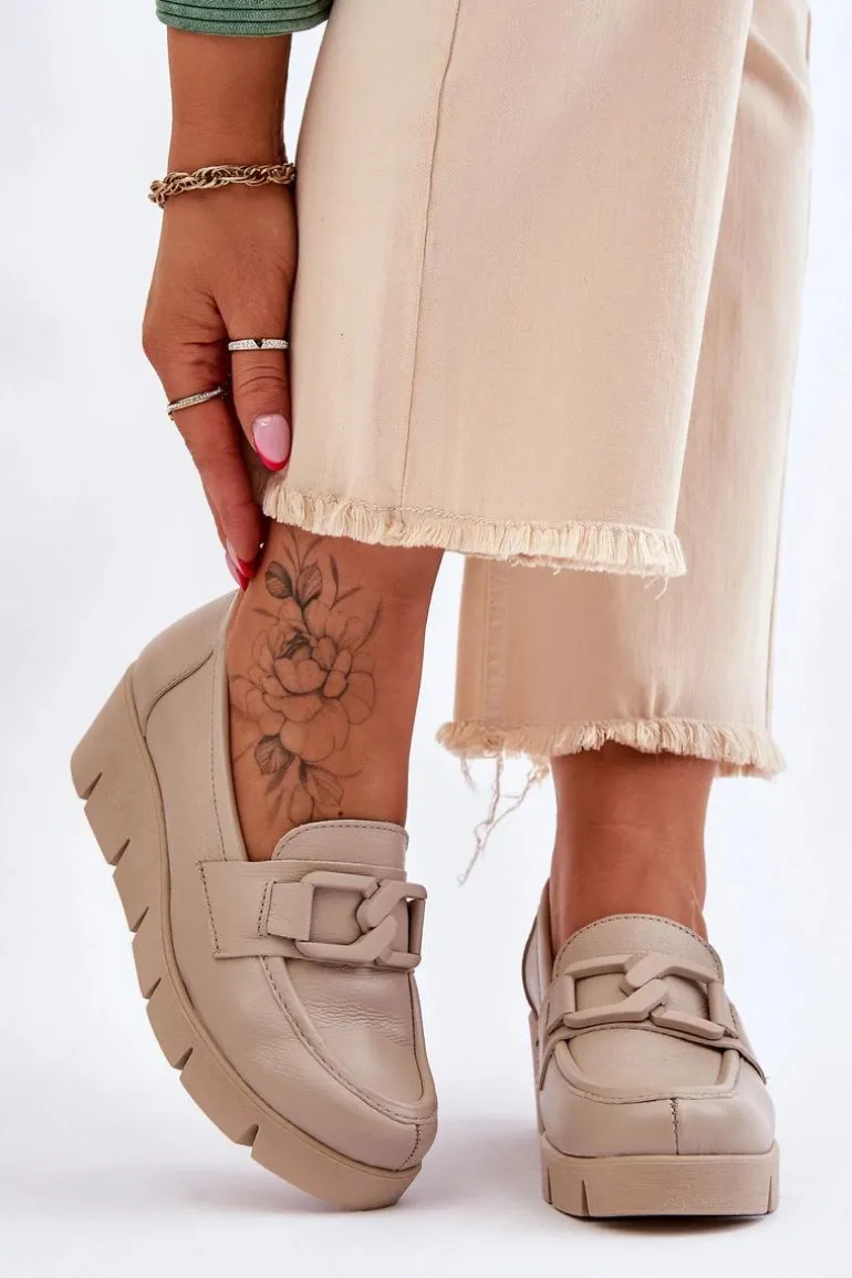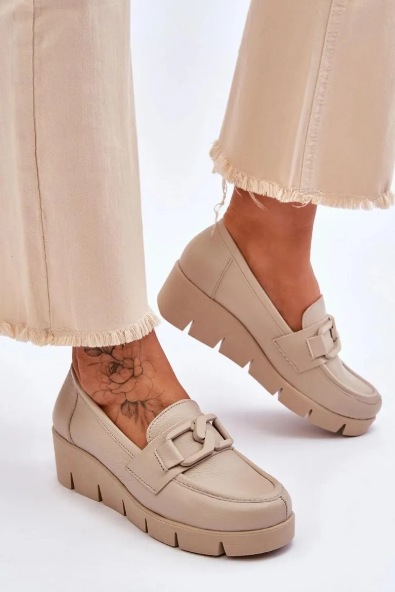 Wygodne mokasyny damskie zostały wykonane z naturalnej skóry. Posiadają ozdobę na przodzie cholewki. Zapiętek w tych butach został usztywniony, co pozwoli na odpowiednią stabilizację stopy. Mokasyny są osadzone na koturnie oraz platformie. Świetny model do wielu stylizacji! Przy wyborze rozmiaru prosimy sugerować się tabelą rozmiarów.