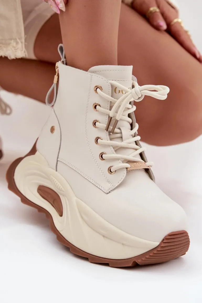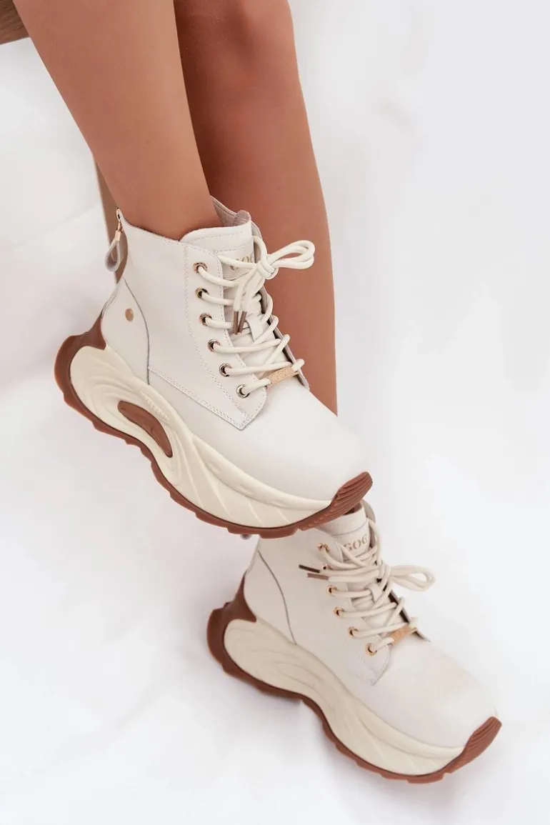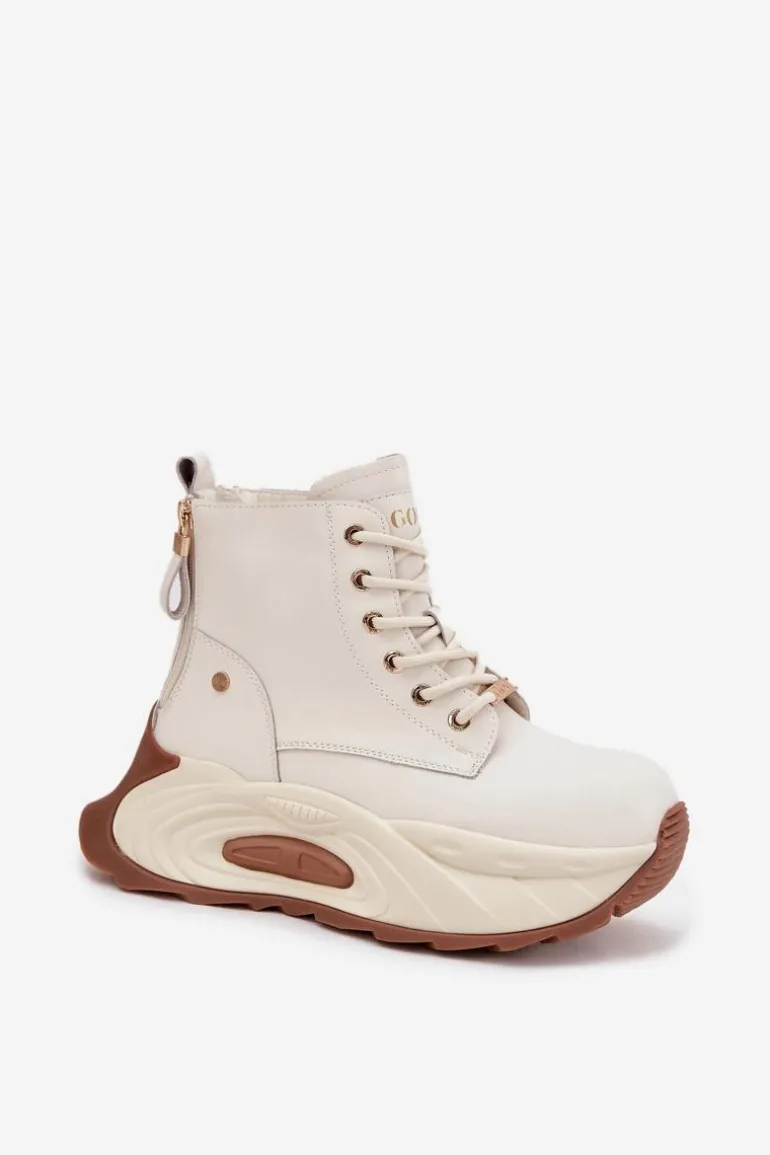 Botki damskie GOE to propozycja dla kobiet, które cenią nowoczesny styl i wygodę. Wykonane z wysokiej jakości naturalnej skóry, prezentują się elegancko i są wyjątkowo trwałe. Osadzone na masywnej platformie, dodają sylwetce charakteru i świetnie wpisują się w aktualne trendy. Model jest sznurowany, a dodatkowo posiada dwa suwaki z tyłu po bokach, co ułatwia zakładanie i podkreśla jego oryginalny design. To idealne buty na co dzień, które doskonale dopełnią zarówno casualowe, jak i bardziej wyraziste stylizacje. Przy wyborze rozmiaru prosimy kierować się tabelą rozmiarów