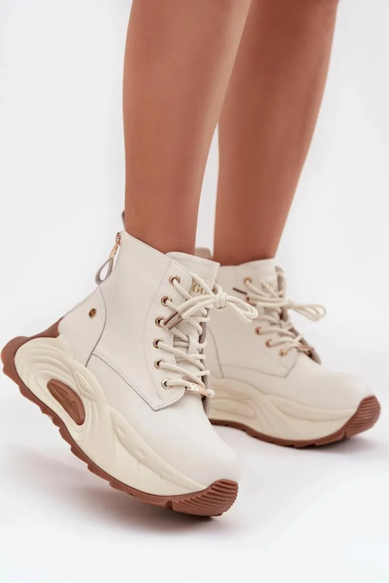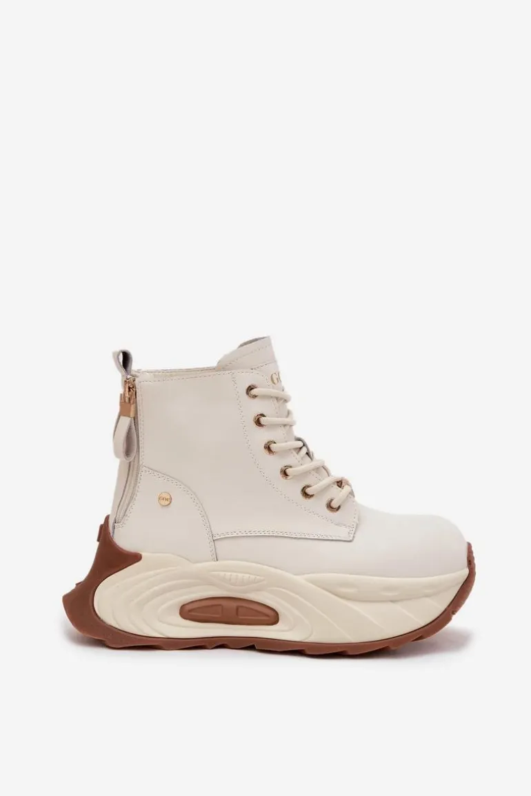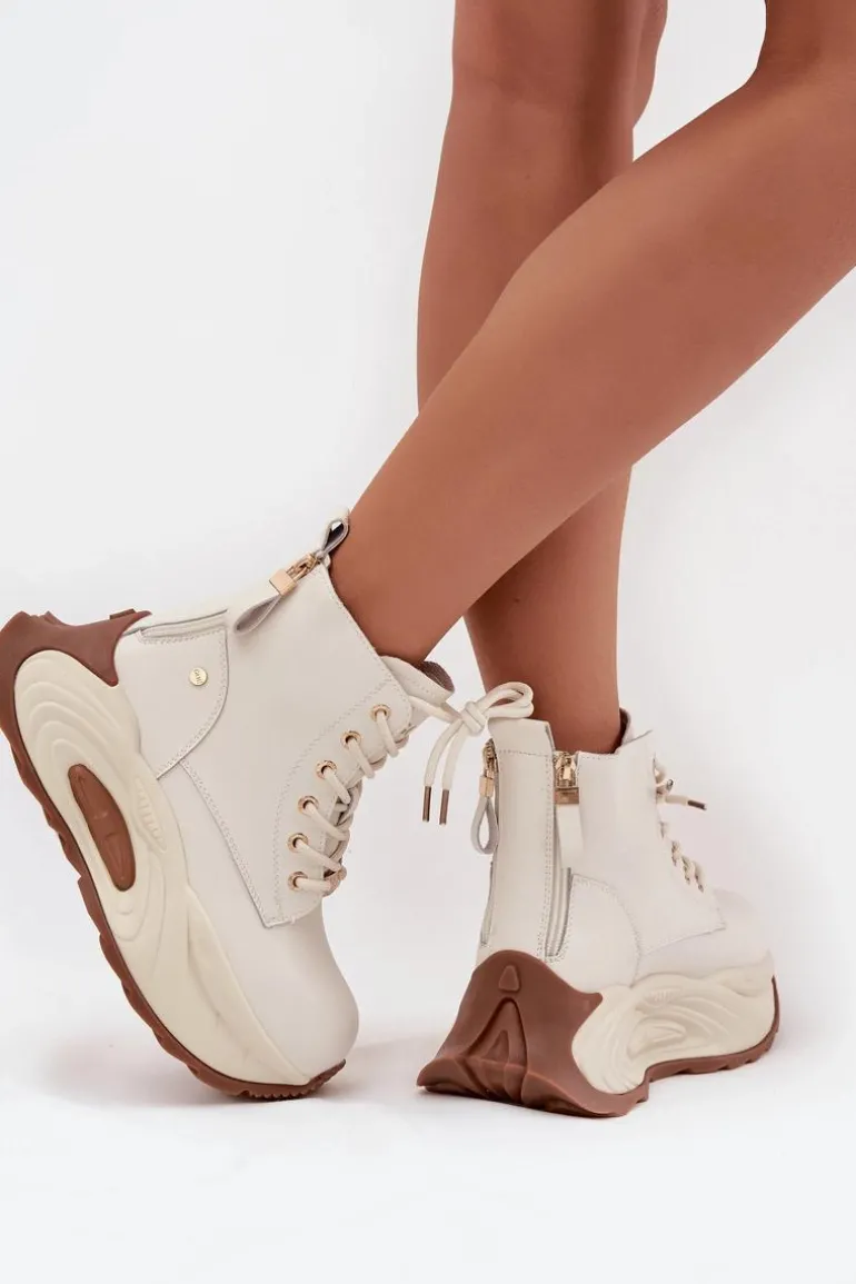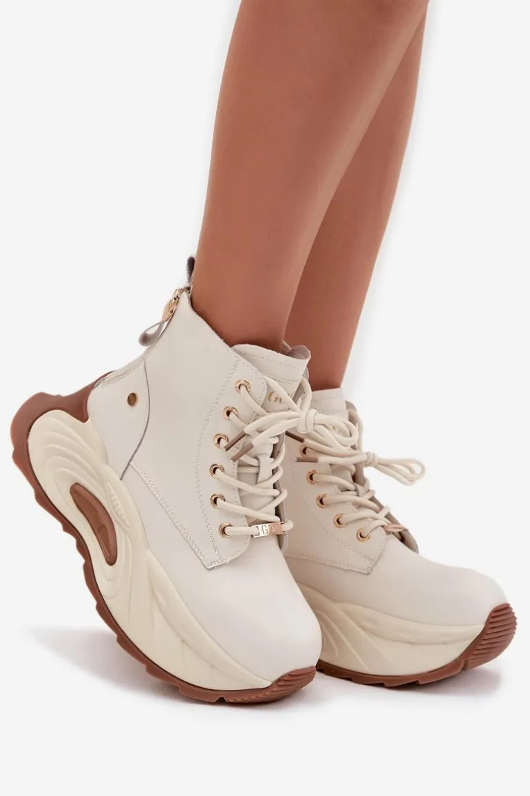 Botki damskie GOE to propozycja dla kobiet, które cenią nowoczesny styl i wygodę. Wykonane z wysokiej jakości naturalnej skóry, prezentują się elegancko i są wyjątkowo trwałe. Osadzone na masywnej platformie, dodają sylwetce charakteru i świetnie wpisują się w aktualne trendy. Model jest sznurowany, a dodatkowo posiada dwa suwaki z tyłu po bokach, co ułatwia zakładanie i podkreśla jego oryginalny design. To idealne buty na co dzień, które doskonale dopełnią zarówno casualowe, jak i bardziej wyraziste stylizacje. Przy wyborze rozmiaru prosimy kierować się tabelą rozmiarów