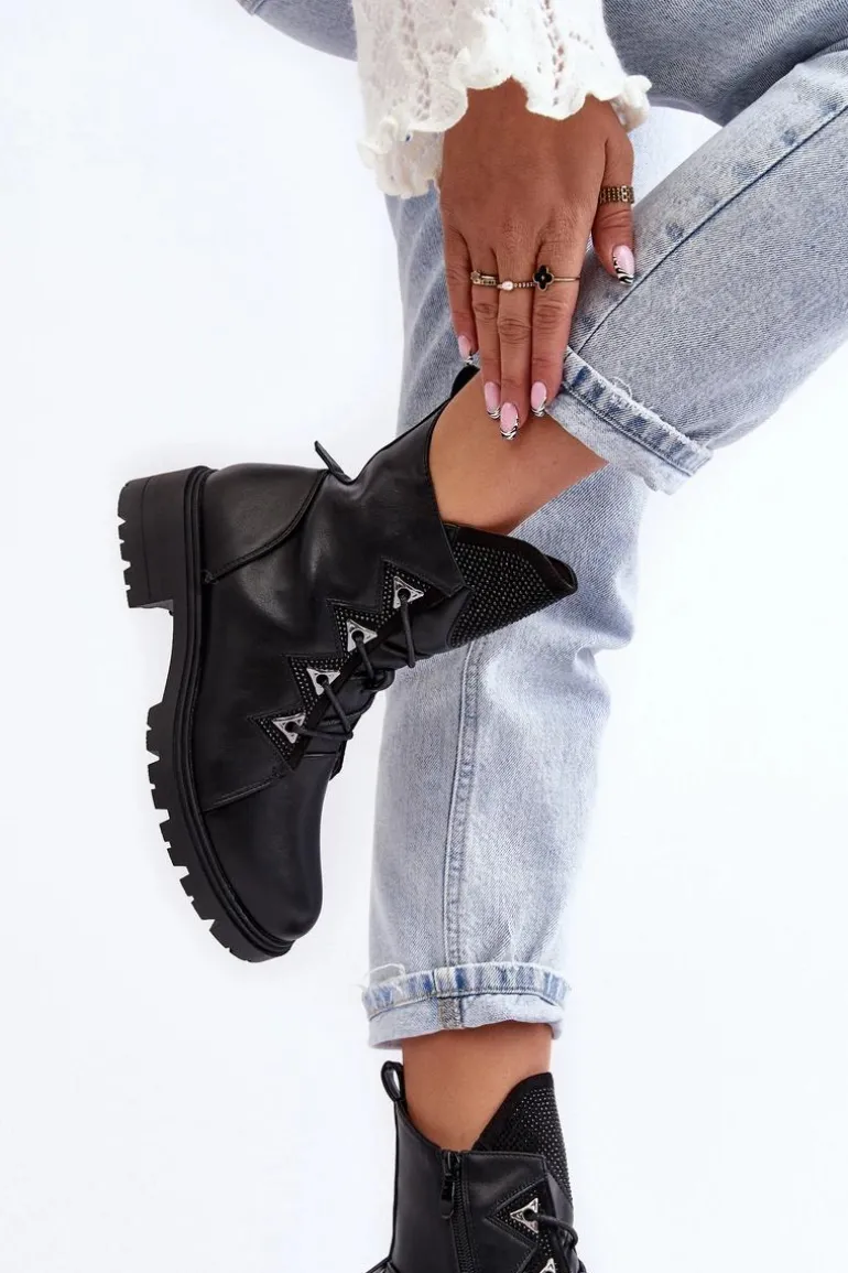 Botki damskie to idealny wybór na przejściowy sezon. Te botki zostały wykonane z lakierowanej eko skóry. Posiadają dżety przy sznurowadłach i na języku. Dodatkowo zapiętek jest usztywniany. Model ten posiada ocieplenie w postaci koca obuwniczego. Botki osadzone na płaskim obcasie i platformie ze żłobieniami. Ten model powinien być Twój! Przy wyborze rozmiaru prosimy sugerować się tabelą rozmiarów.