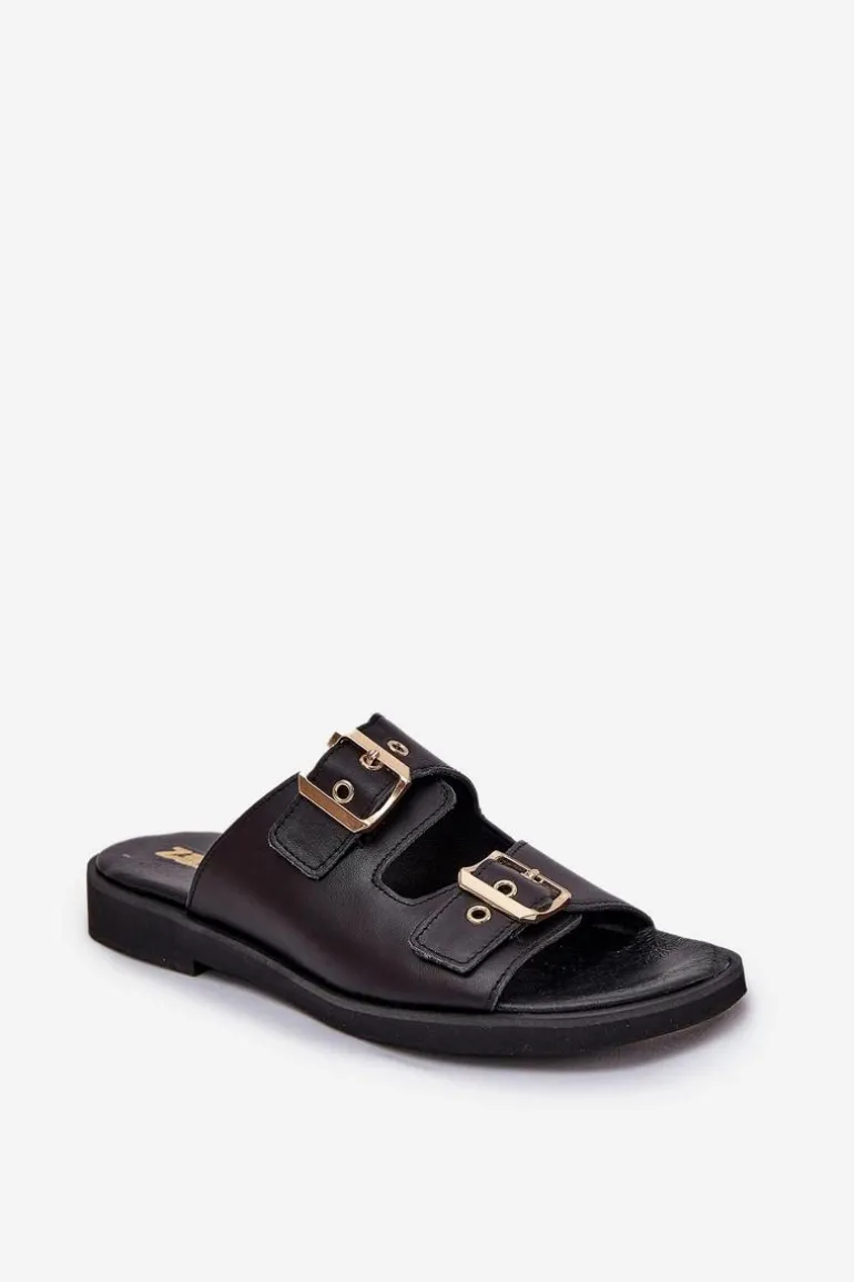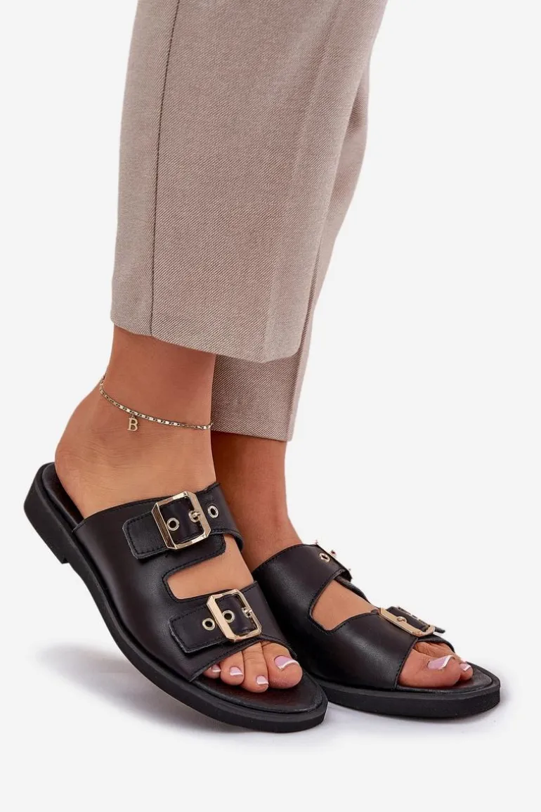 Skórzane klapki damskie na płaskim obcasie to elegancka propozycja, która łączy komfort z nowoczesnym stylem. Posiadają dwie złote klamry z regulowanymi paskami, które nie tylko zapewniają idealne dopasowanie do stopy, ale również stanowią modny akcent, dodający subtelnego blasku. Dzięki płaskiemu obcasowi klapki te są wygodne i stabilne, idealne na co dzień, zarówno do casualowych, jak i bardziej eleganckich stylizacji. Skórzana cholewka gwarantuje trwałość i komfort, sprawiając, że te klapki będą doskonałym wyborem na upalne dni. Przy wyborze rozmiaru prosimy sugerować się tabelą rozmiarów.