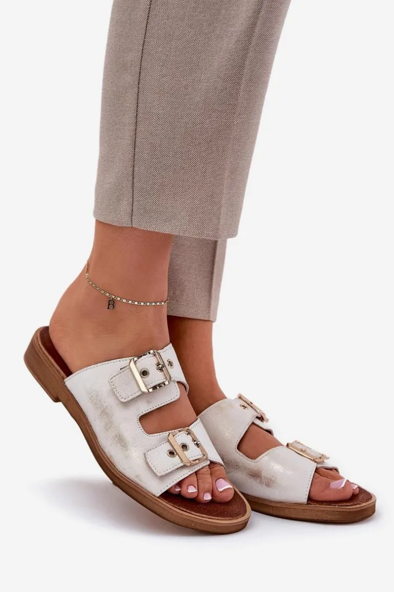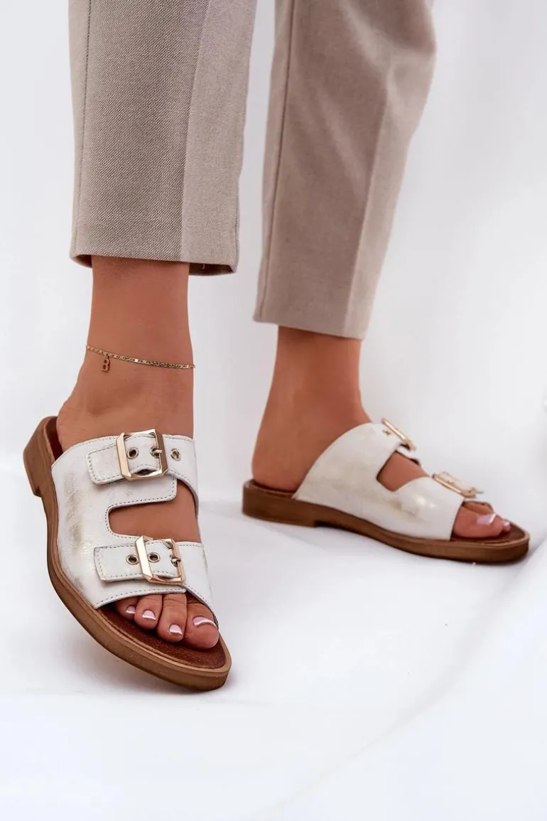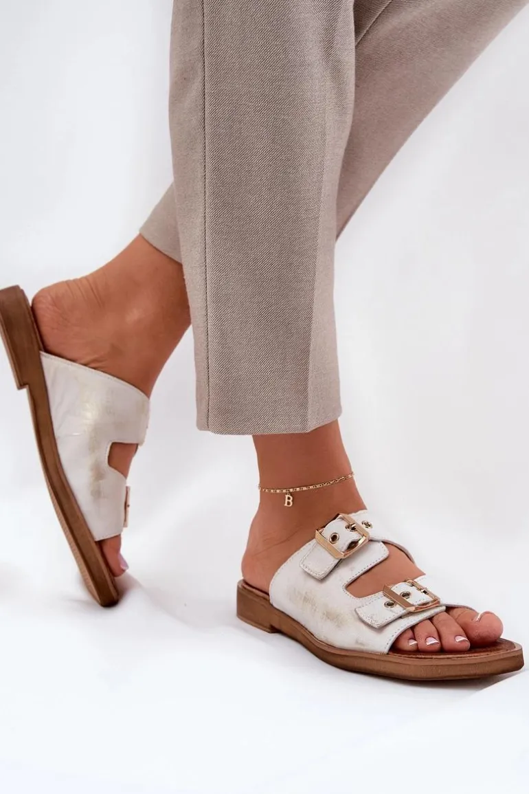 Skórzane Płaskie Klapki Z Klamrami Zazoo 3020 Złoty Przecierany