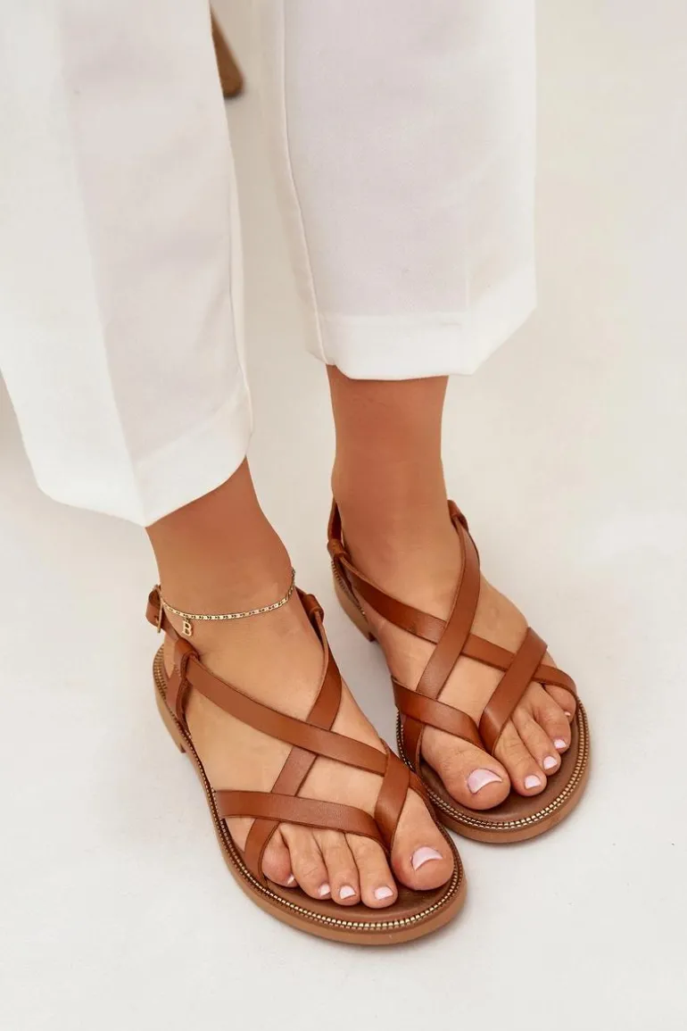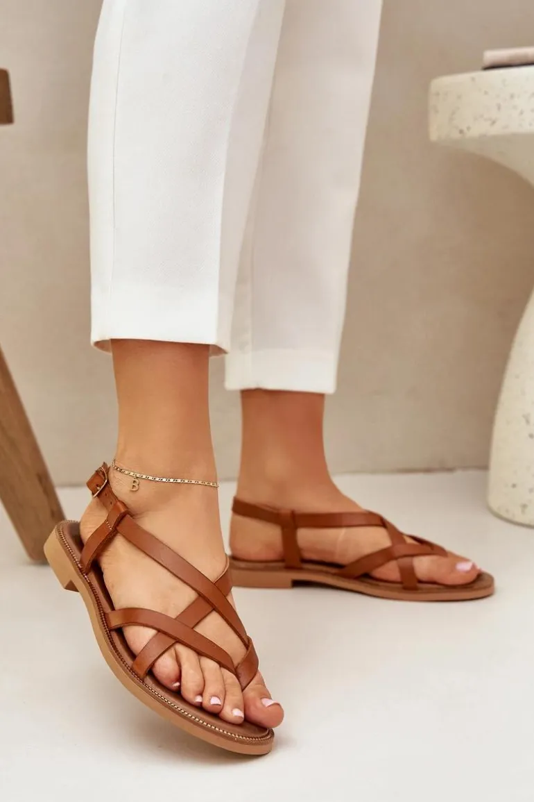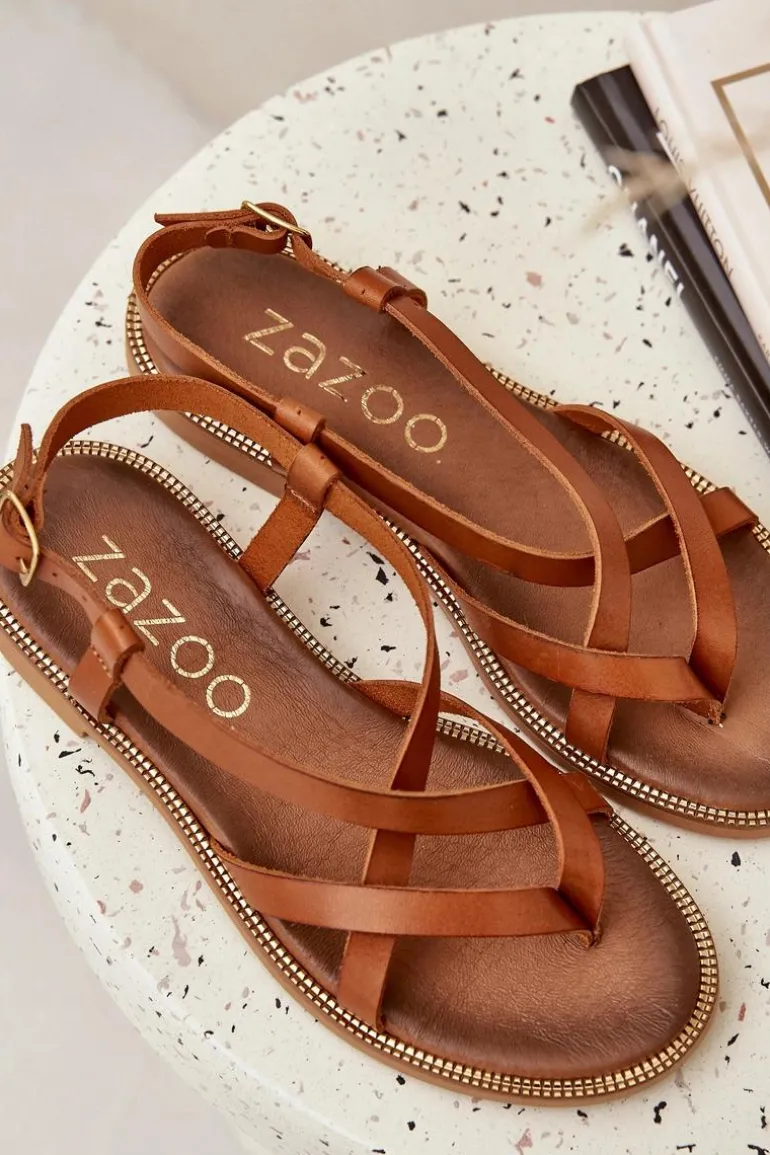 Skórzane Płaskie Sandały Z Przeplatającymi Się Paseczkami Zazoo 40429 Brązowe