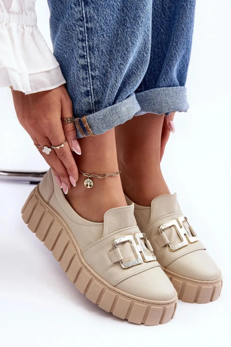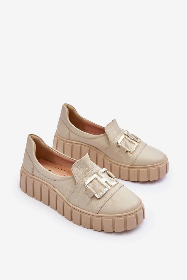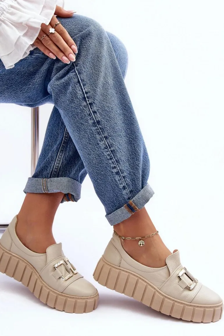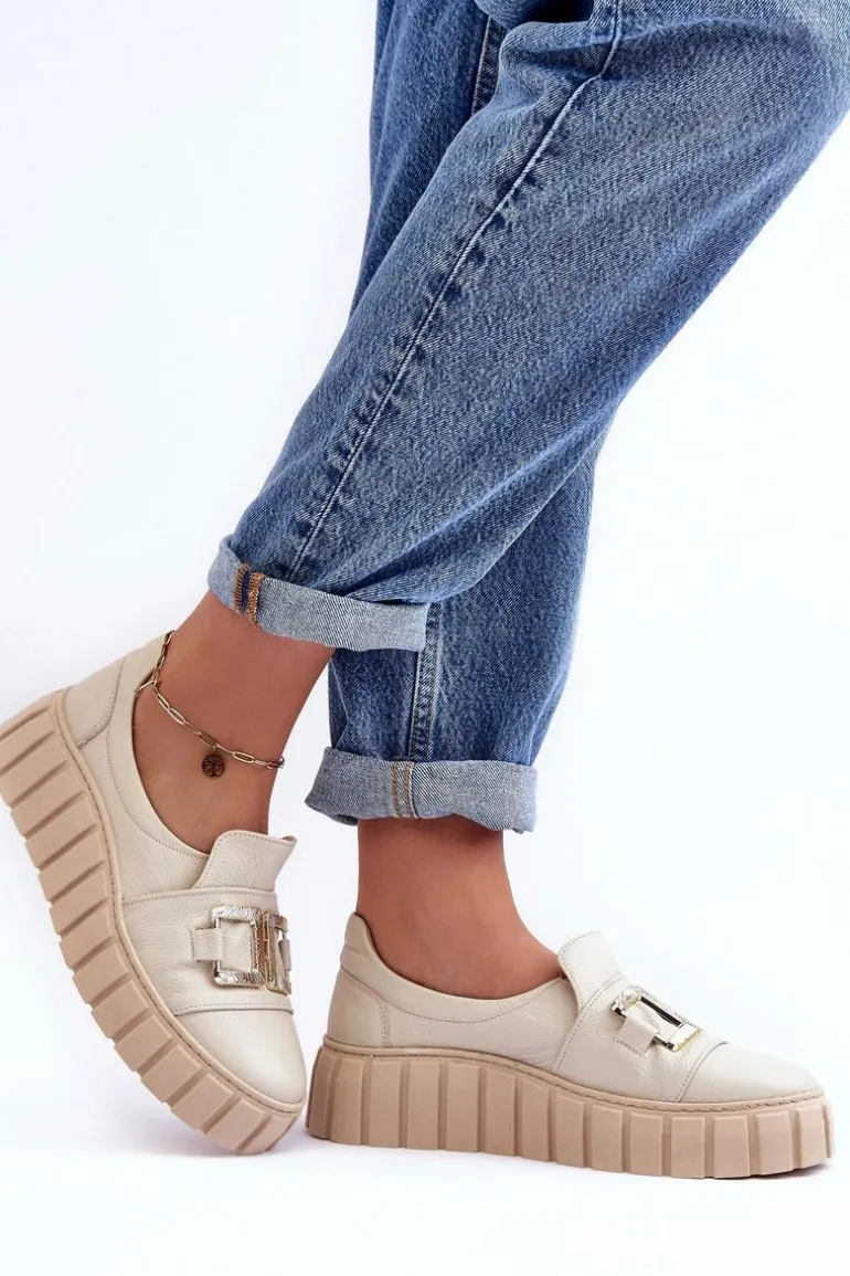 Skórzane Półbuty Damskie Na Platformie Beżowe Lewski 3398